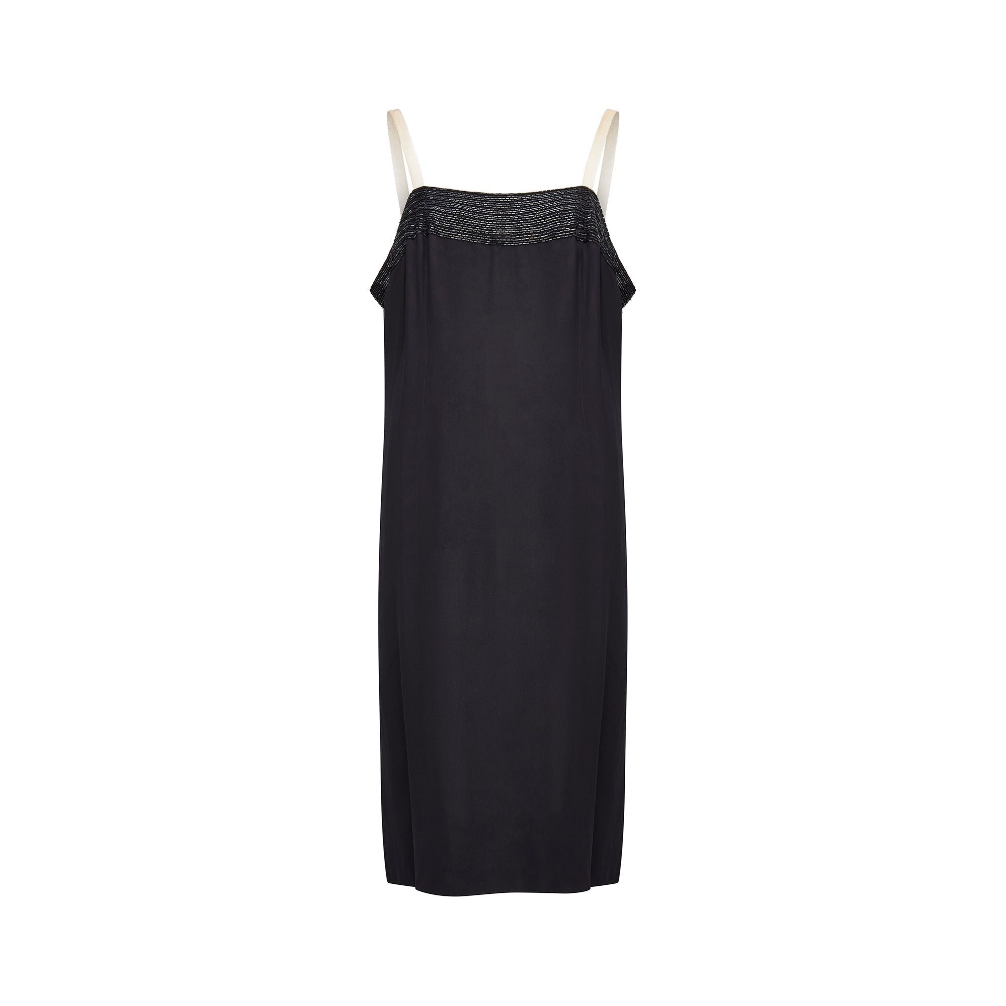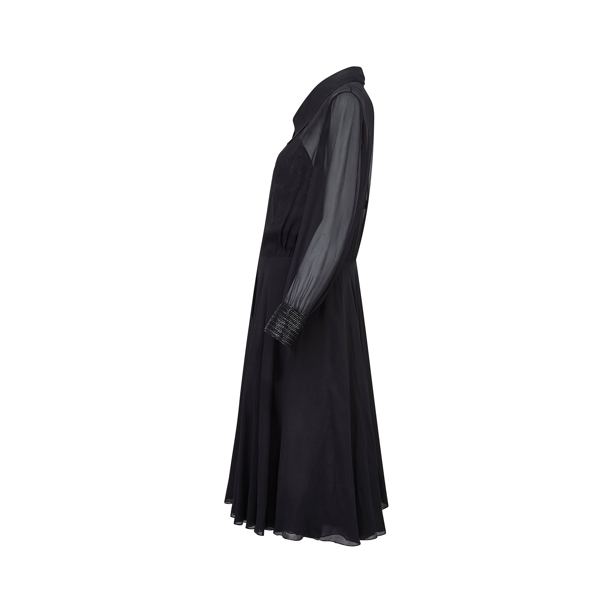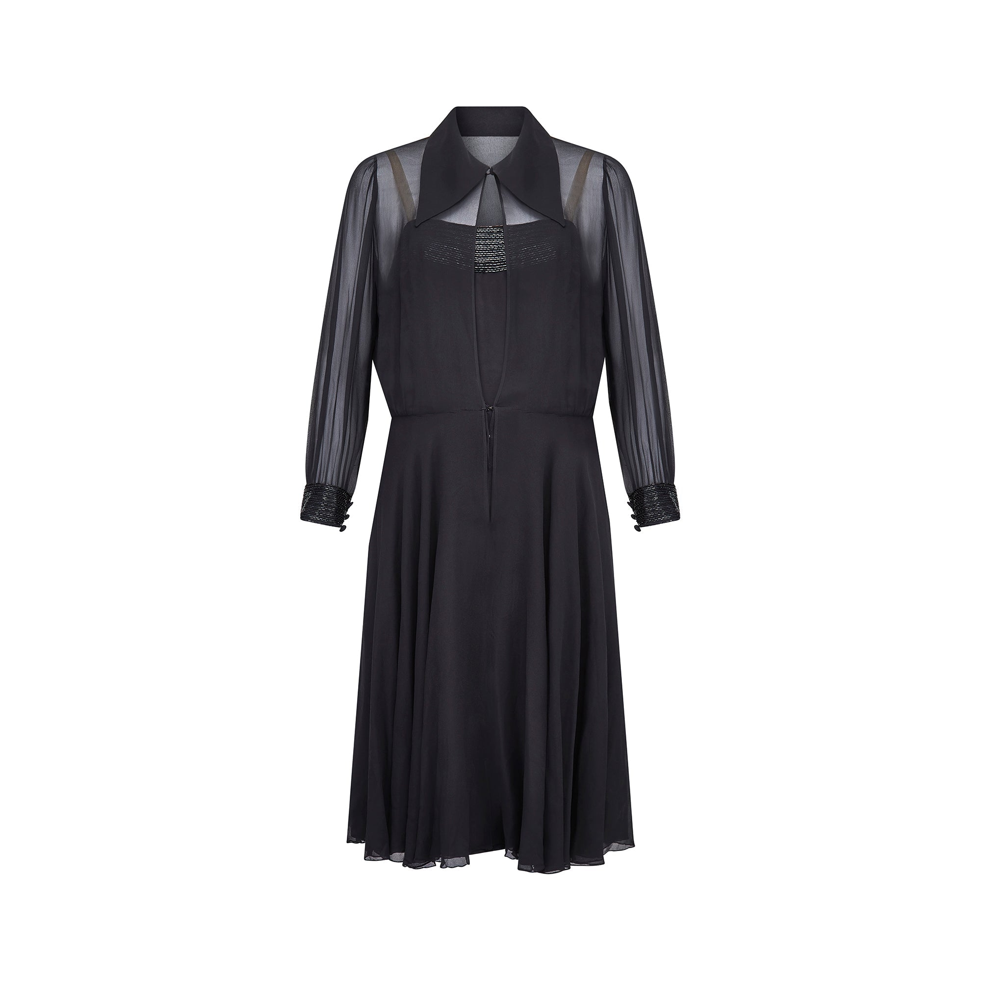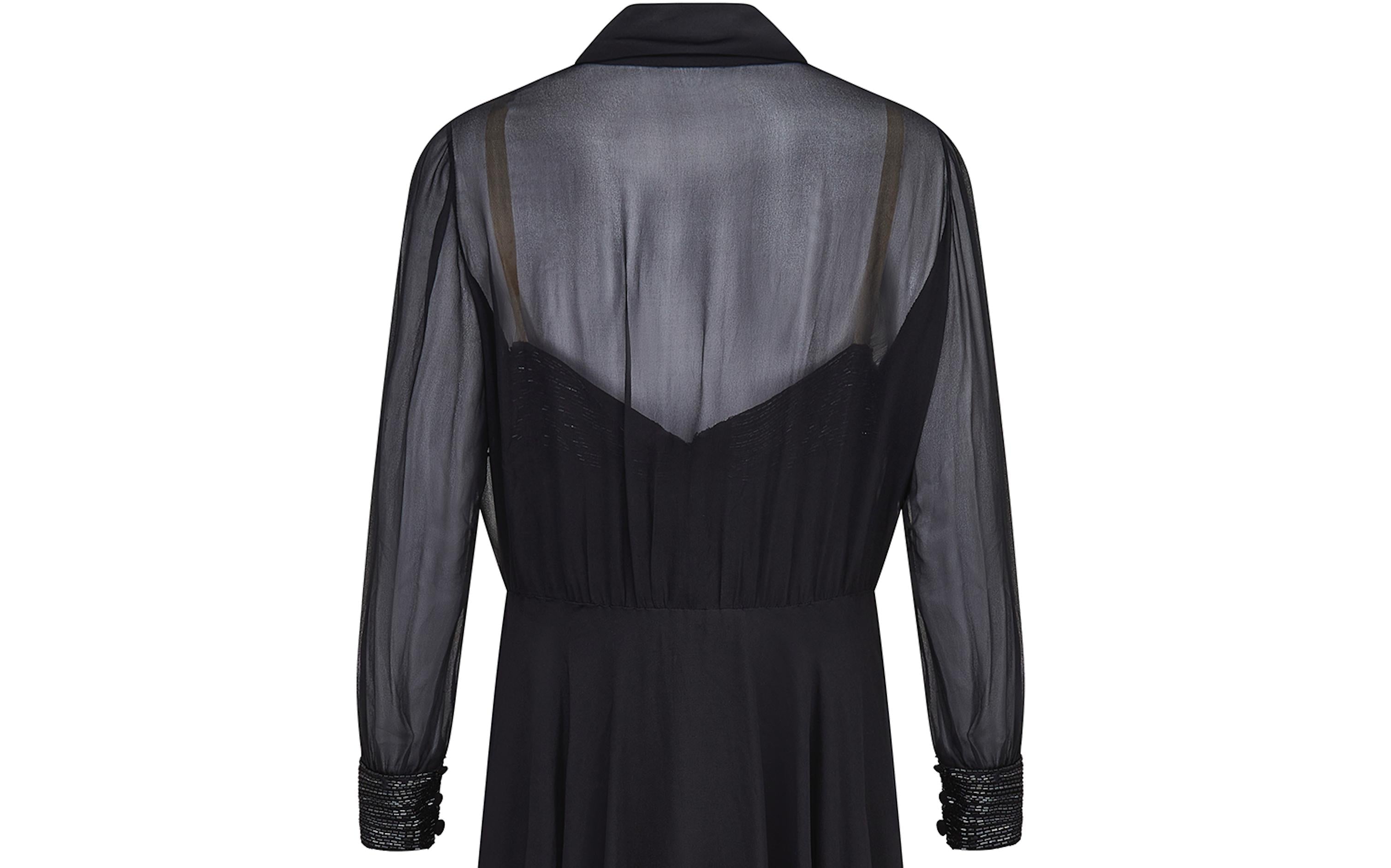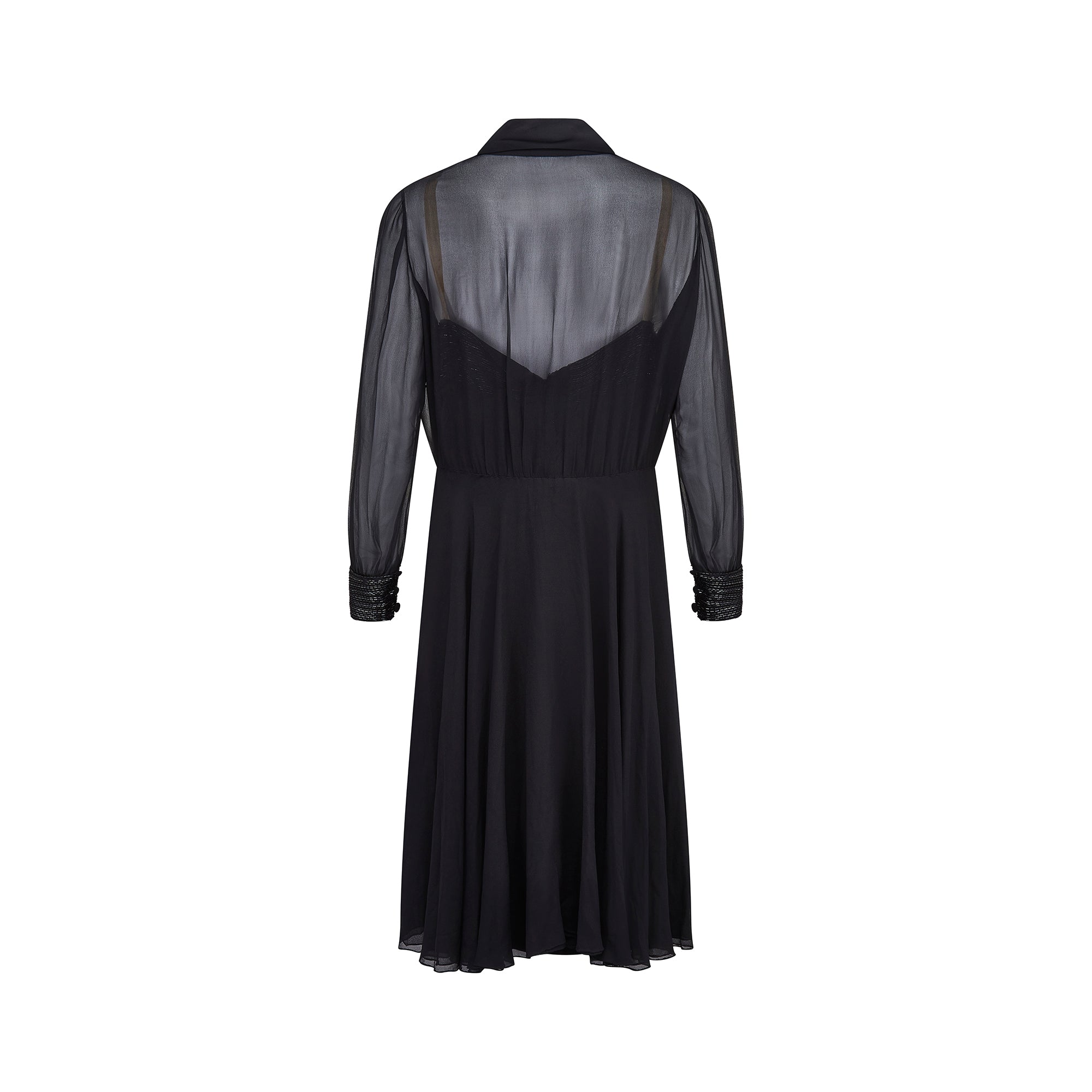 Designed by Jacqueline Godard in the late 1960s or early 1970s this elegant ensemble is formed of a slip dress and sheer, shirt-dress style top layer. Crafted from black finest silk chiffon, the pretty shirt layer has beaded cuffs, a double-layered skirt, a dramatic dagger collar and an open front from the waist up - cannily designed to reveal the beadwork on the slip underneath. The slip dress is tailored to a straight, loose silhouette which recalls ‘20s shapes and finished with delicate, pale mesh straps and a concealed zip at the rear. From the fabric-covered buttons at the sleeves to the intricate beading, this dress was fashioned from expert, haute couture trained hands in France. Would look good paired with a belt for a low luxe vibe. In excellent vintage condition with no faults of any note. A good fit for up to a UK size 14-16 or US 10-12.