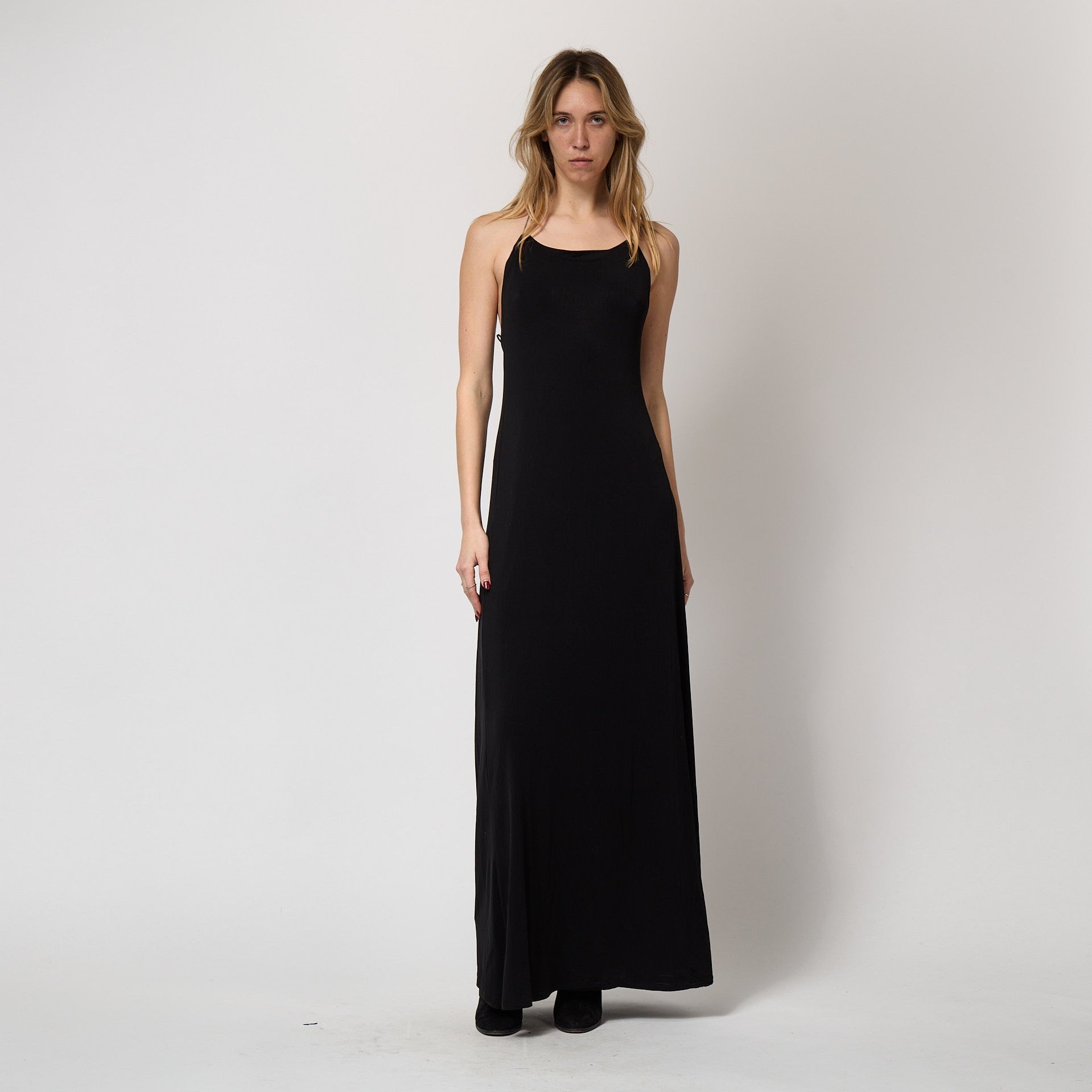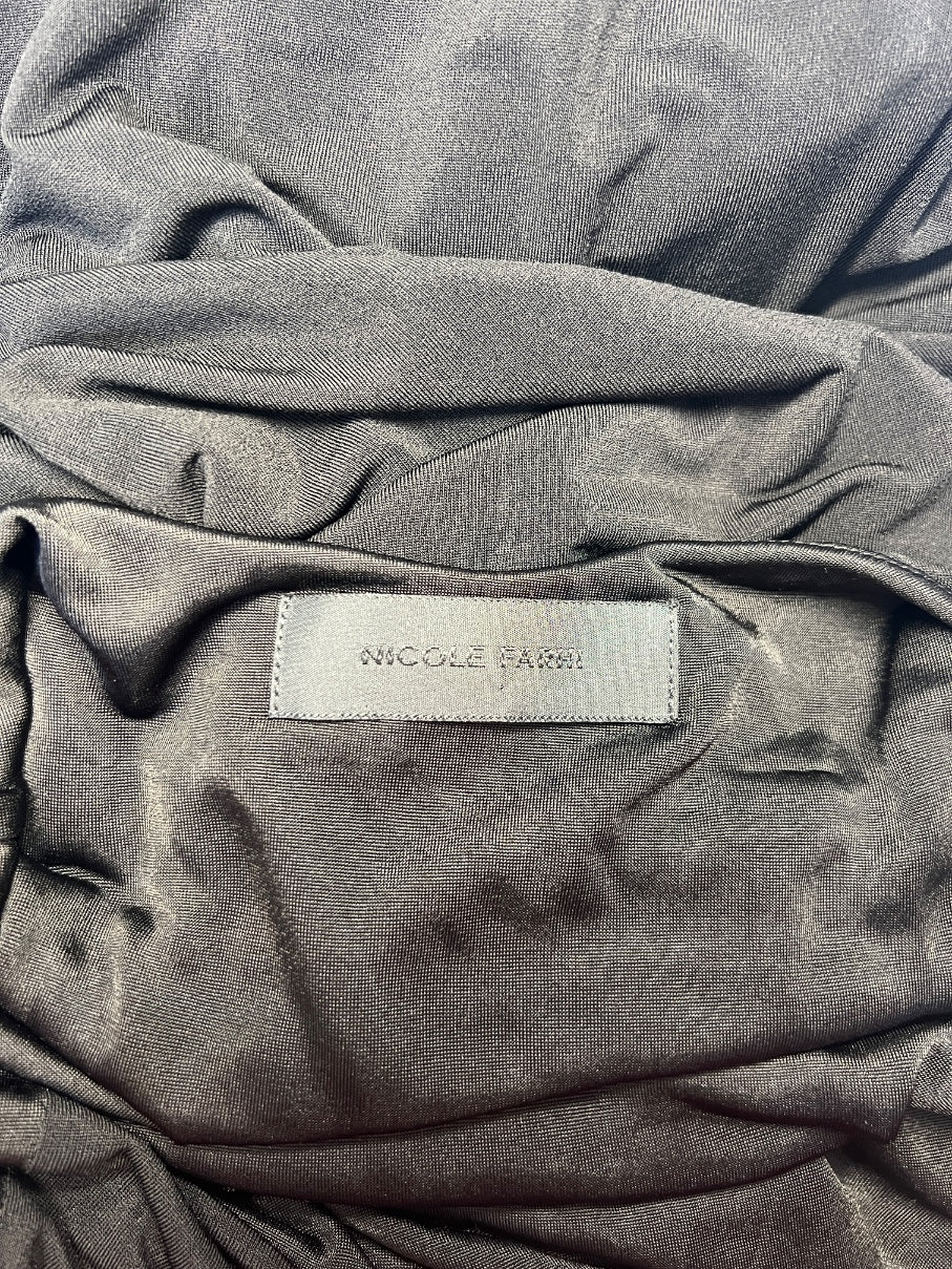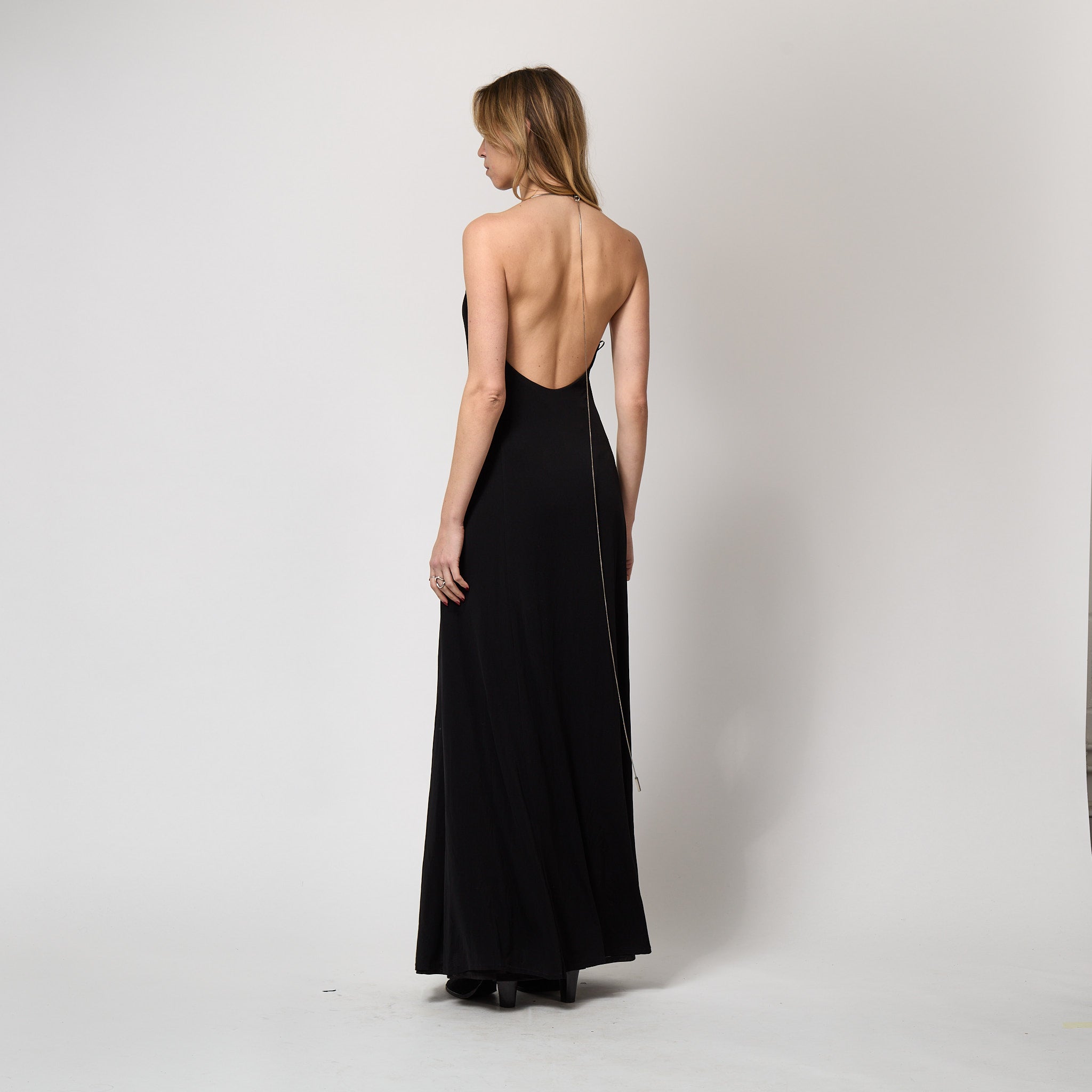 Made in the UK and designed by Nicole Fahri during the brand’s 1990s heyday, this floor-length slip dress is tailored from smooth inky black toned jersey. This elegant halter-neck piece exemplifies the brand’s signature understated-yet-luxurious style. The cowl-neckline is held in place by a silver snake chain that hangs over the shoulders and is weighted by a logo-debossed, silver-tone cuboid that was a Fahri trademark. The chain is fed through two silver eyelets at the neck and creates a gathered neckline. This dress is fully lined in a silky lightweight jersey.