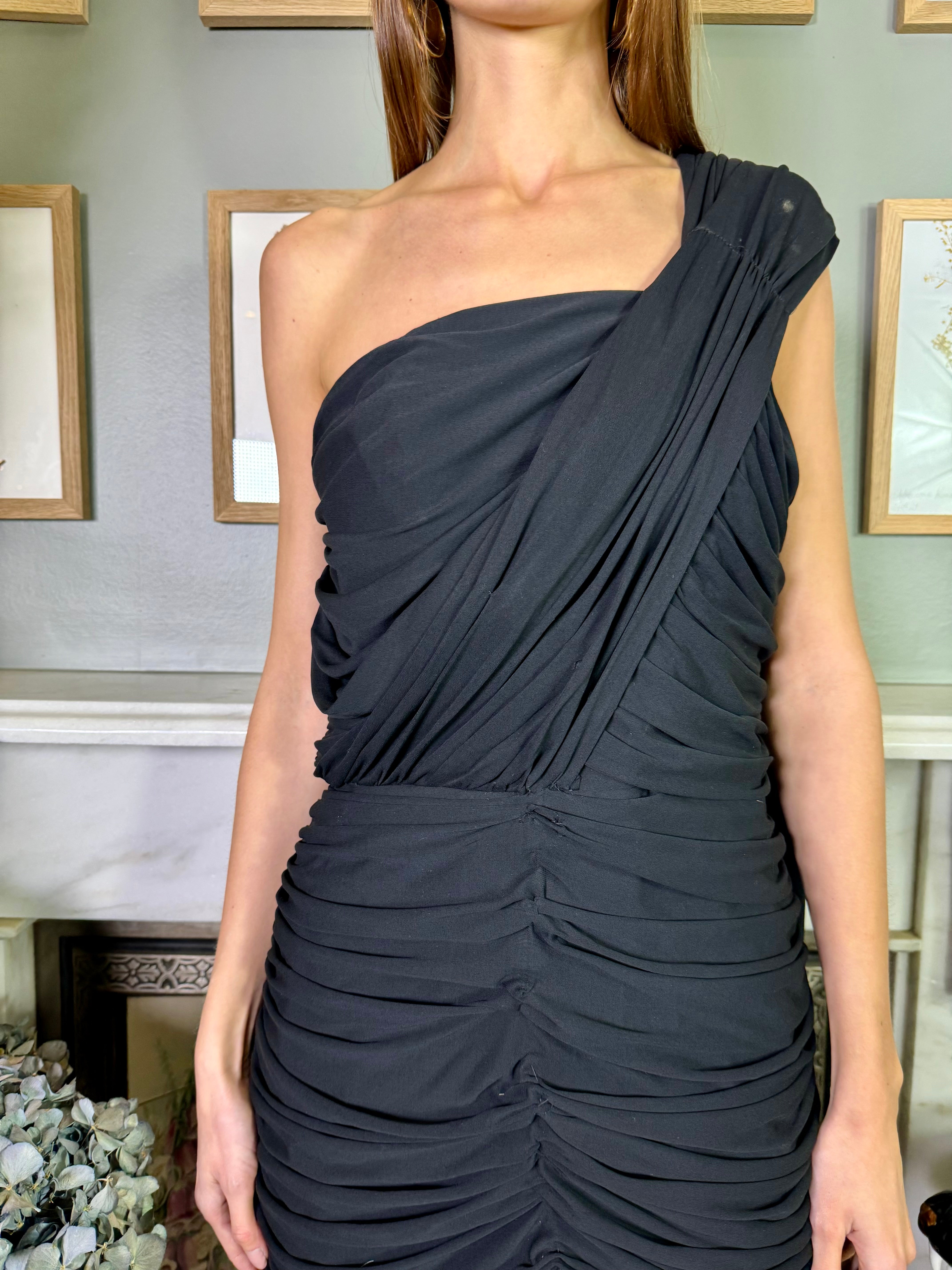 A bombshell of a dress, this is a 40s black draped dress in a soft silk jersey. Has one wide shoulder strap that wraps down the back and joins the hem. Zips on the back and has a flattering draped skirt that hugs the body. Also looks fab belted.