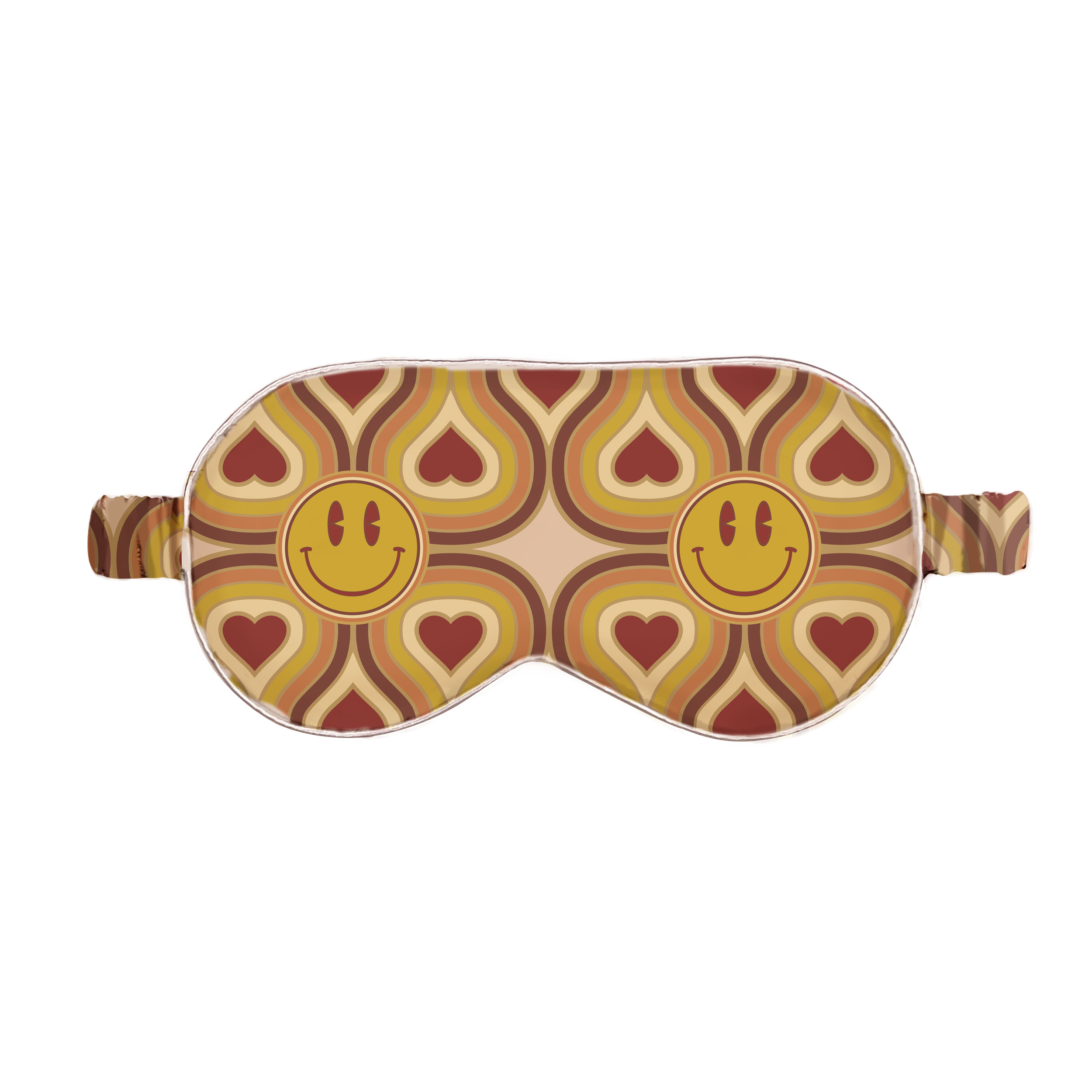 Luxe silk sleep mask made from silk 100 % silk charmeuse featuring double silk layer and organic cotton filing. Pattern features hearts and smileys in a vintage color palette. Printed with environmentally friendly inks..