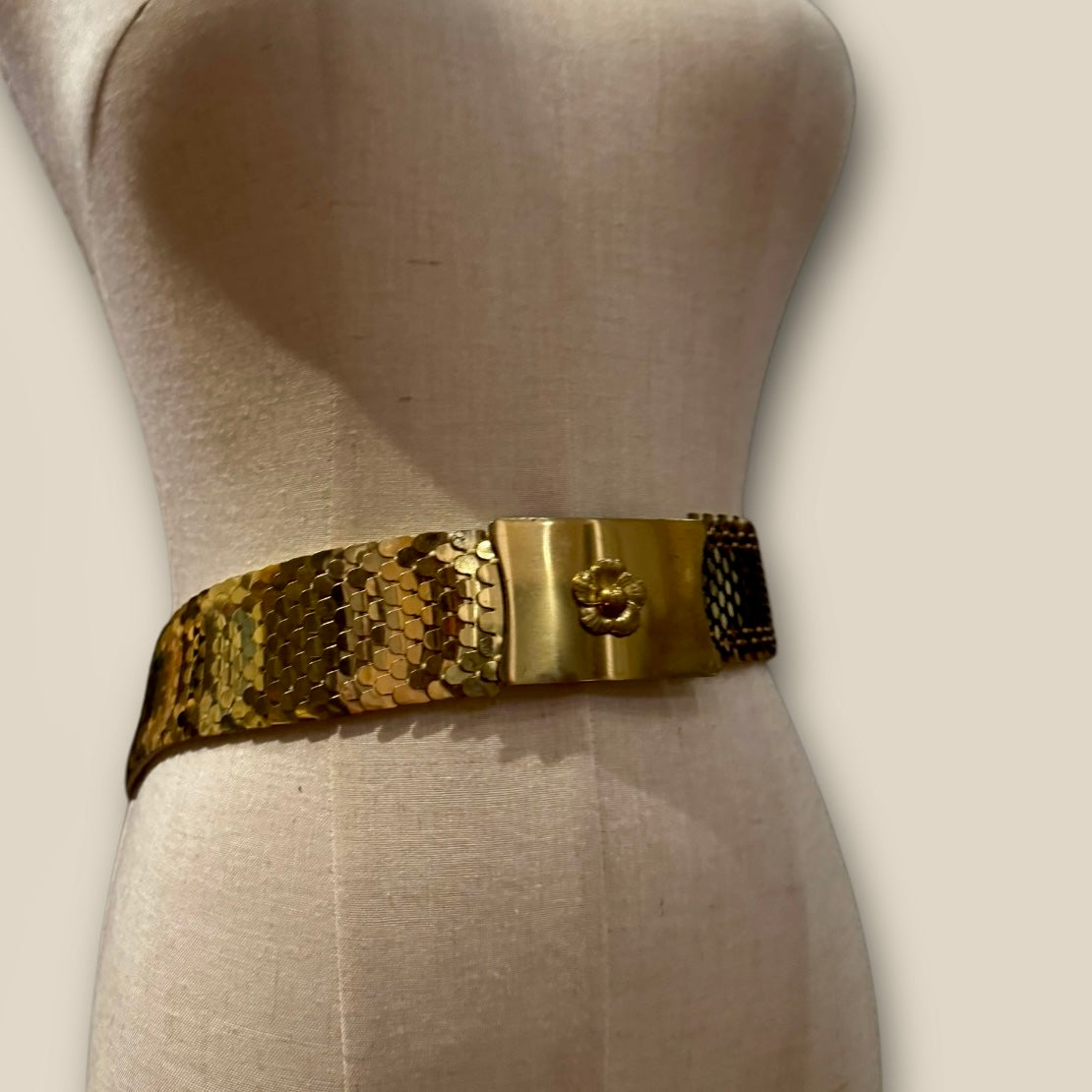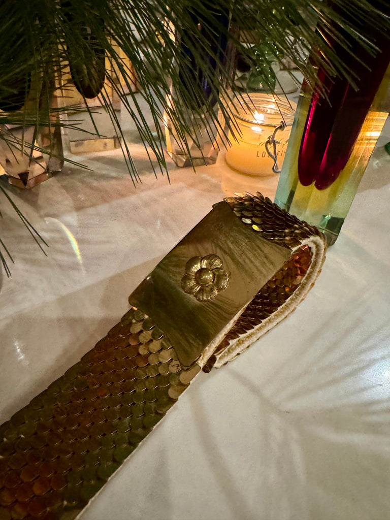 Add a touch of retro glamour to any outfit with this 70s fishscale elastic gold belt. The versatile design features a unique floral clasp and elasticated band for a comfortable fit. Elevate any outfit with this original 70s accessory.