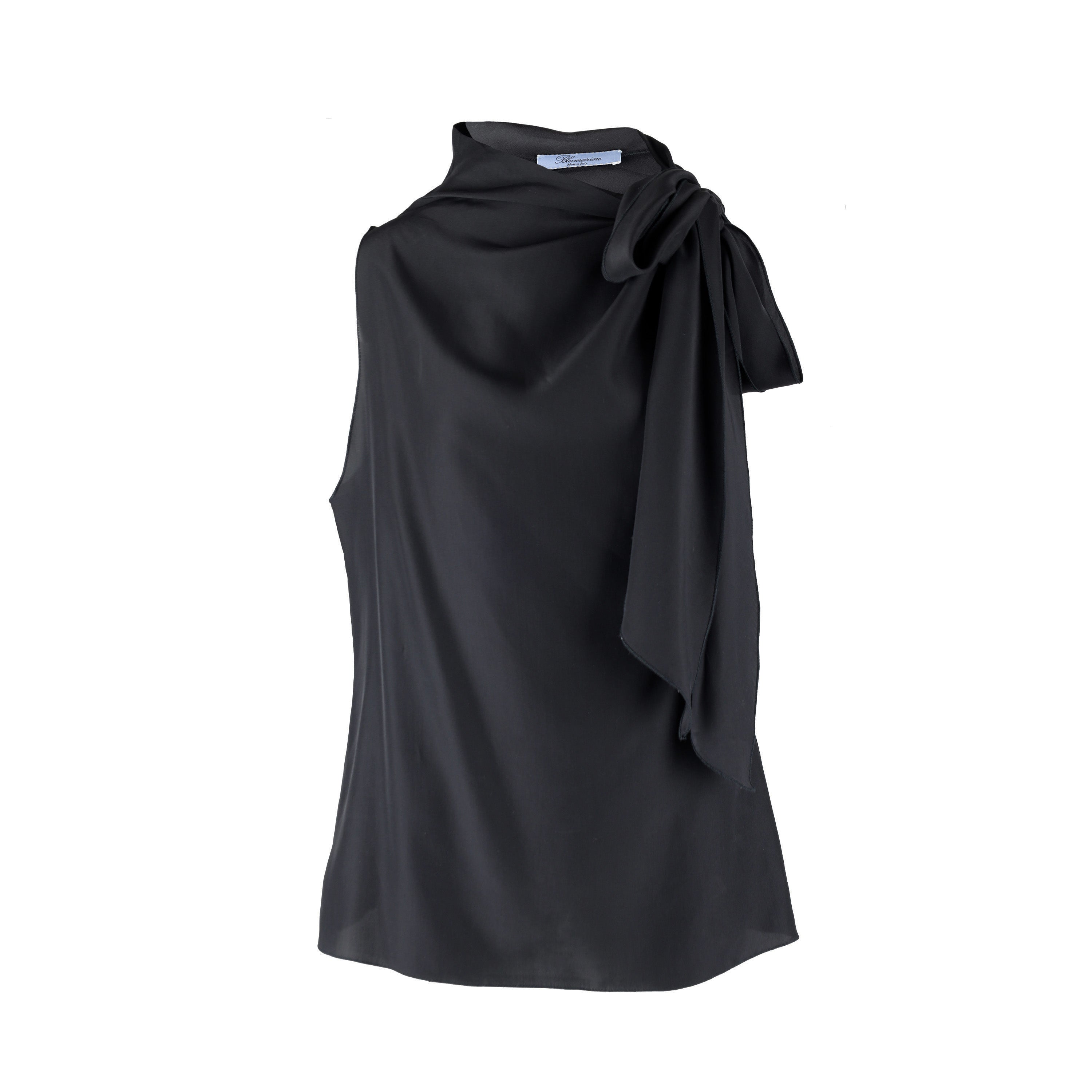 The Blumarine Tie-knot Top is crafted from luxurious silk for comfort and elegance. Its sleeveless design and boatneck provide a sleek look, with a long tie-knot panel at the neckline for a chic, modern update.