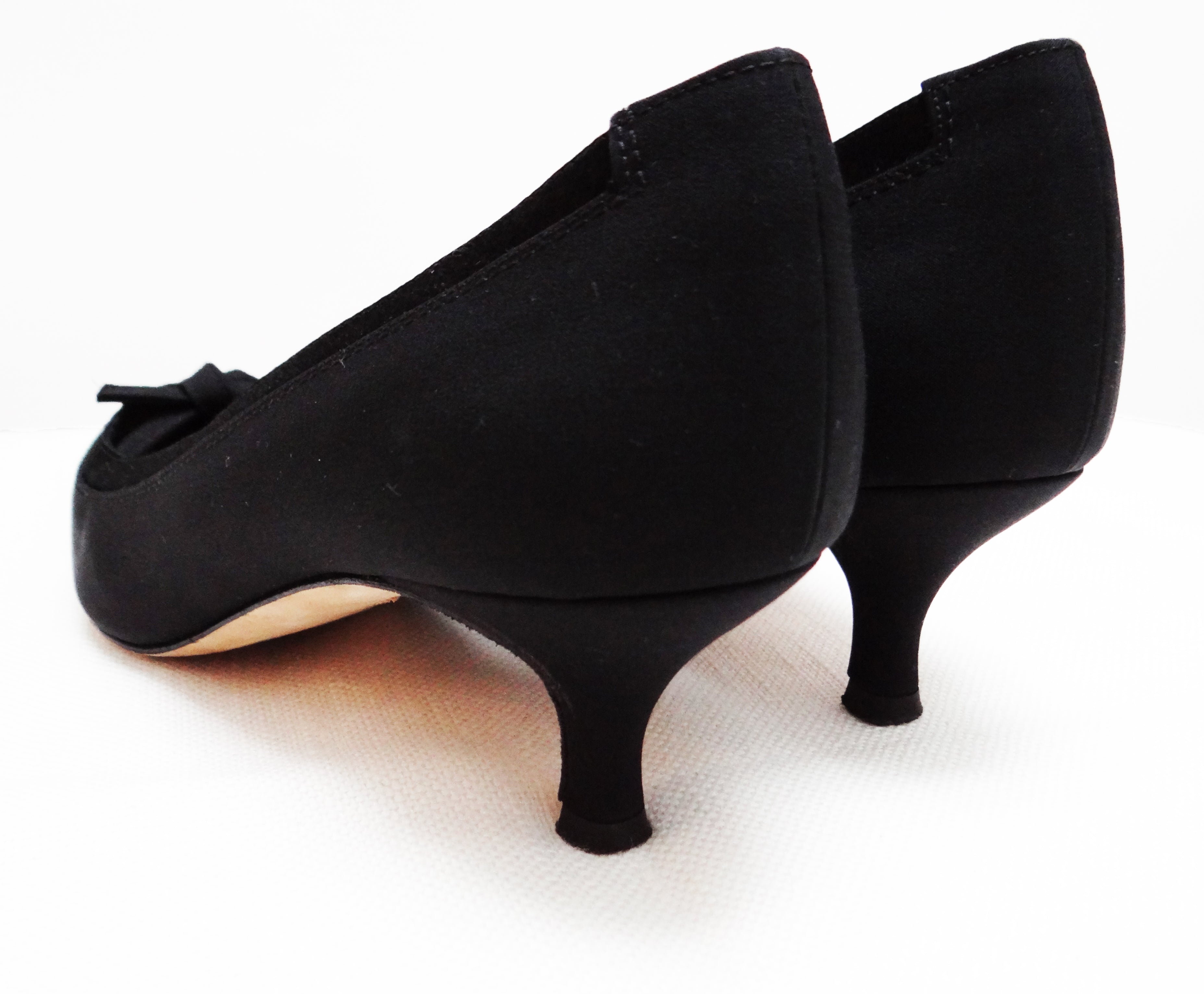 An elegant pair of Manolo Blahnik evening shoes in black satin. They have a low kitten heel, with pointed toes, satin trim and knot detail at the front.