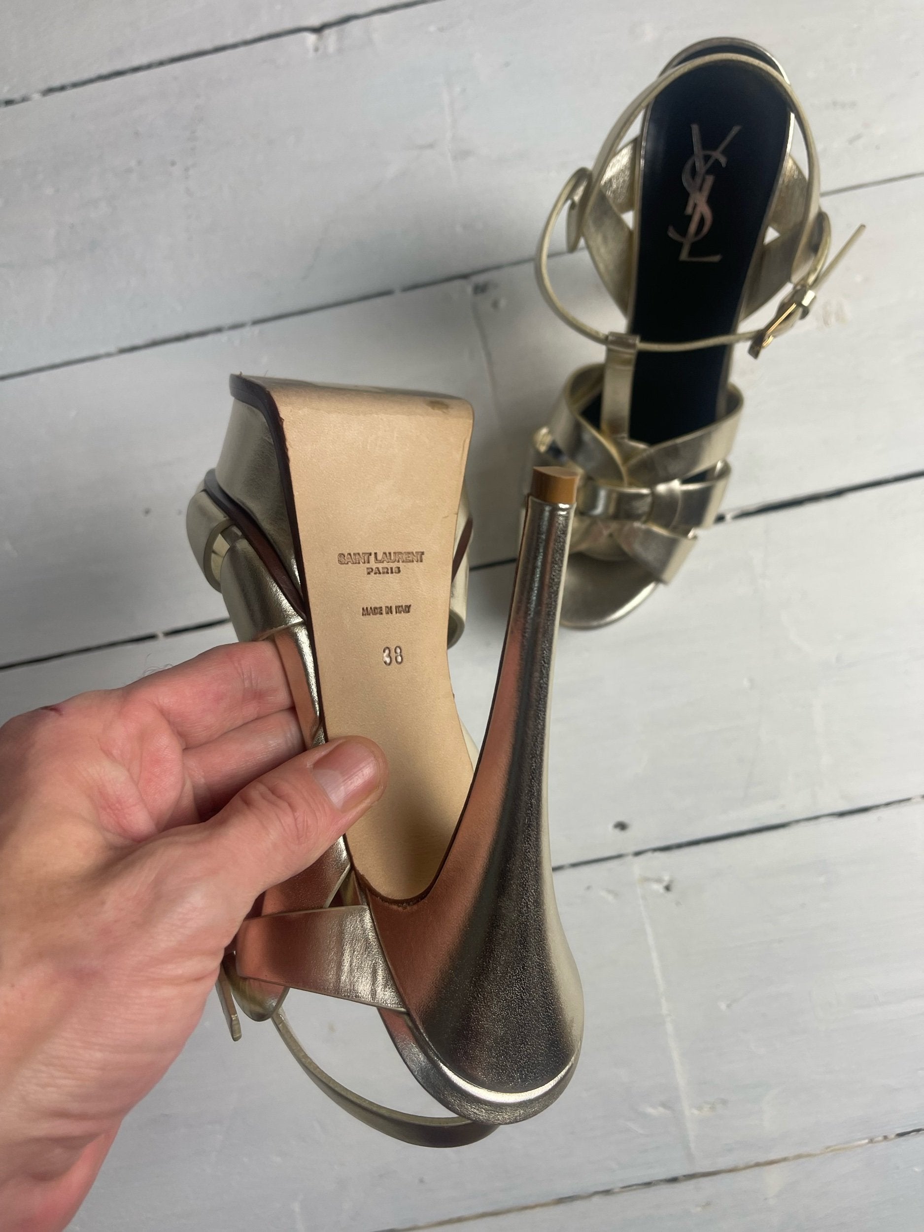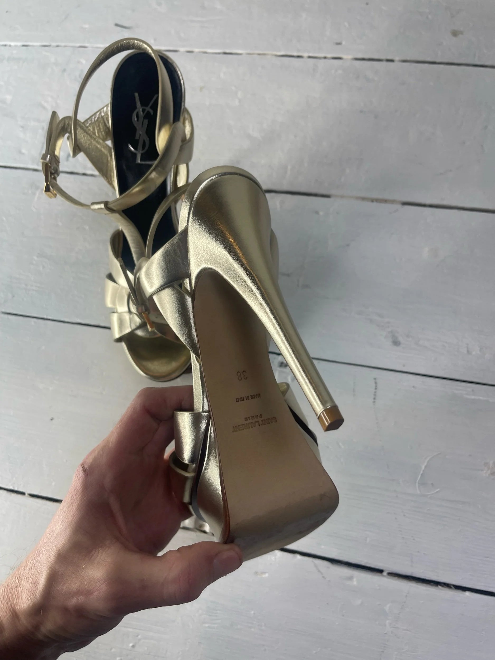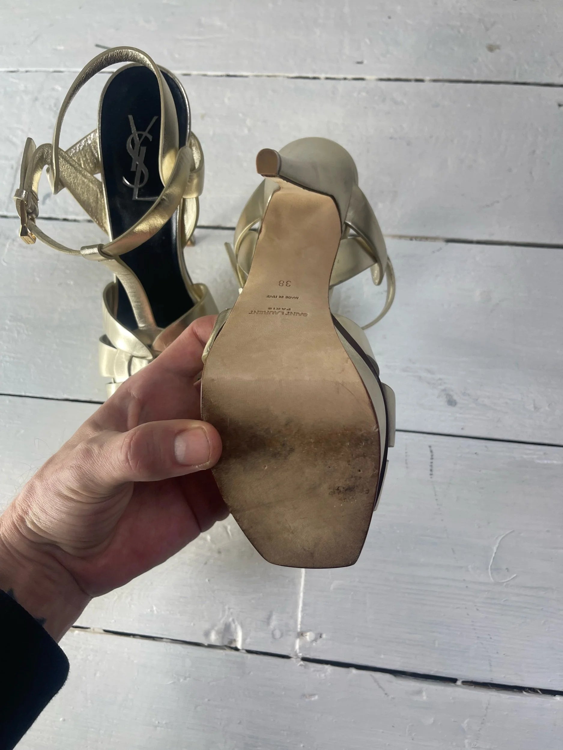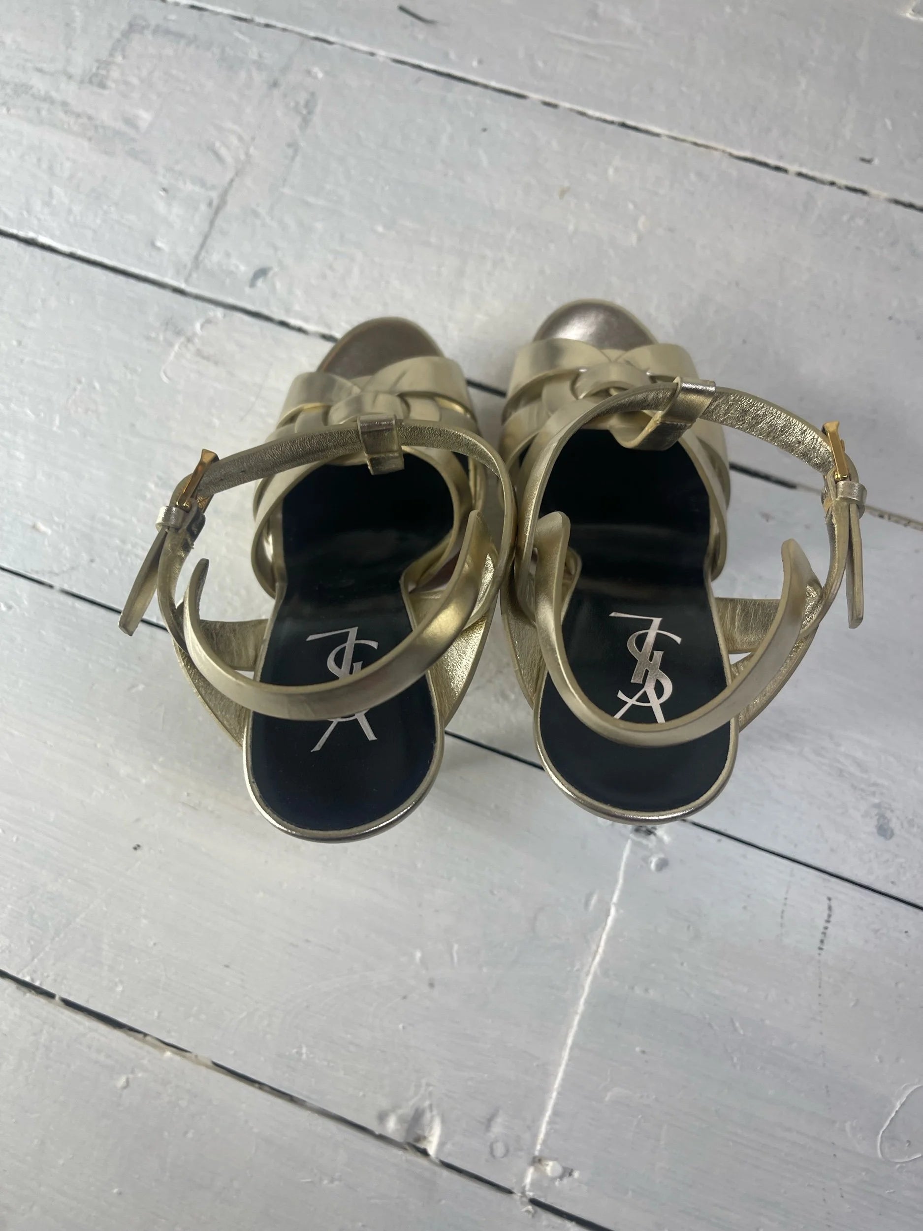 Step into luxury with these stunning Yves Saint Laurent Tribute Sandals in shimmering gold. A timeless icon of elegance, these are the new Tributes — currently retailing for £905.