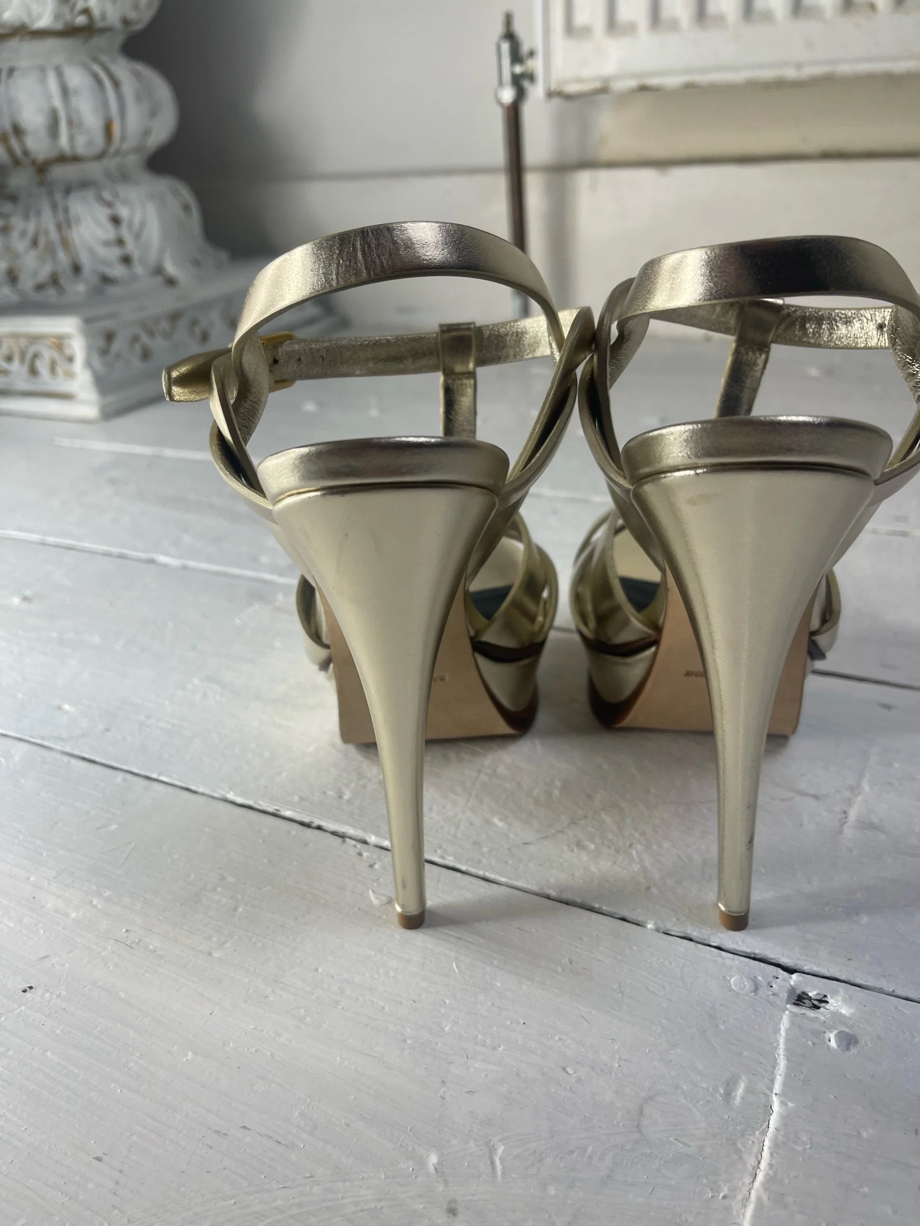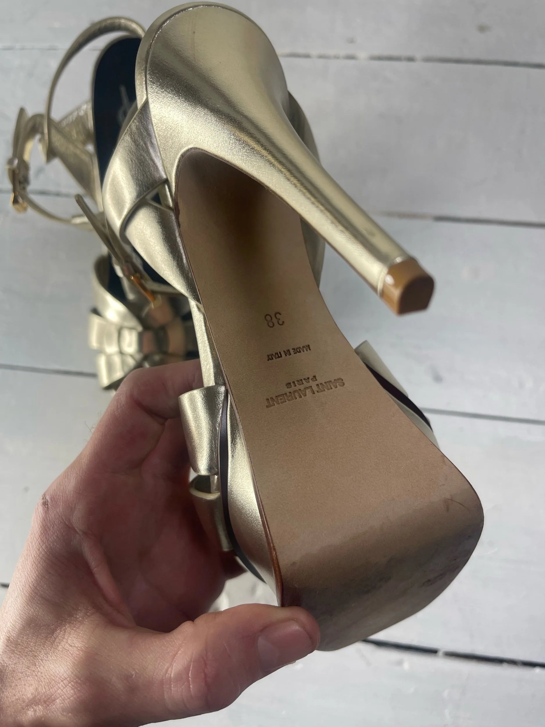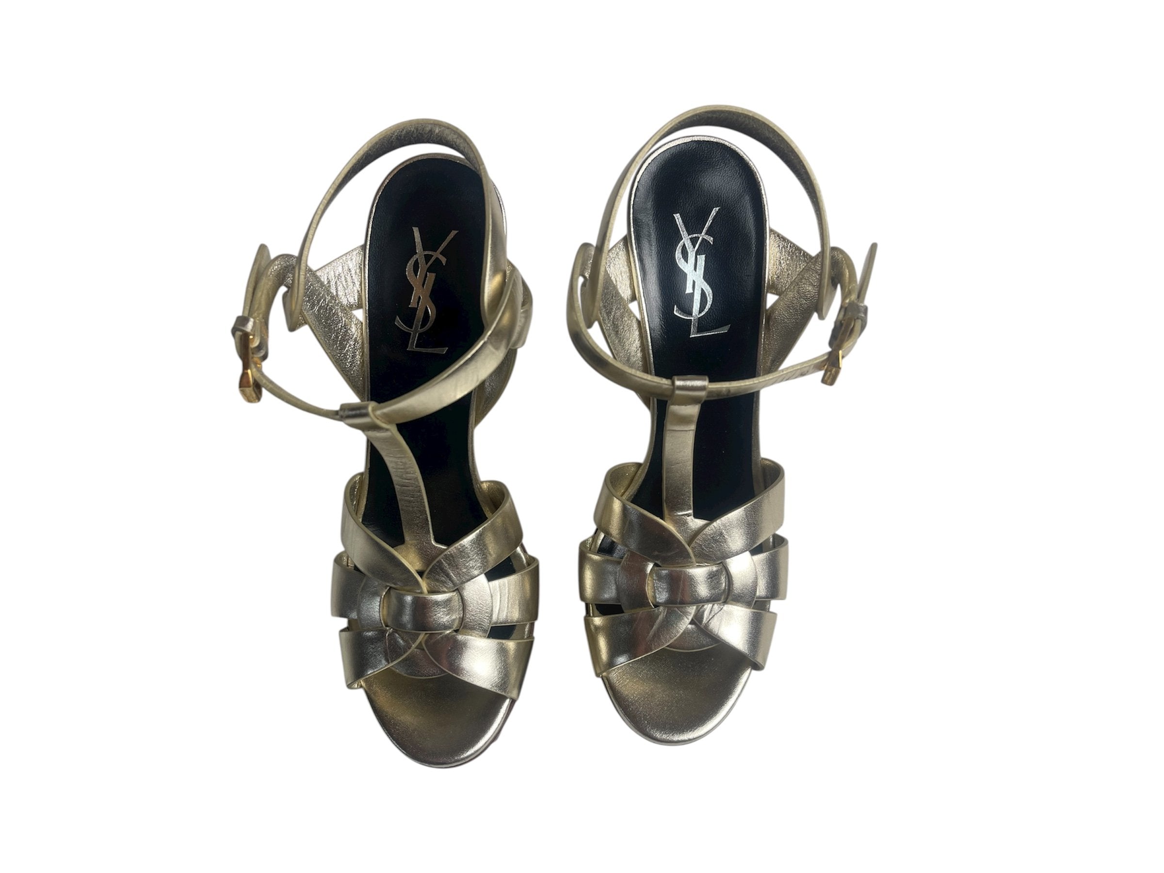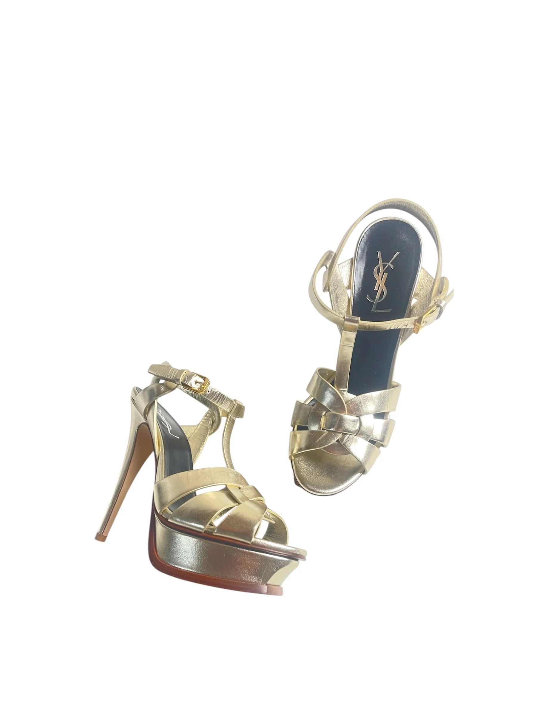 Step into luxury with these stunning Yves Saint Laurent Tribute Sandals in shimmering gold. A timeless icon of elegance, these are the new Tributes — currently retailing for £905.