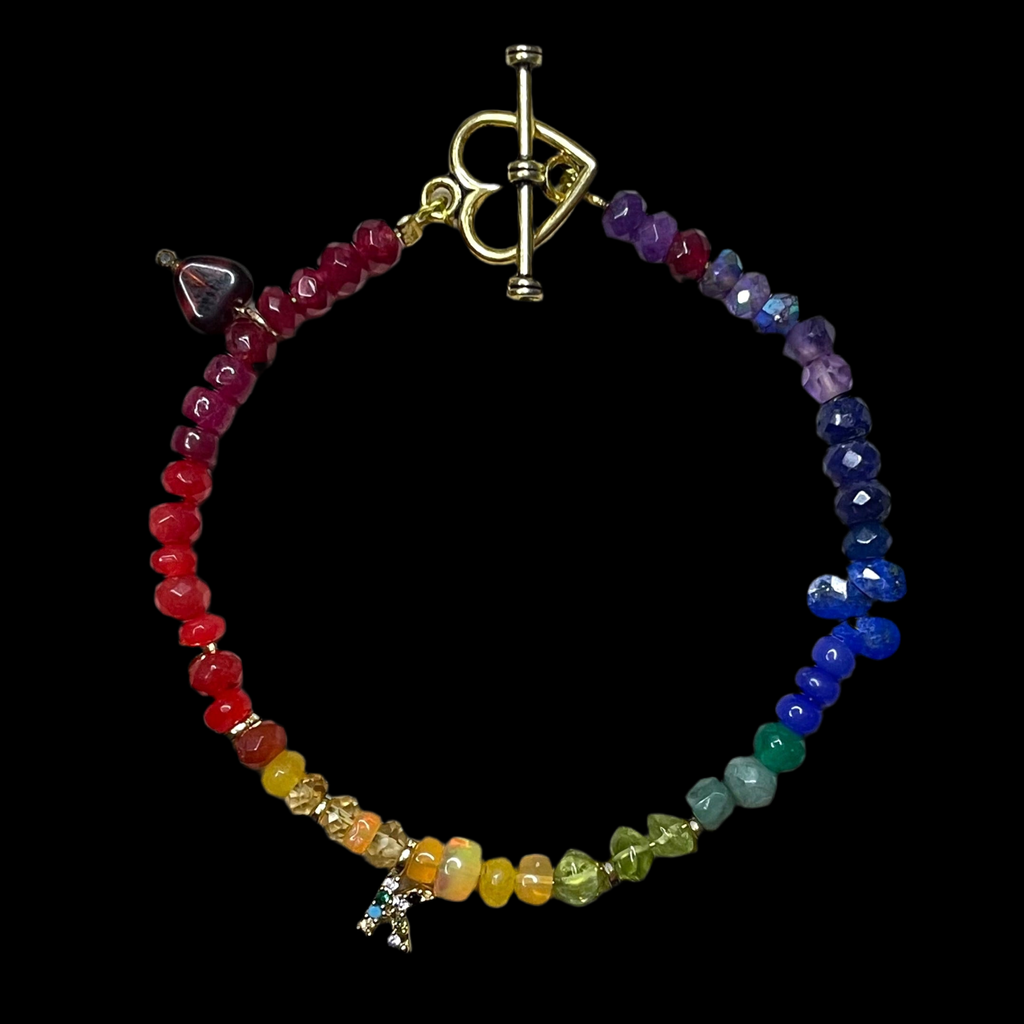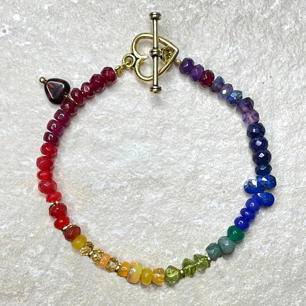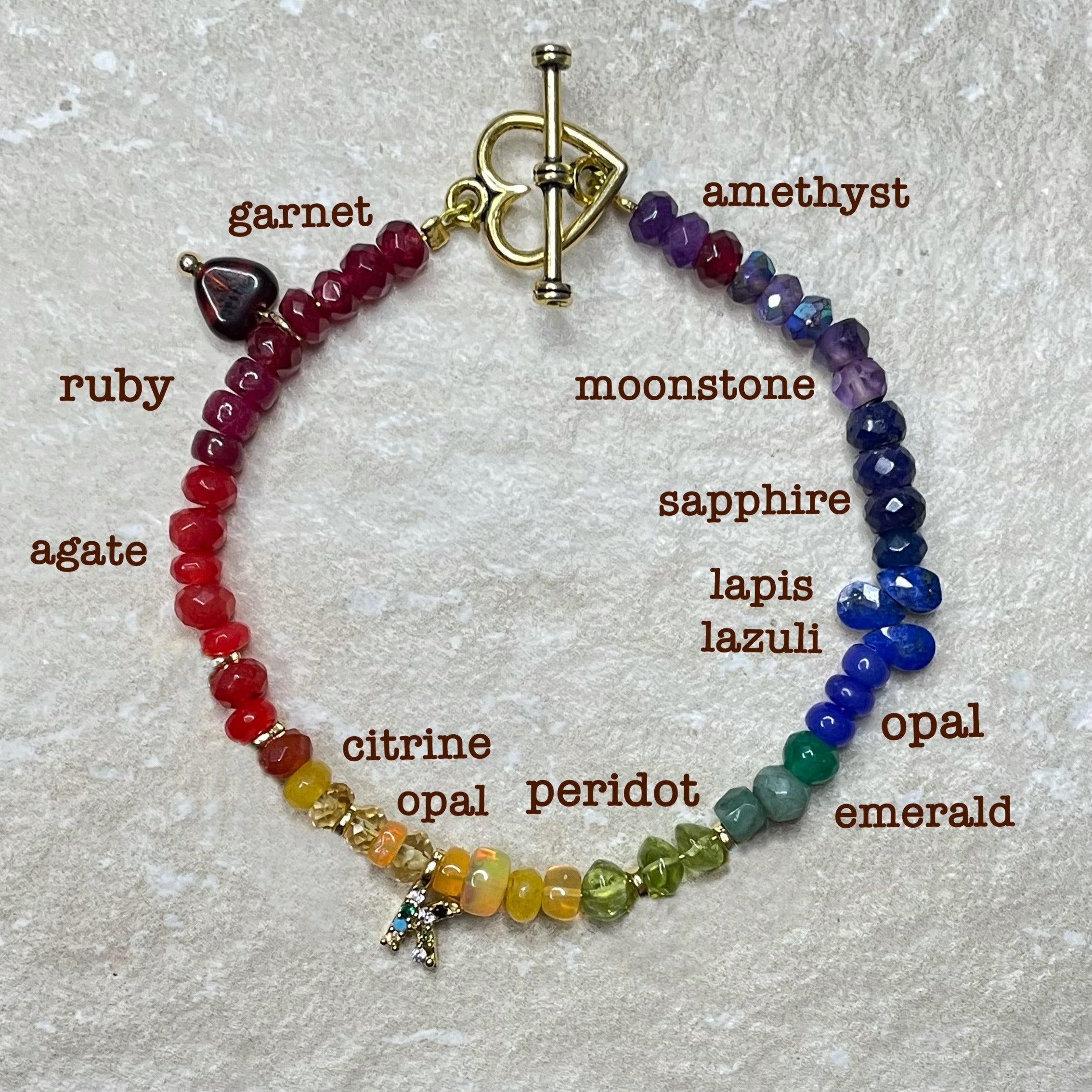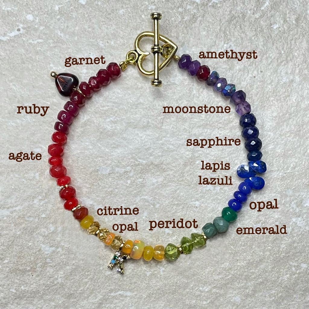 Part of our Precious Elements Collection, the Everything Bracelet blends rainbow shades of precious and semi-precious stones including sustainably sourced ruby, carnelian, Ethiopian opal, citrine, peridot, emerald, lapis lazuli, sapphire, amethyst and moonstone.