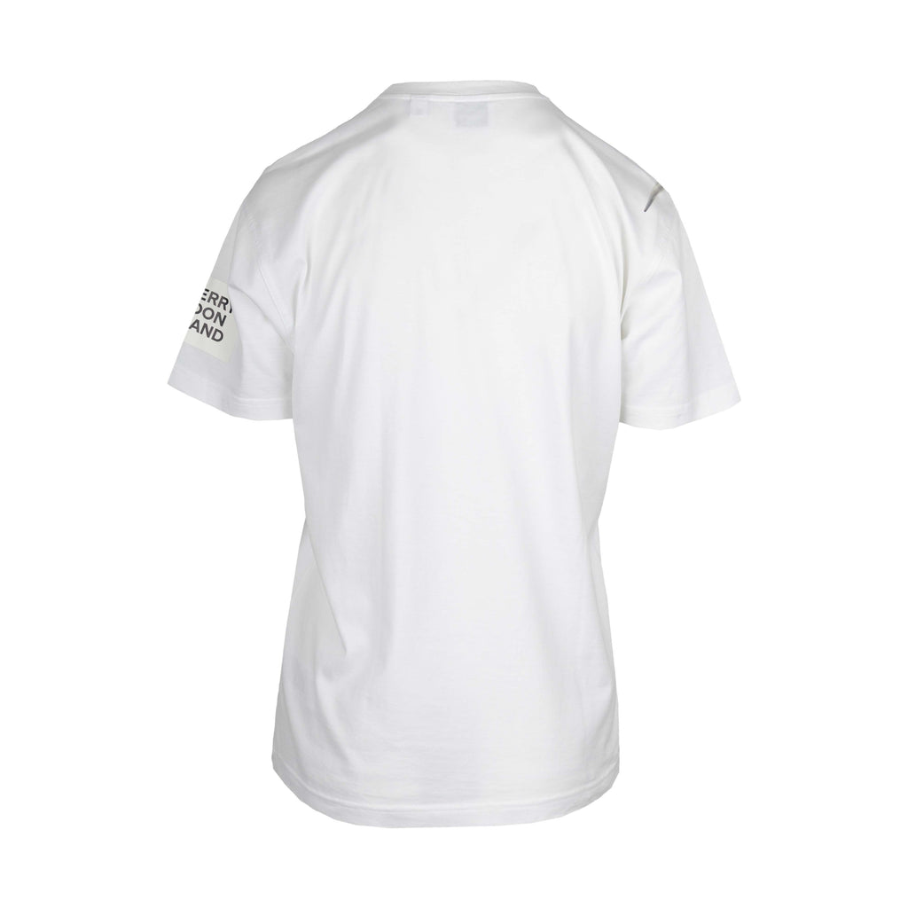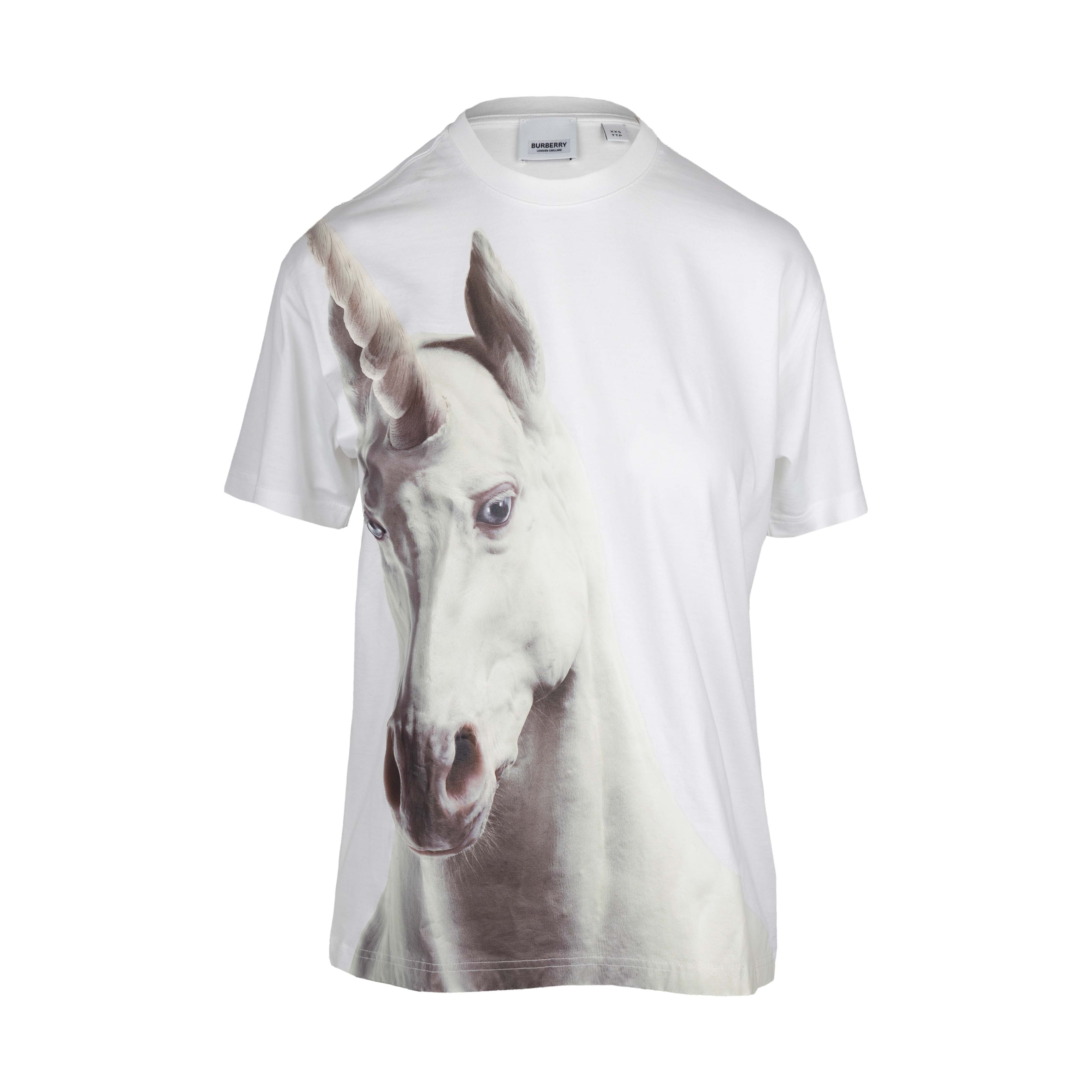 Printed on an oversized tee, the shirt showcases a unicorn placed on a plain white cotton canvas. The branded flair is added by the namesake emblem placed on the left sleeve of the top.