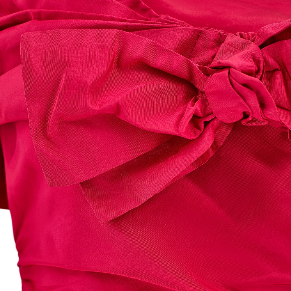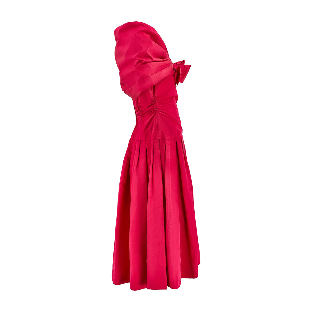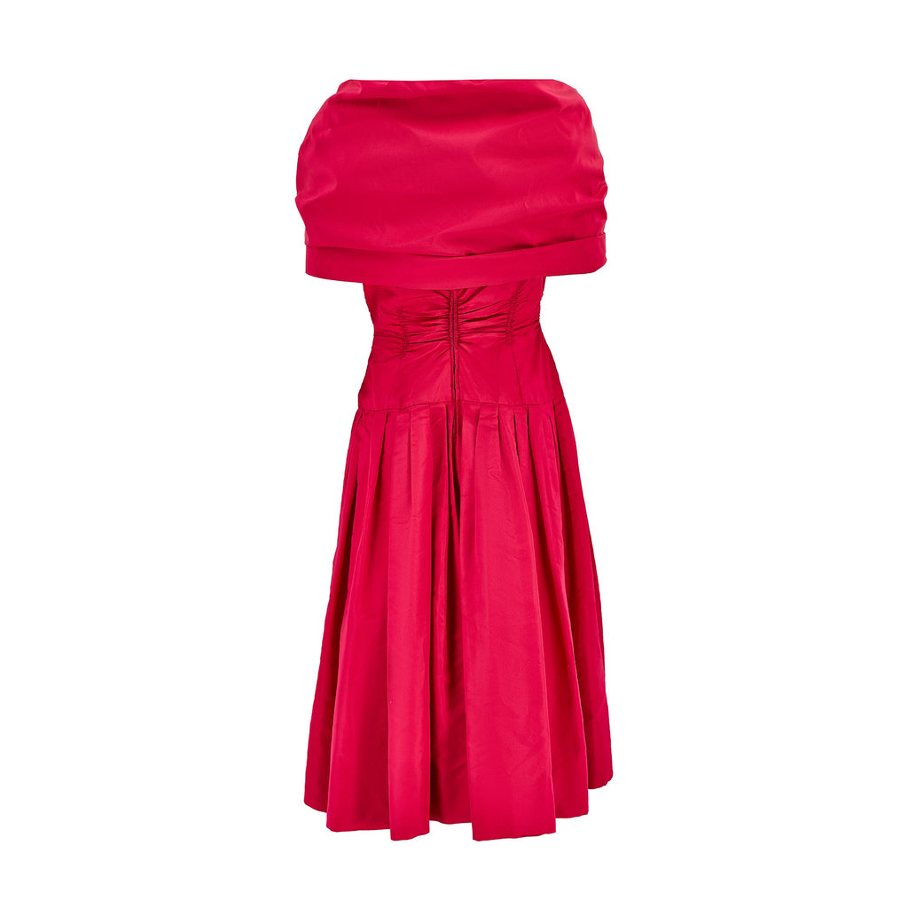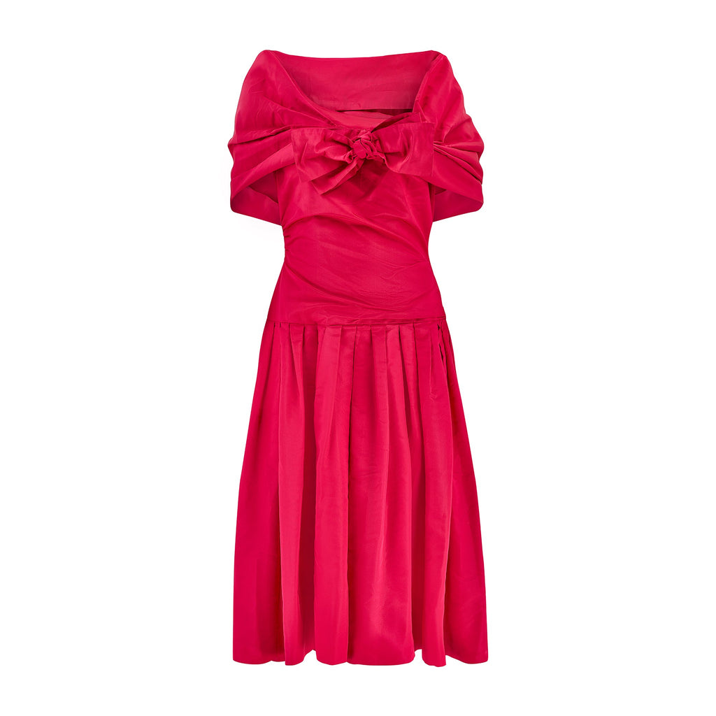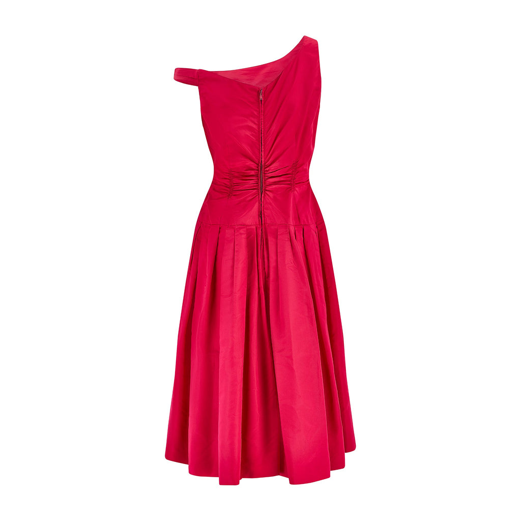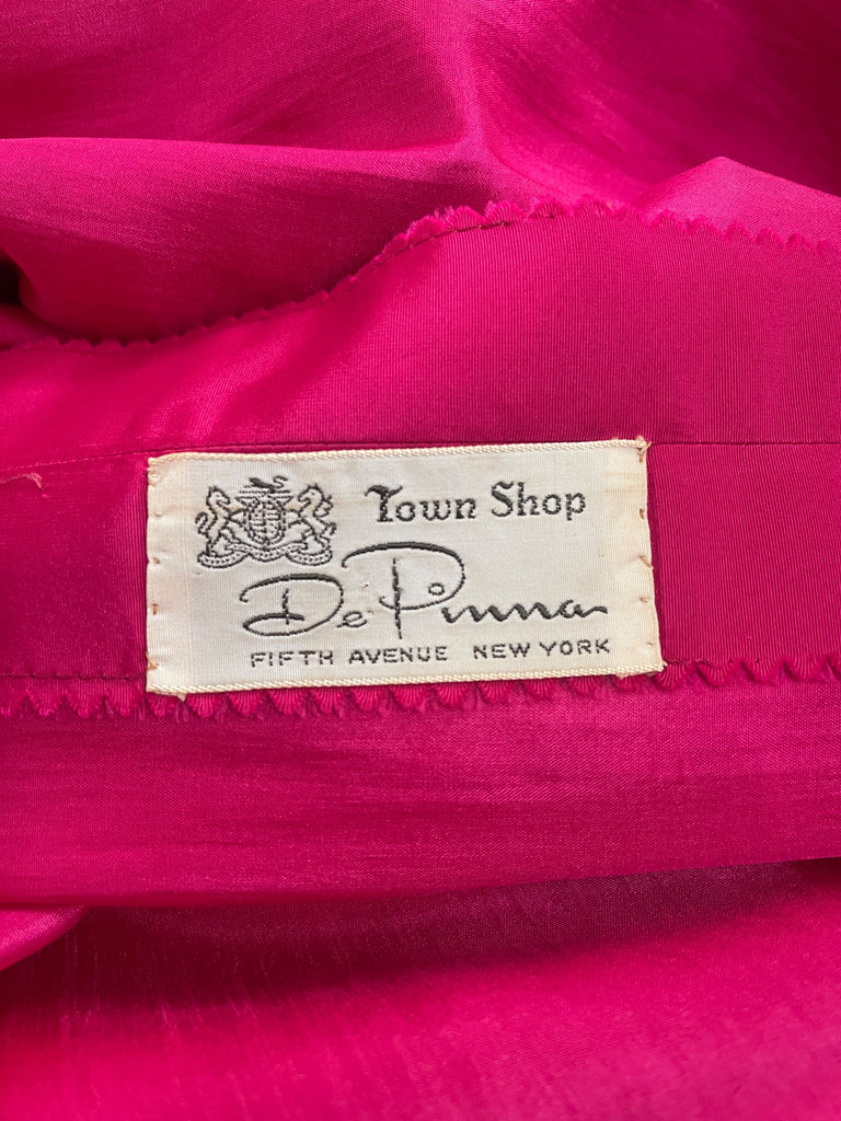 This late 1950s dress is by De Pinna and is crafted from an incredibly vibrant matte fuchsia-pink taffeta silk. Beautifully made for the label’s store on Fifth Avenue, New York, it is lined with silk throughout. A wide, asymmetric V-neckline reveals the collarbones and décolletage with one strap sitting off-shoulder - an unusual detail for this era. The bust is boned down each side creating a form-sculpting corset top above a drop waist which gives way to a low-slung box-pleated skirt. The back is slightly lowered in a soft-V style. The waist is smocked, ruched and gathered at the back of the dress, creating a highly flattering silhouette. The skirt falls to the calf and is lined with pink tonal silk closing at the rear with a hidden zip and single hook-and-eye clasp. The dress comes with a matching capelet, also tailored from fuchsia silk. This is pleated and shaped to wrap around the shoulders and joins at the front with two hidden hook-and-eye clasps under a large stiff silk bow.