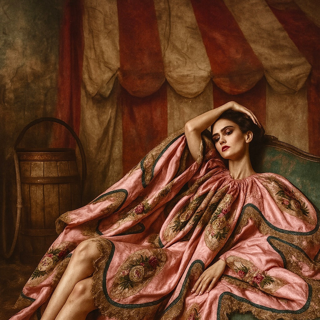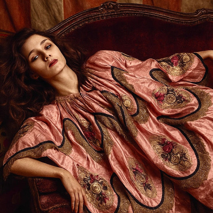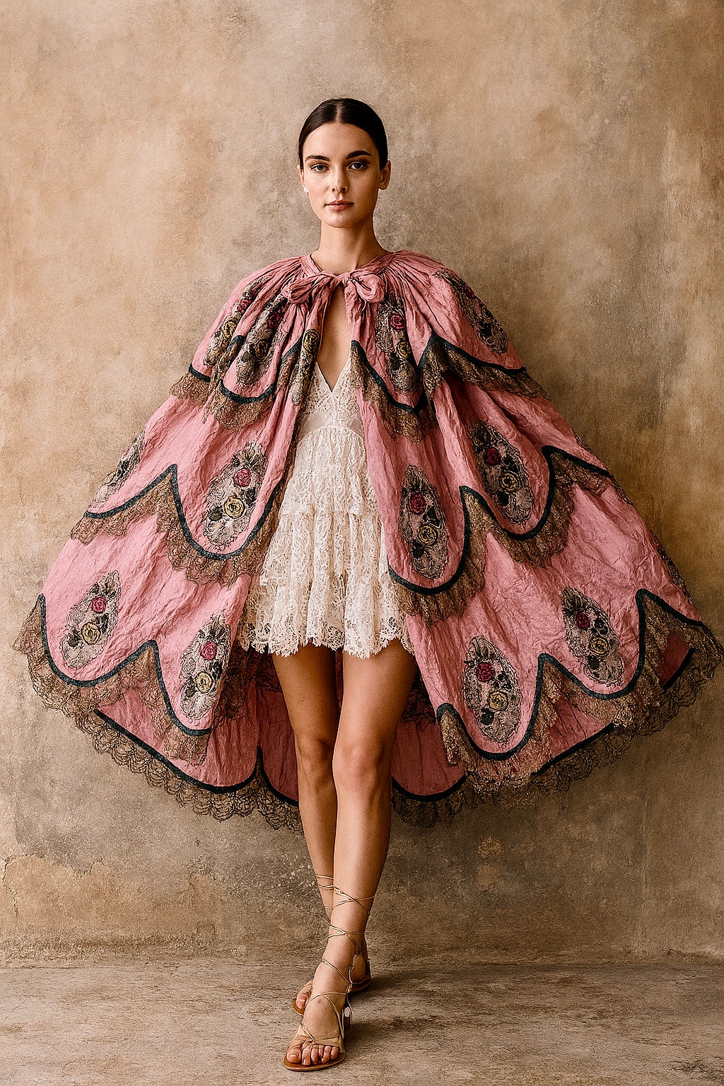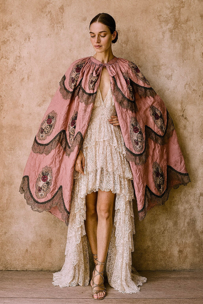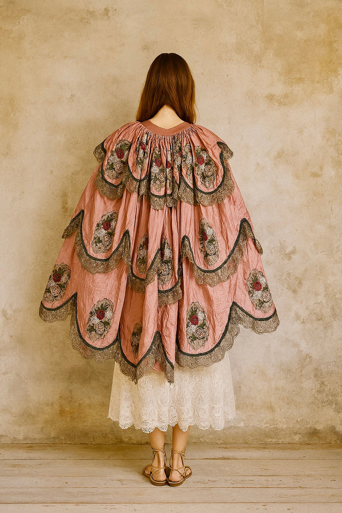 This exceptional cape is crafted from reworked original Victorian pink silk, featuring a scalloped silver lace frill and intricate embroidered floral motifs across three tiers. Designed with a ribbon tie at the neck and front hooks, it blends historical elegance with modern wearability. A rare piece for those who appreciate refined craftsmanship and vintage heritage.
