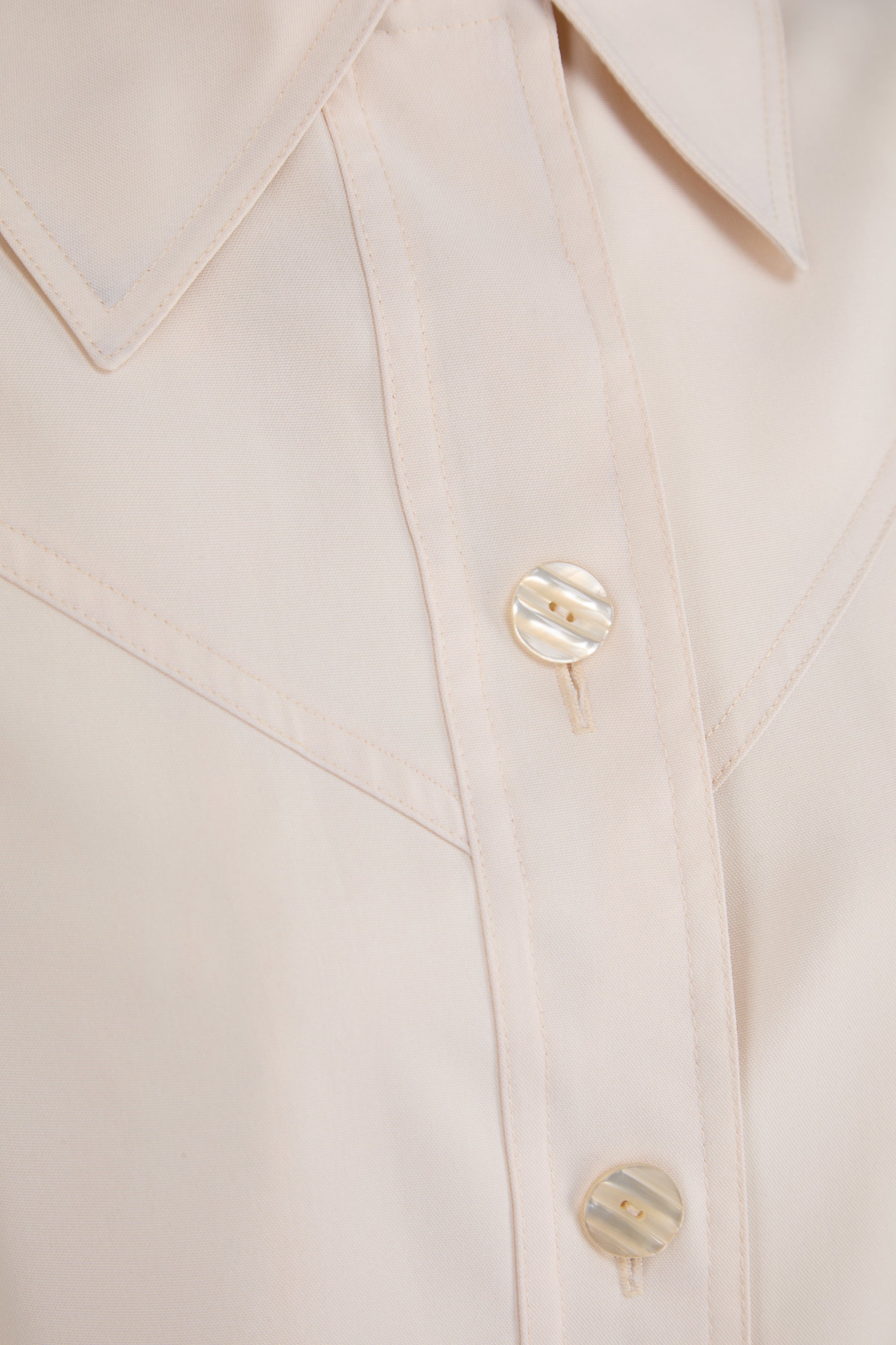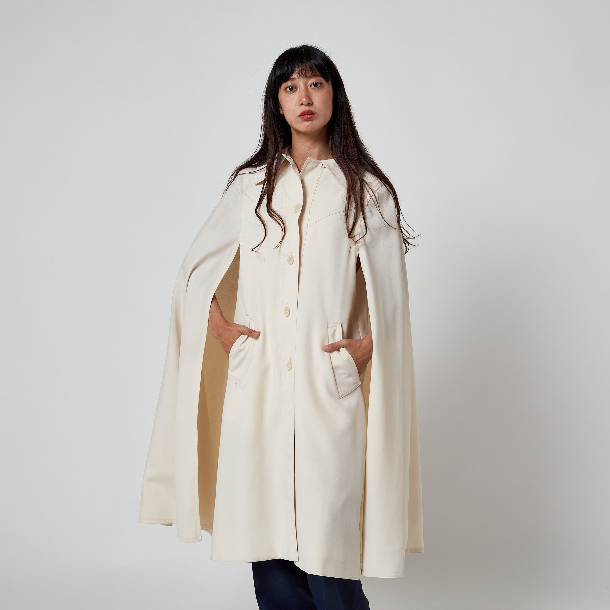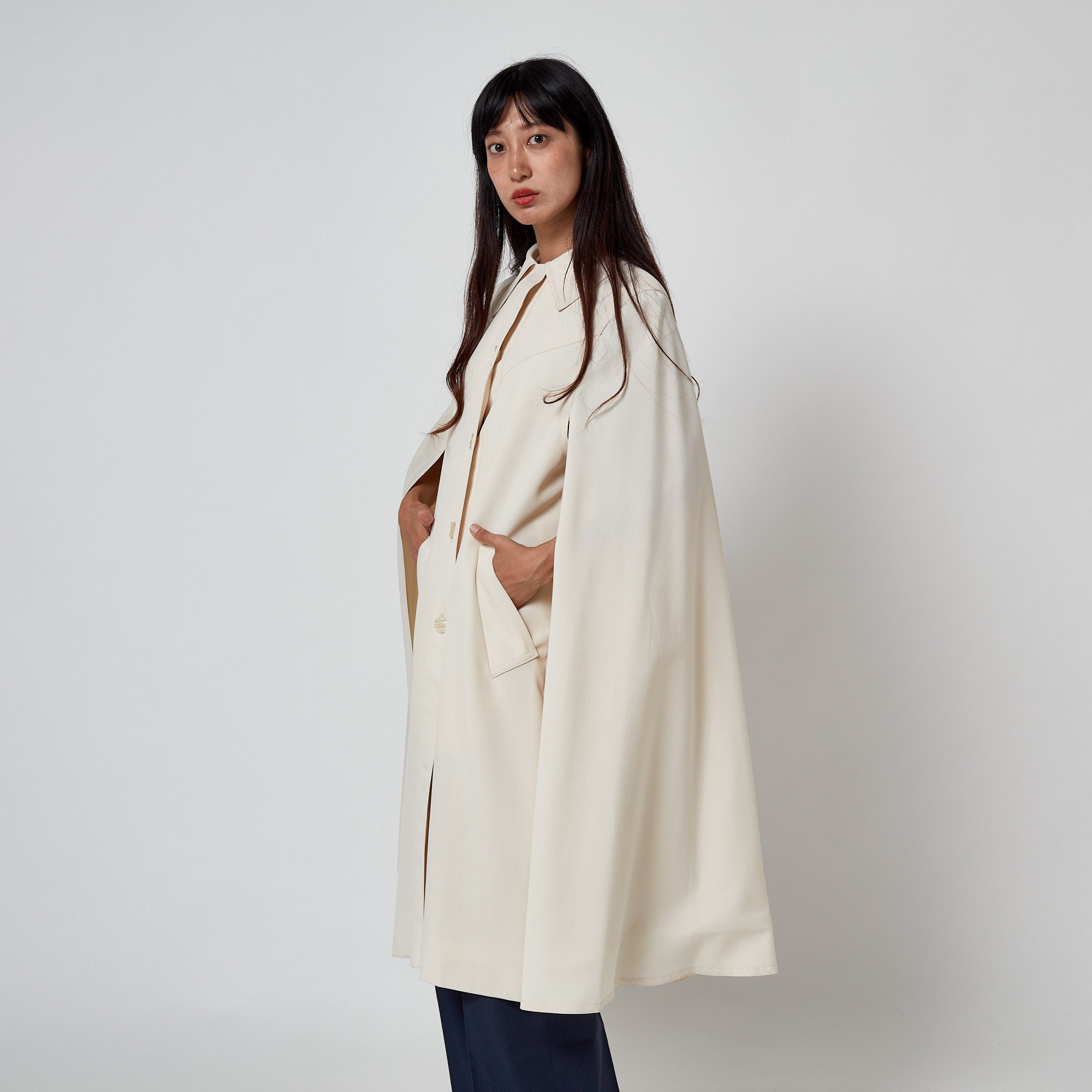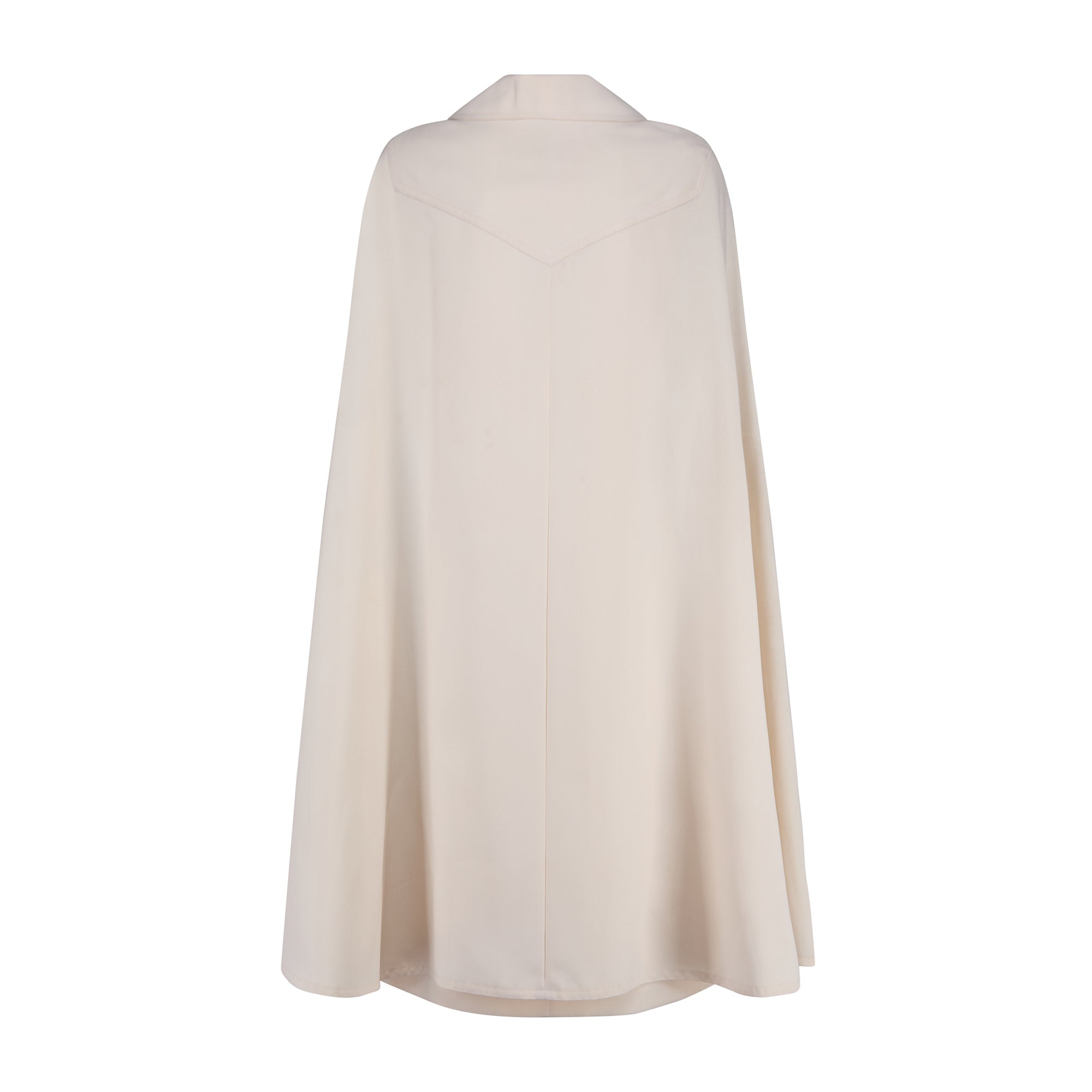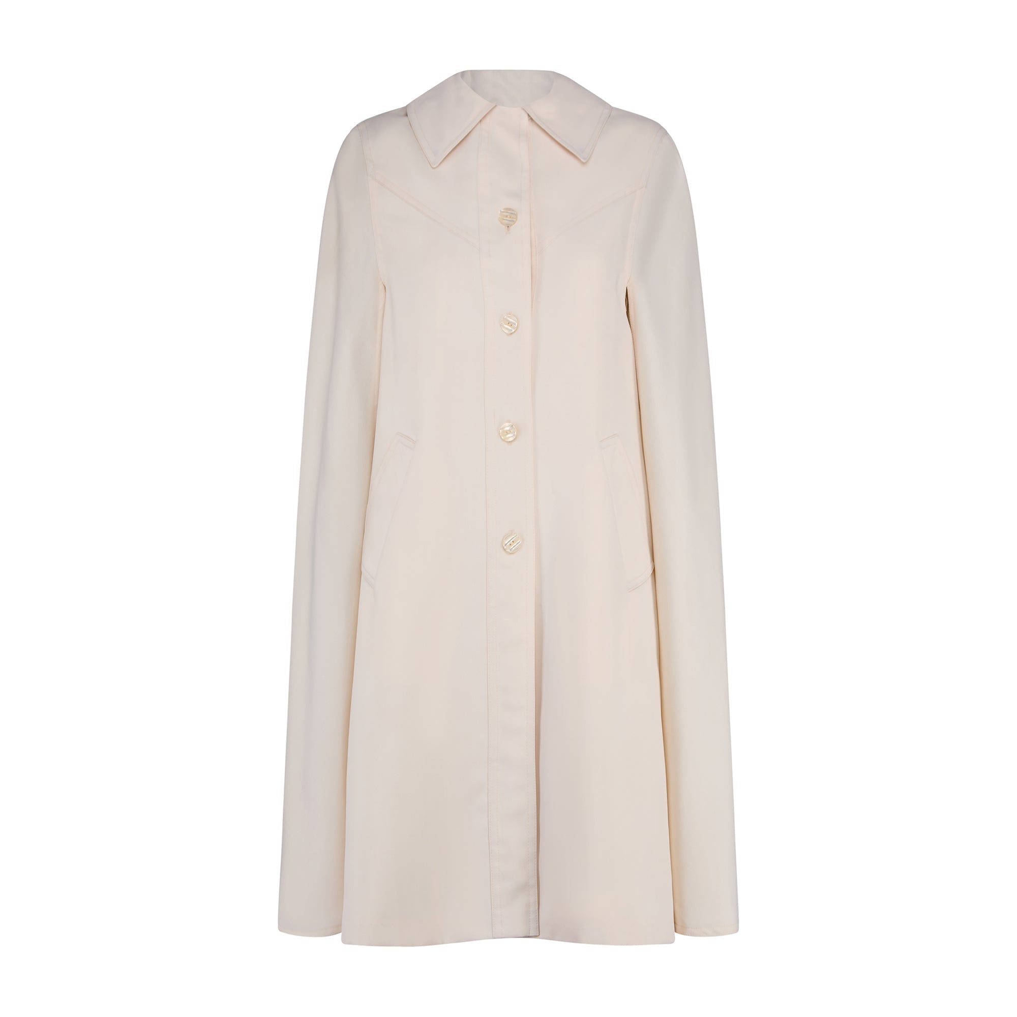 This graceful midi-cape was made in the 1970s by an unknown designer and is woven from a soft cream cloth. The fabric feels like that of a traditional trench coat which adds a utilitarian feel to this feminine style. The cape has a formal pointed collar at the neck. The tonal stitching and panelled construction also recalls trench coat construction. The cloth forms a cocooning shape around the body, broken only by two large slits at the front which serve as armholes. The cape has a button-up front which showcases decadent pearlescent buttons with a ridged texture. There are two slanted welt pockets at the hips. Beautifully made, the cape is lined with cream satin throughout.