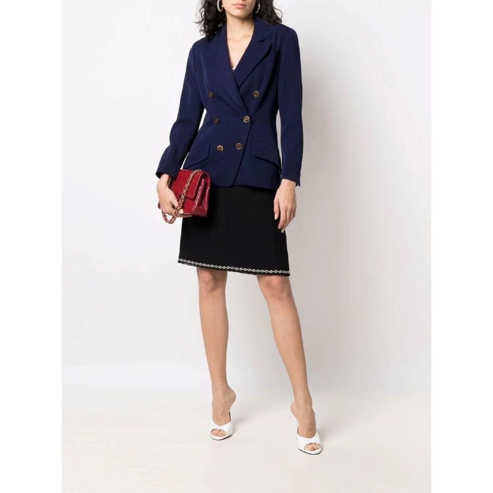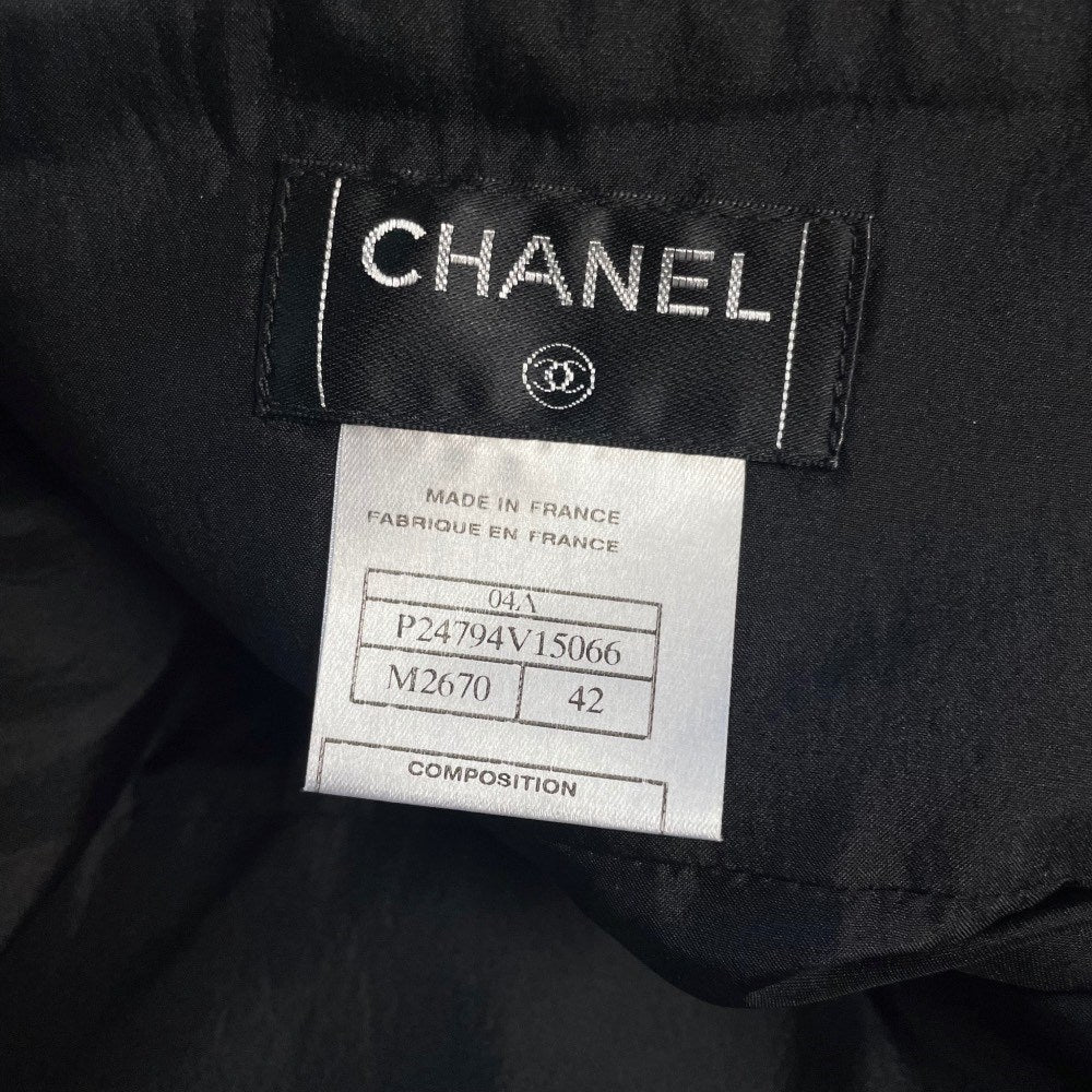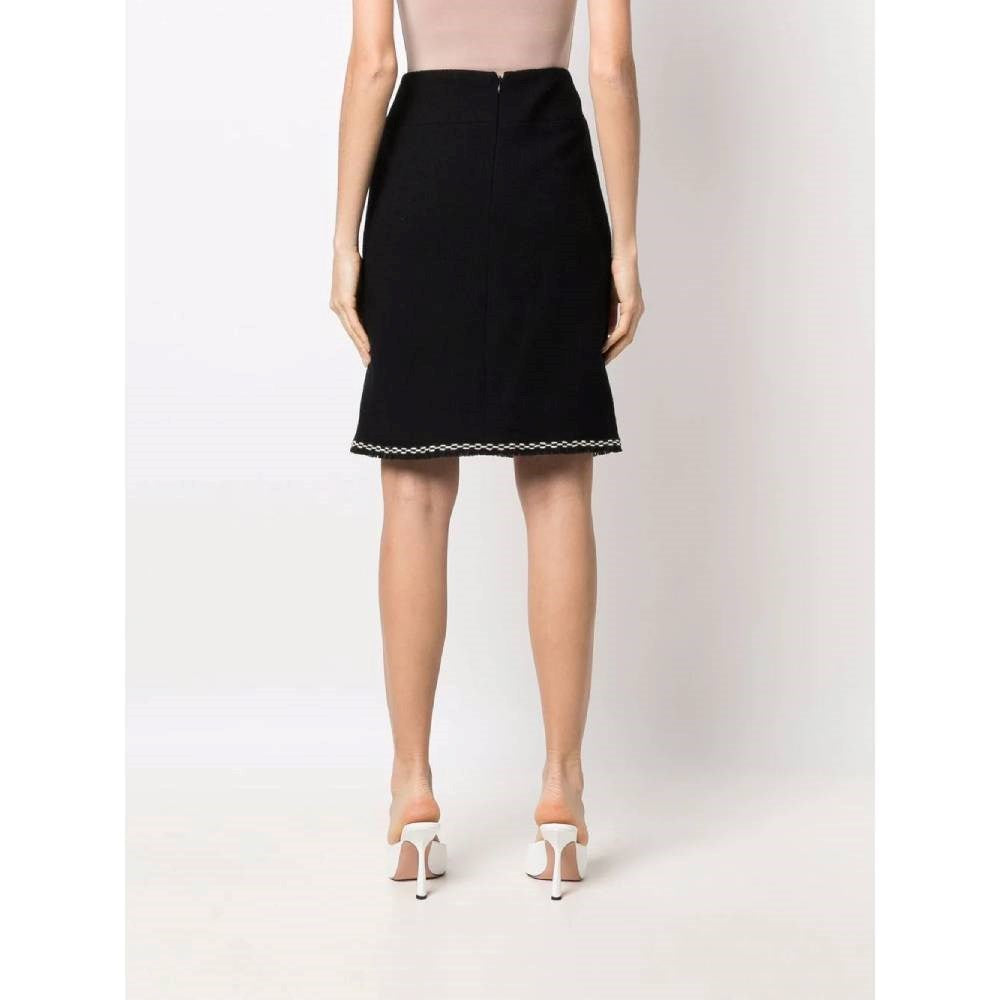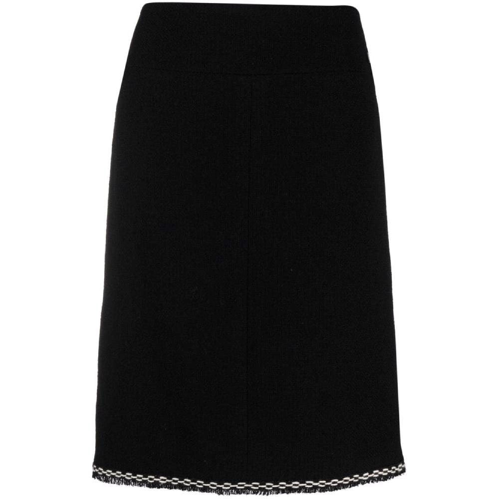 Chanel black wool 2000s midi skirt with frayed hem and white embroidery on the bottom. - Year: 2004