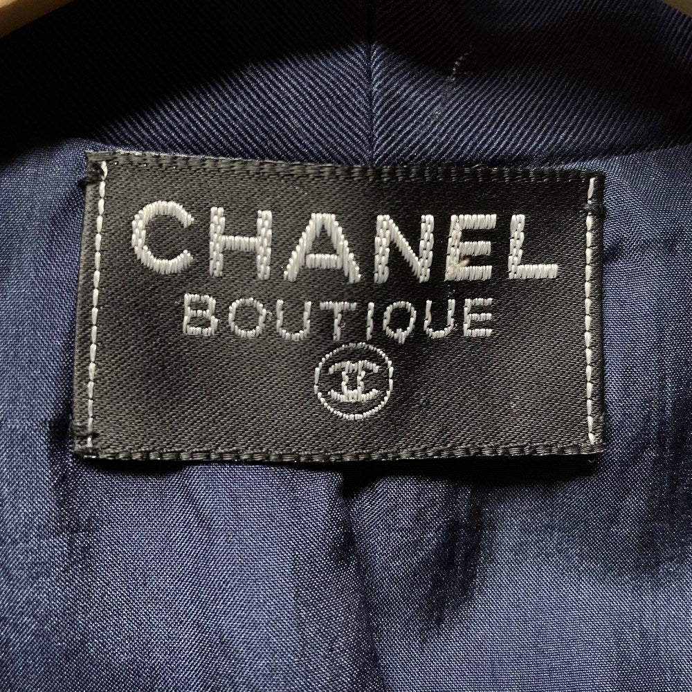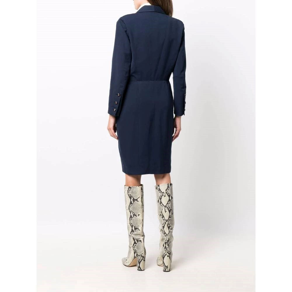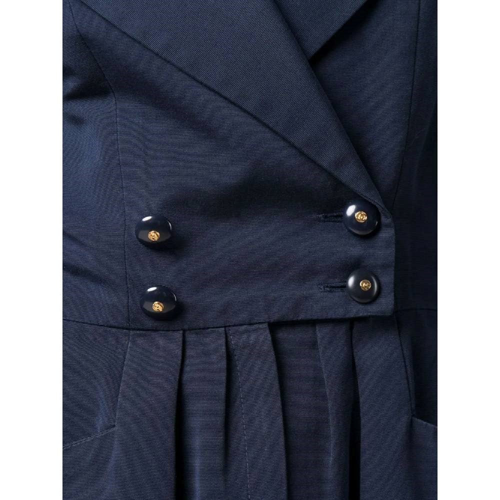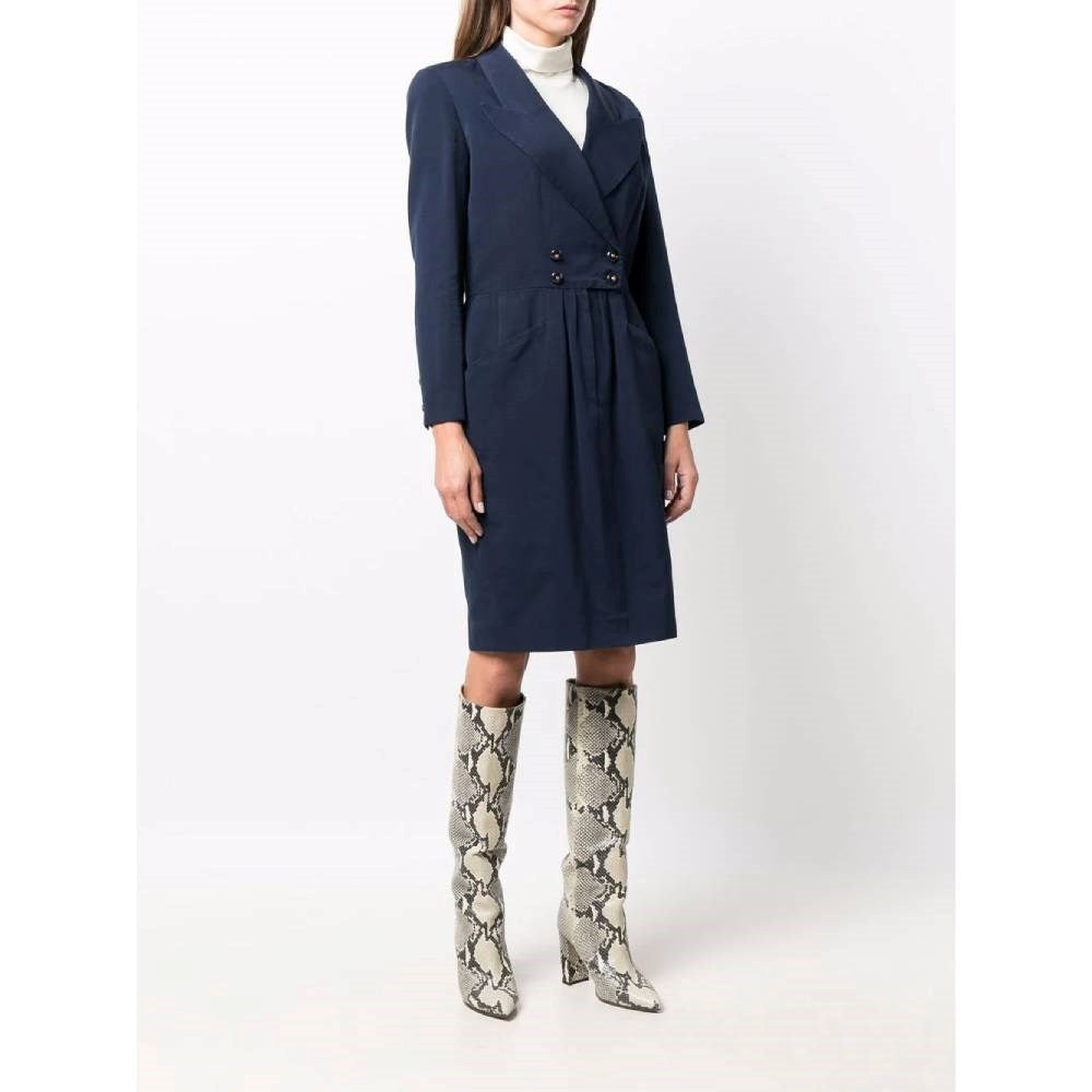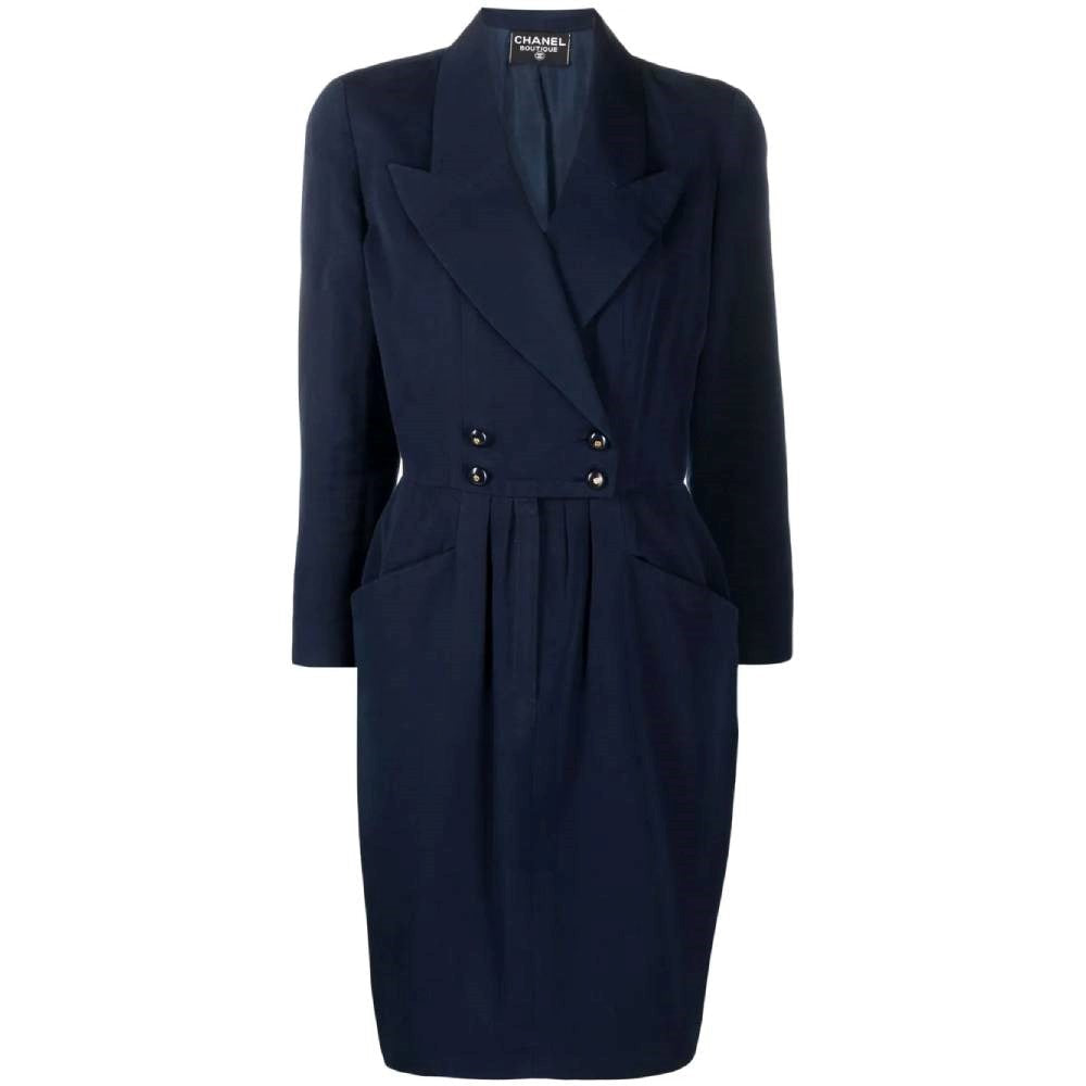 Chanel blue cotton double-breasted midi dress with padded shoulders. Tight at the waist with frontal pleats, logoed buttons and zip. Side welt pockets. Long sleeves and three logoed buttons on the cuffs.