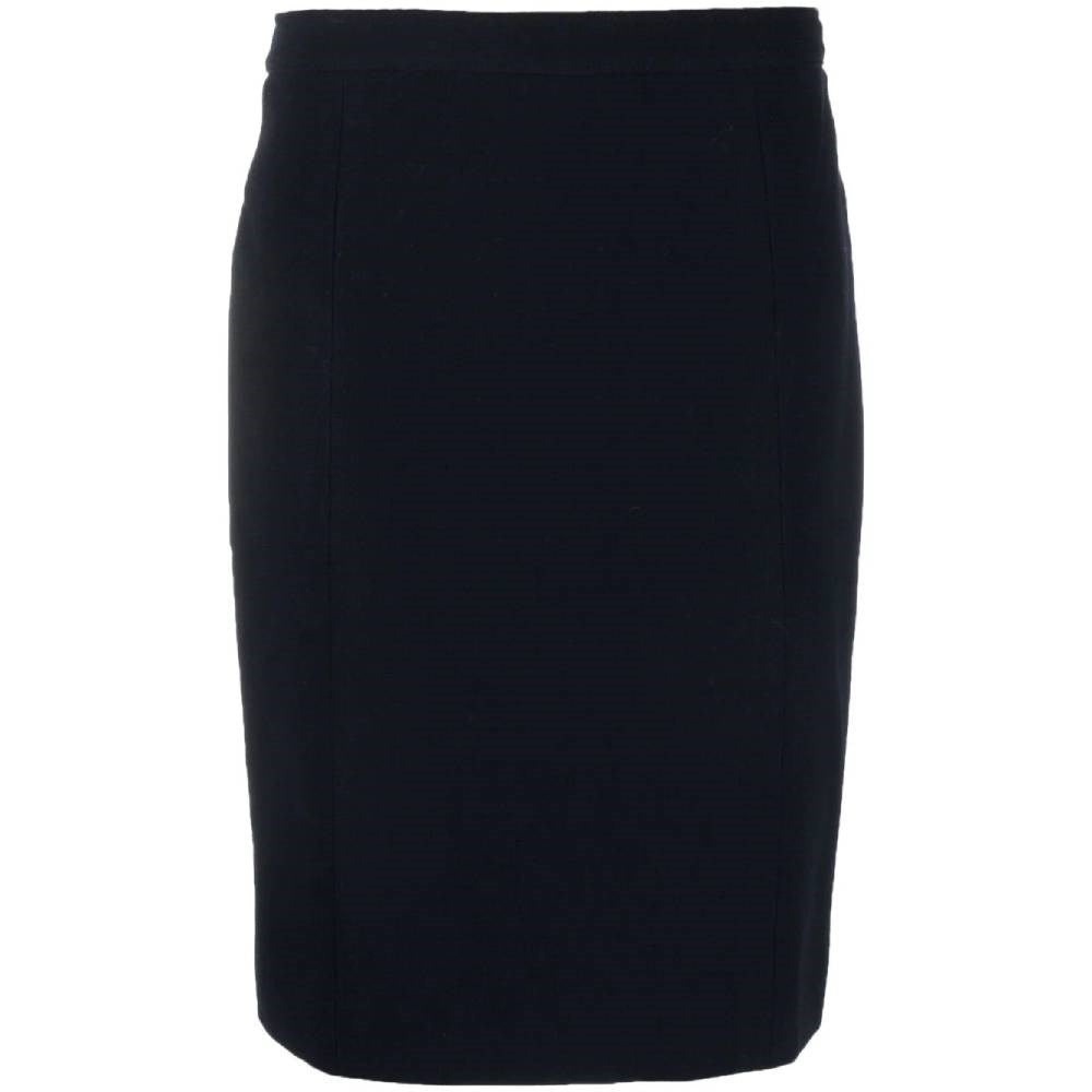 Chanel dark blue wool 90s midi straight skirt with rear gold-tone logoed button and zip.