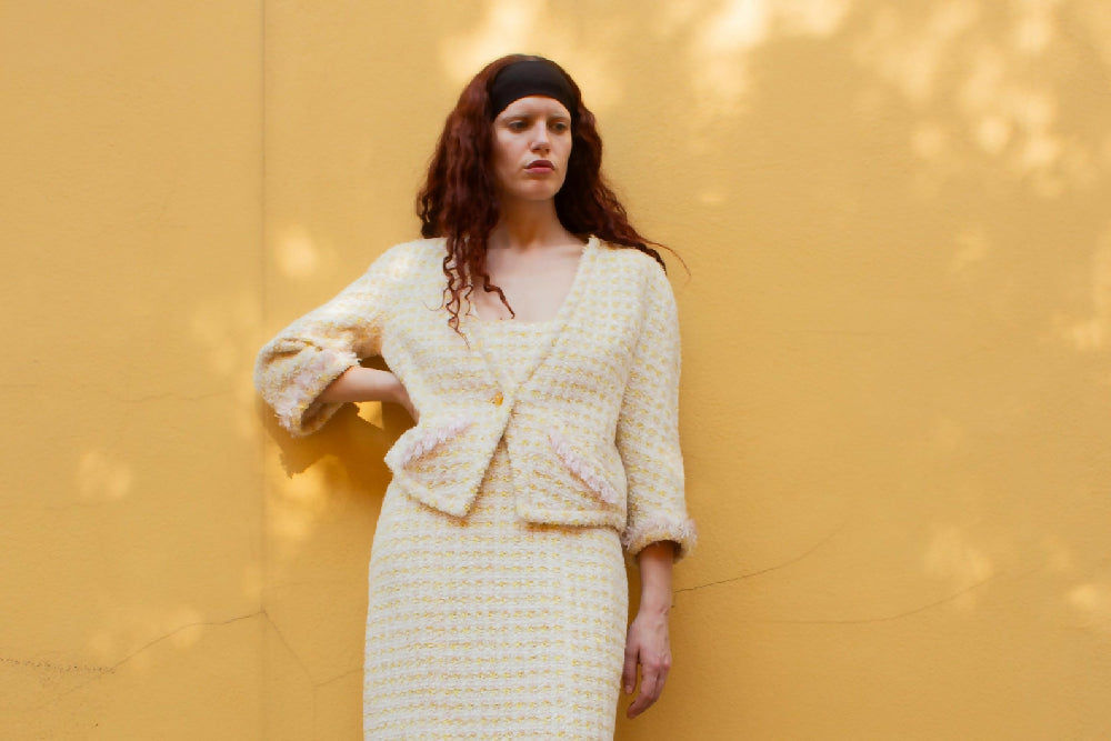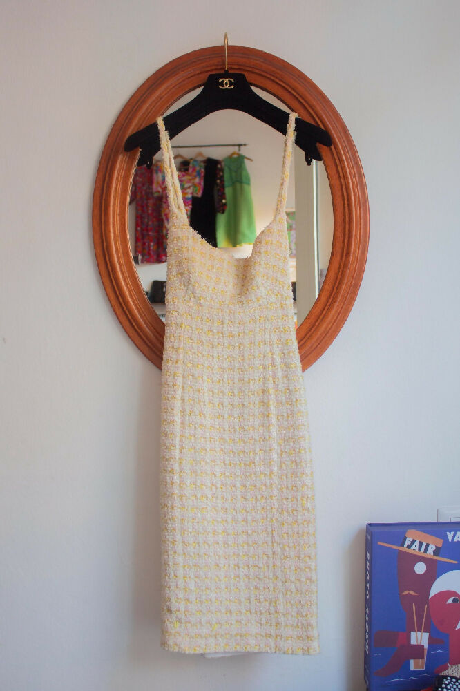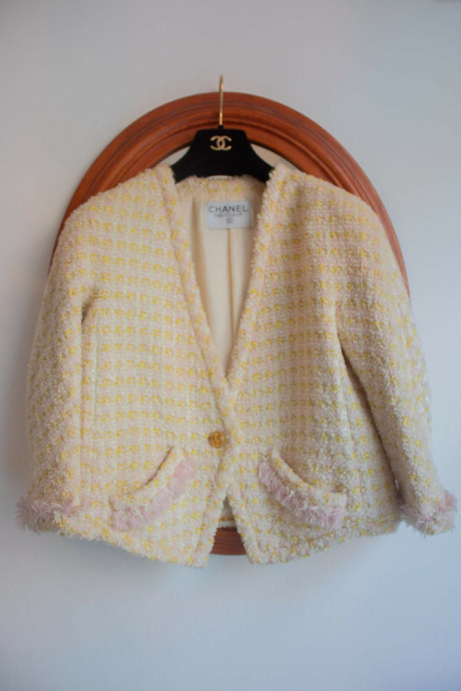 Chanel spring/summer 1992 runway iconic yellow and pink melange tweed two piece with slip dress and cropped jacket made in France (M)