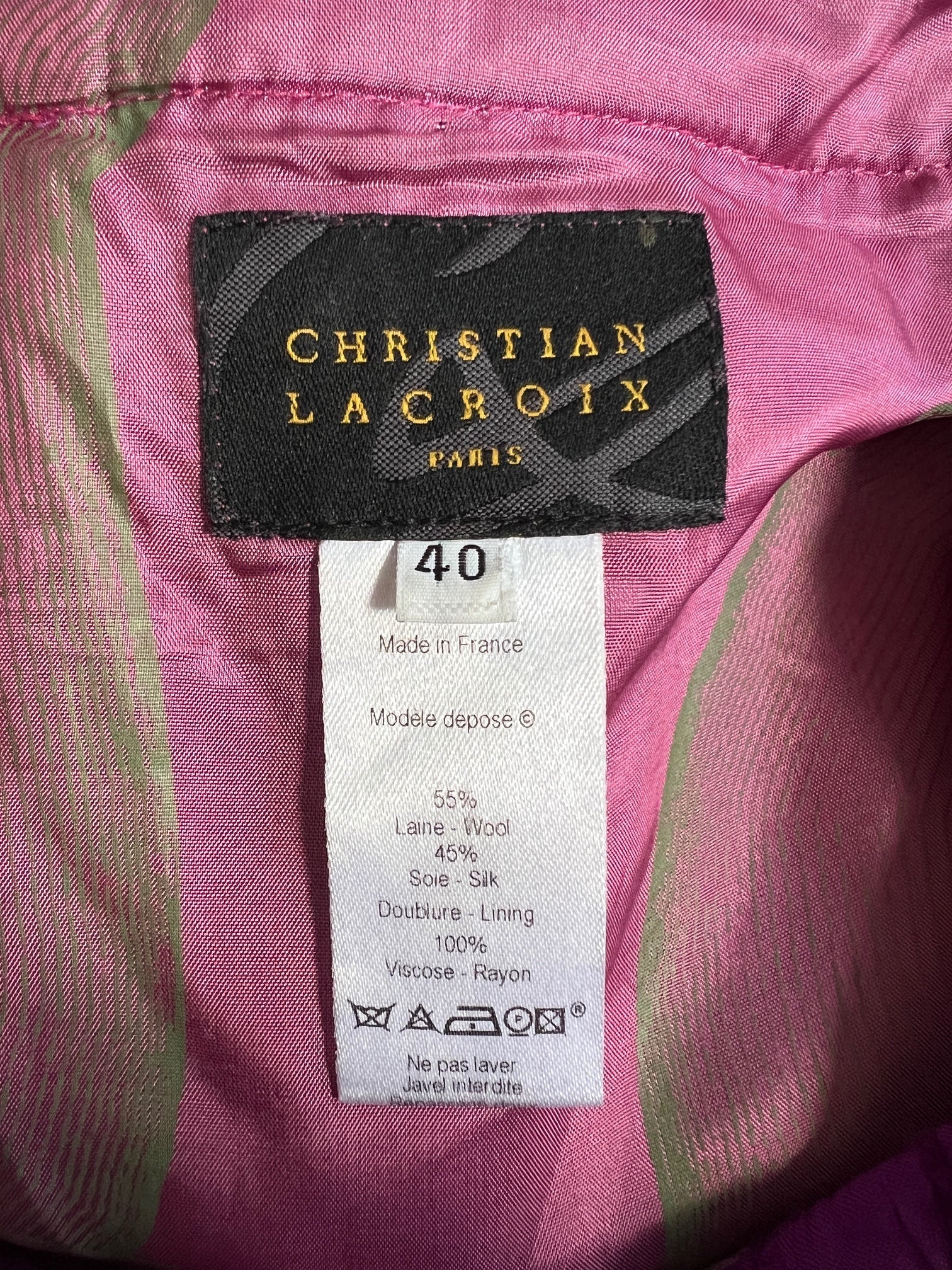 The skirt is tailored to a high-waist cut. It has a dramatic A-line silhouette that falls to the floor. Just like the jacket, it is detailed with the clashing cream section and finished with braid spirals and rhinestones. It fastens at the back of the waist with a hidden tonal zip and hook-and-eye clasp. Both the jacket and skirt are lined in a dusky pink viscose with a psychedelic graphic print in sage green. The jacket, and skirt both contain the mustard yellow on black and grey Christian Lacroix Paris label.