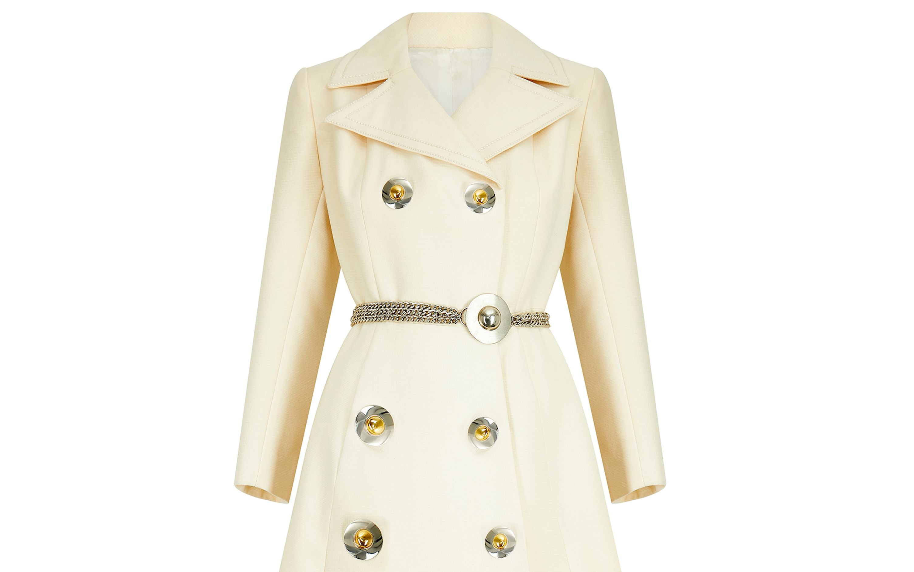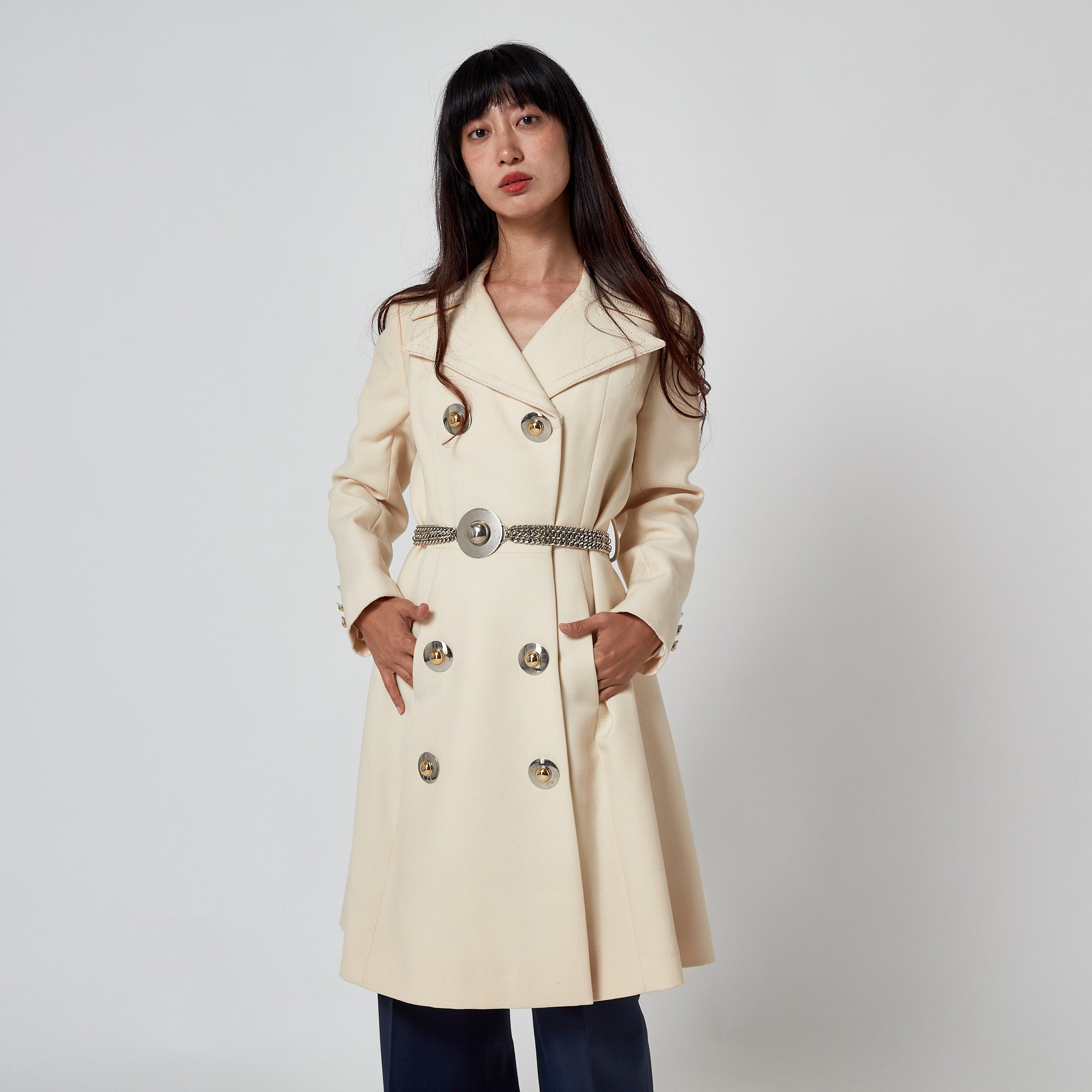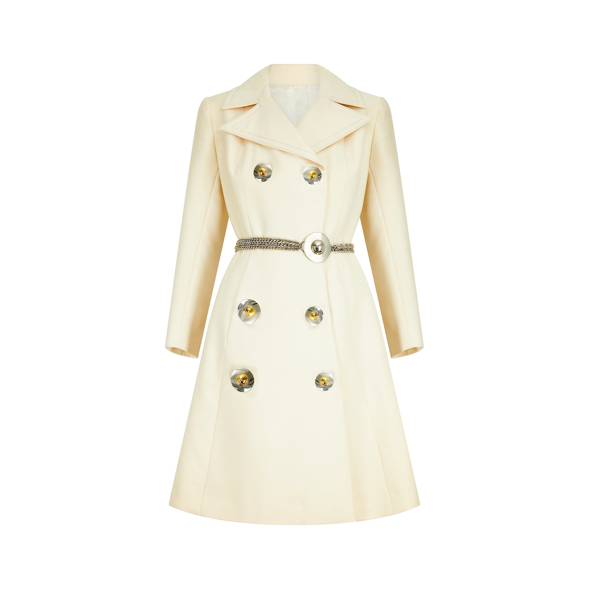 Unmarked, but possibly attributed to Pierre Cardin, this double-breasted coat features the space age detailing the Italian-French couturier was known for. Classically A-line tailored from cream wool with a bold tonal running stitch which edges the wide, notched lapels of the collar. The gold and silver-toned buttons are ornamental and the coat closes with large, covered popper fastenings. There are three smaller gold and silver buttons at each sleeve. The detachable silver-tone chain belt adds a playful, futuristic detail typical of late 1960s design and composed of three chains secured with a round polished buckle. There are in-seam slit pockets at the front and a vent at the rear hem. Lined in a fine quality rayon, this elegant coat is in fine vintage condition with virtually no signs of wear noted and no faults. A superb example of high-end space age fashion of the era and will fit sizes up to a UK 10 or US 6 best.