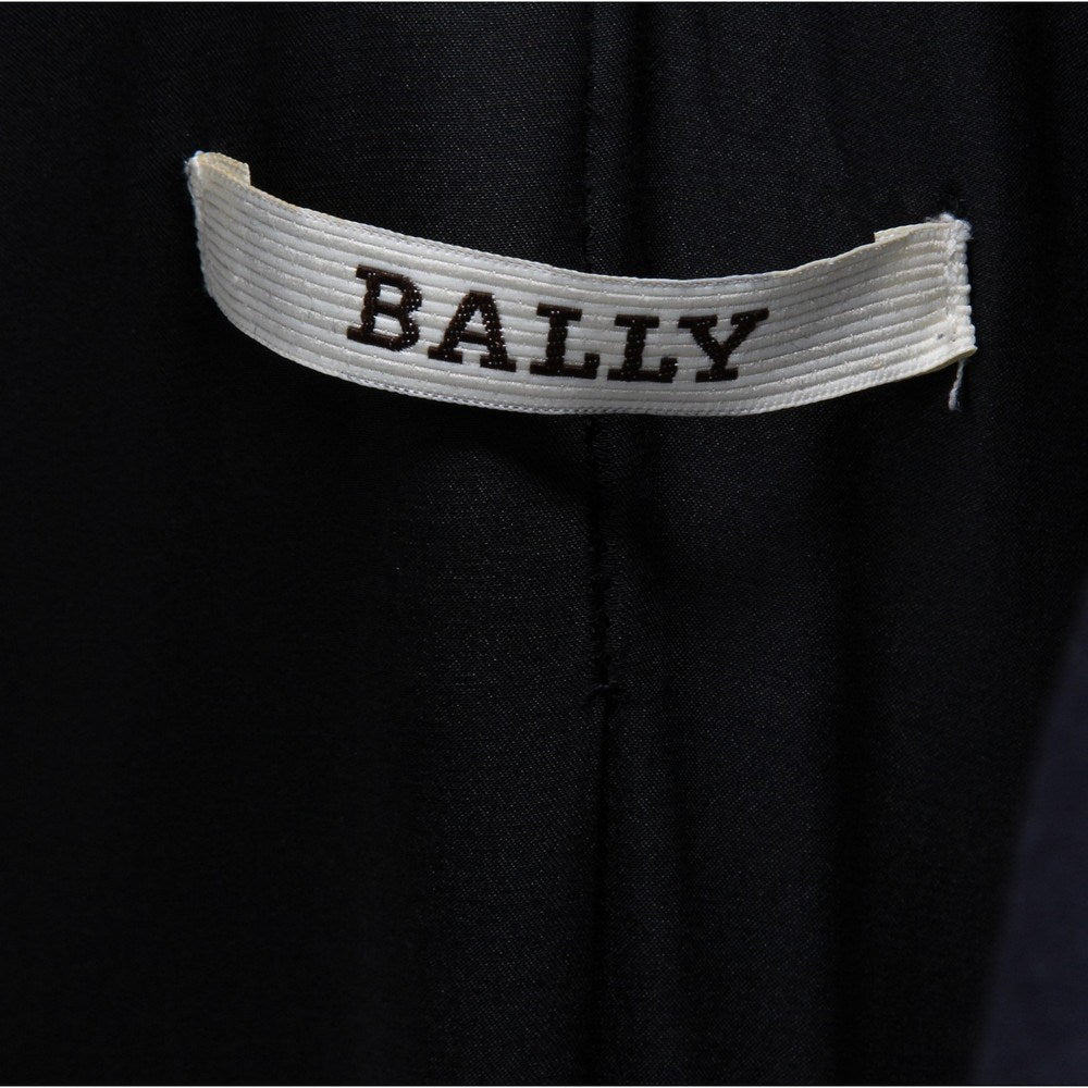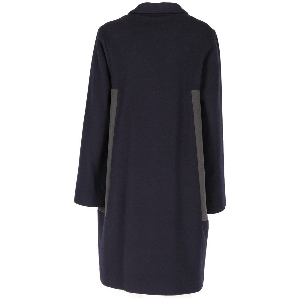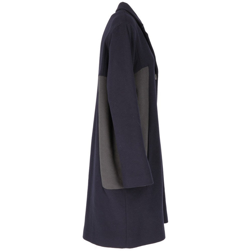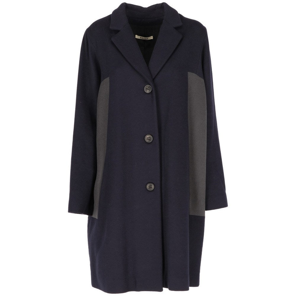 Bally bicolor wool midi coat. Blue base with geometrical grey lateral inserts. Lapel collar, frontal buttoned fastening with leather details. Two frontal welt pockets. Lined.