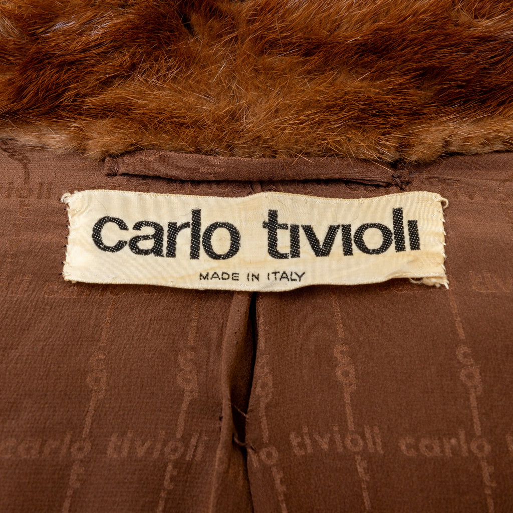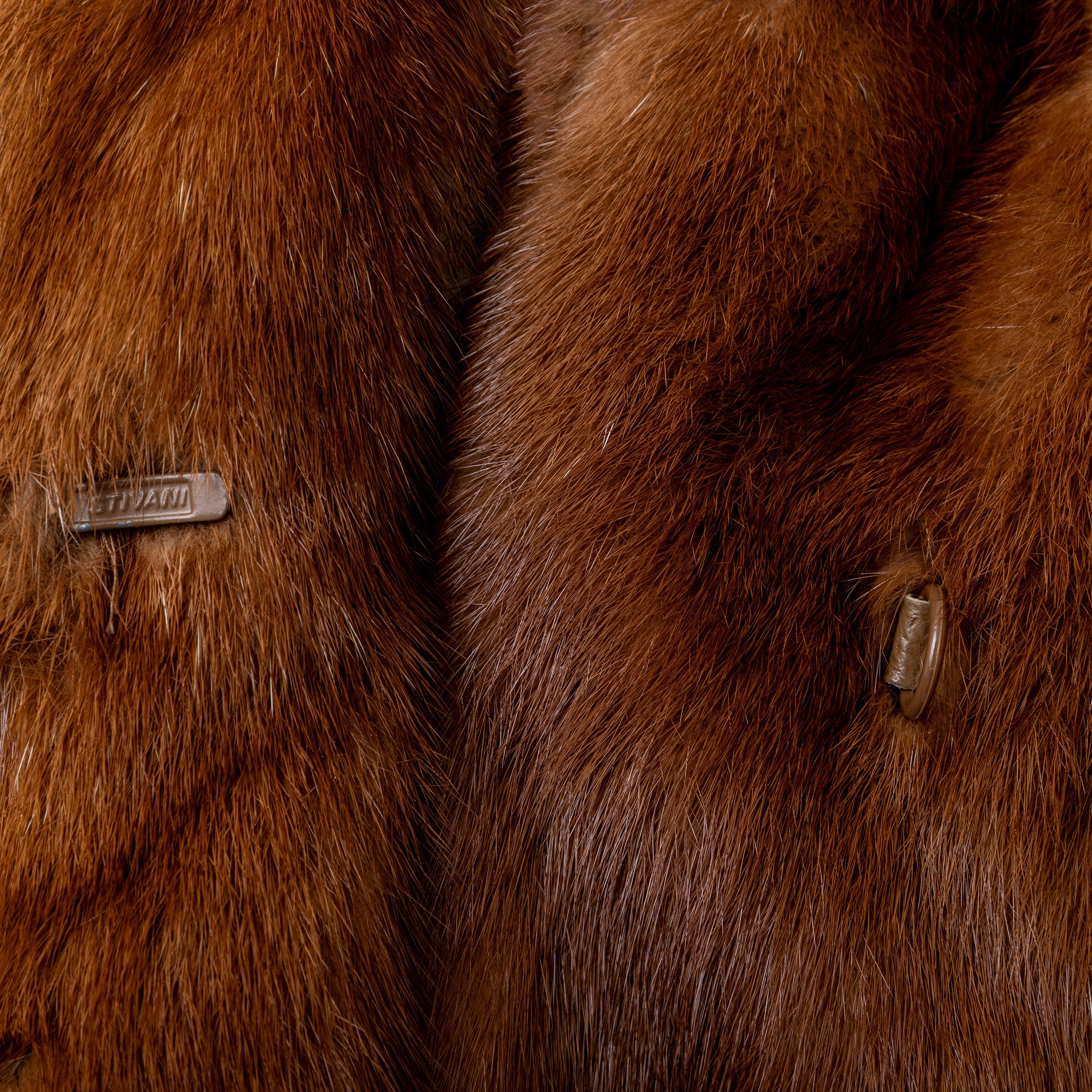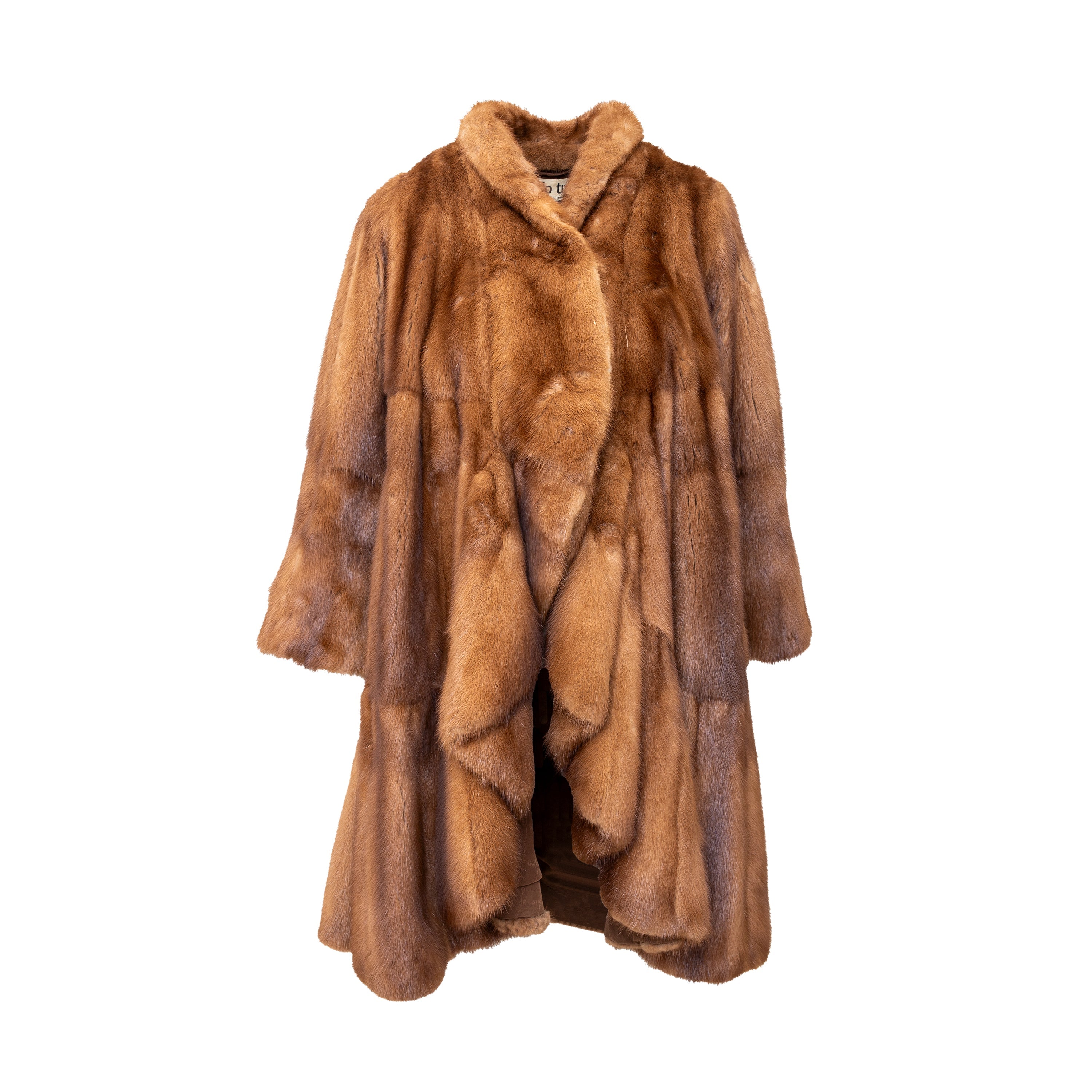Made of mink fur, with a brown logo printed silk lining. A beautiful cascading hem on the front opening with two hook closure. Has two front pockets. Fits like M.