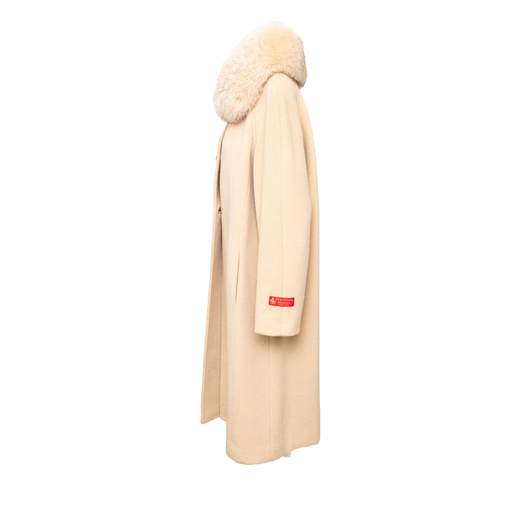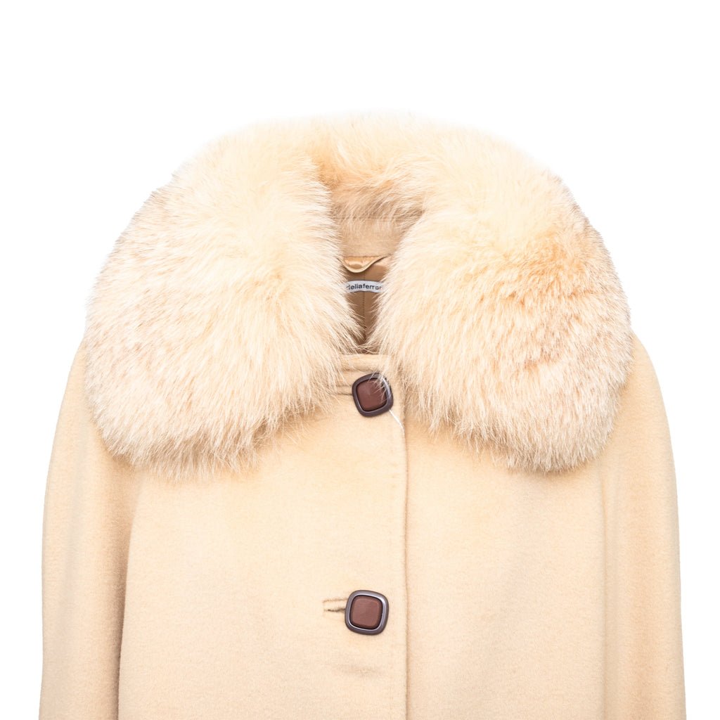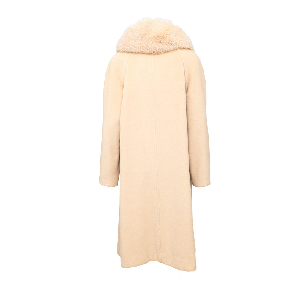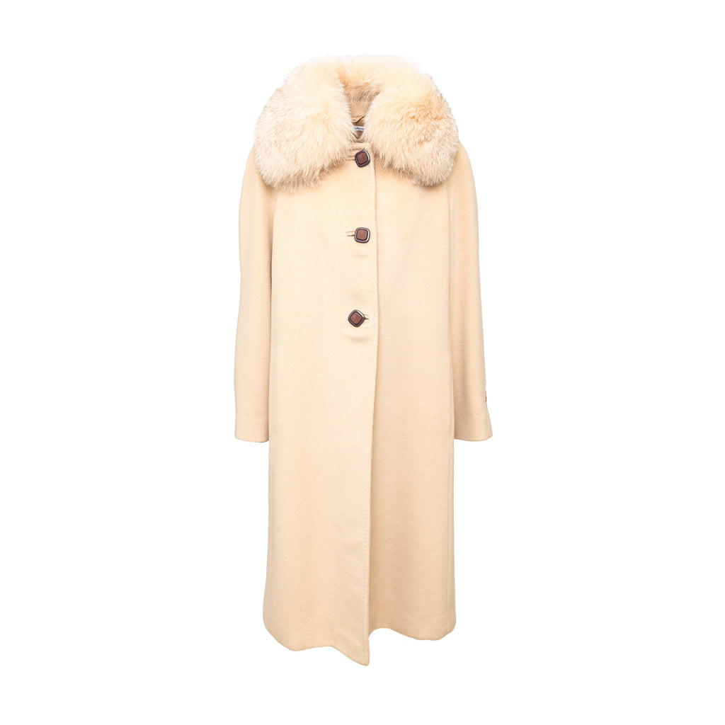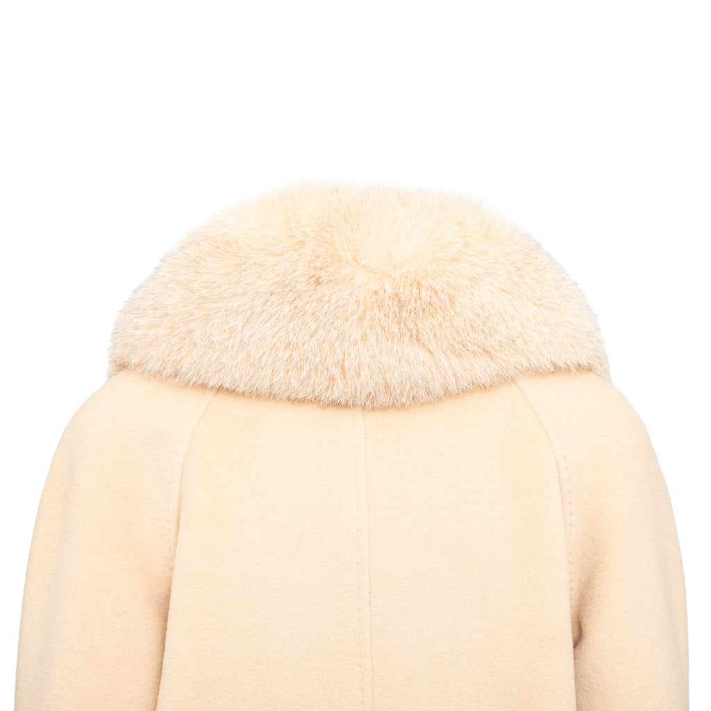 The Delia Ferrari Wool and Fur Coat in soft cream boasts a removable fox fur collar, long silhouette, and 3-button closure with wooden accents for a chic finish.