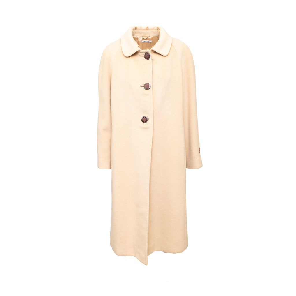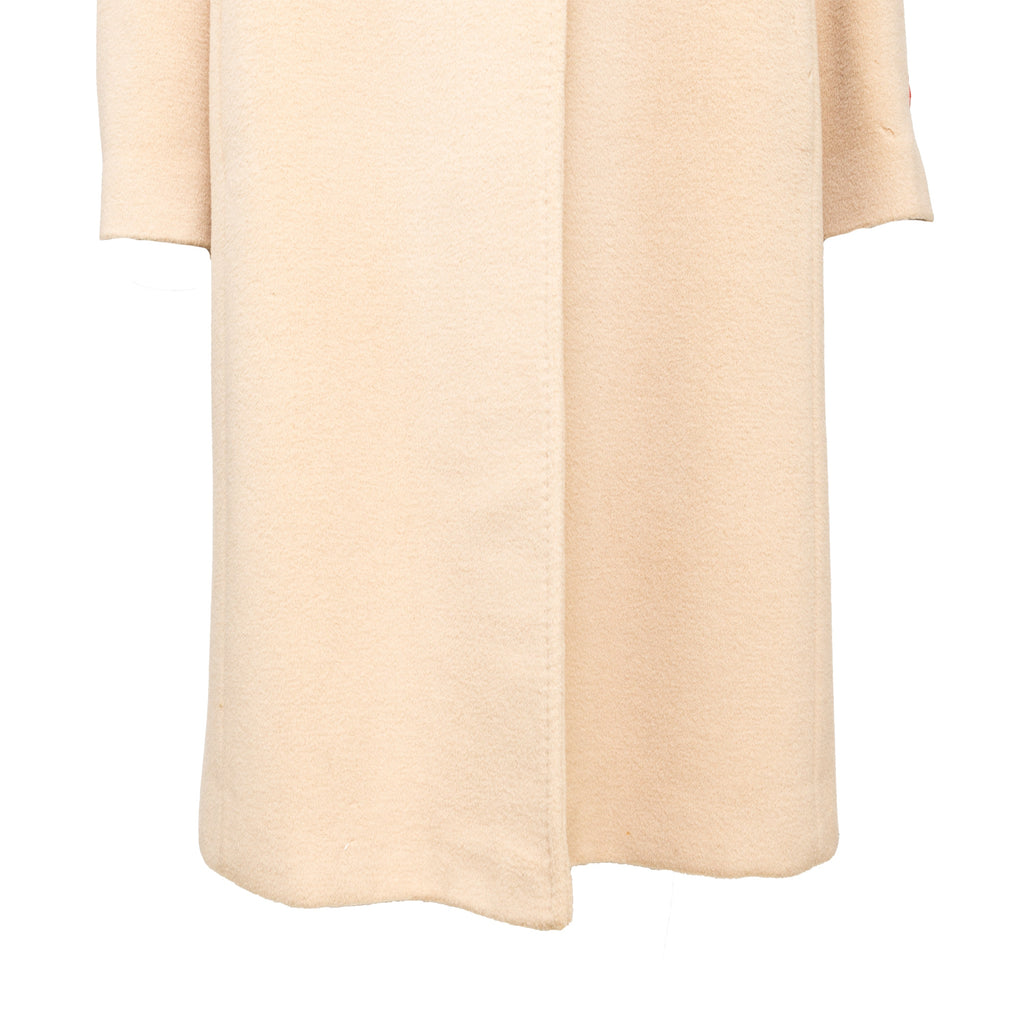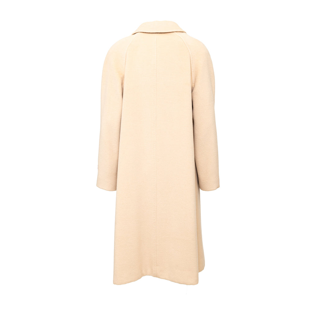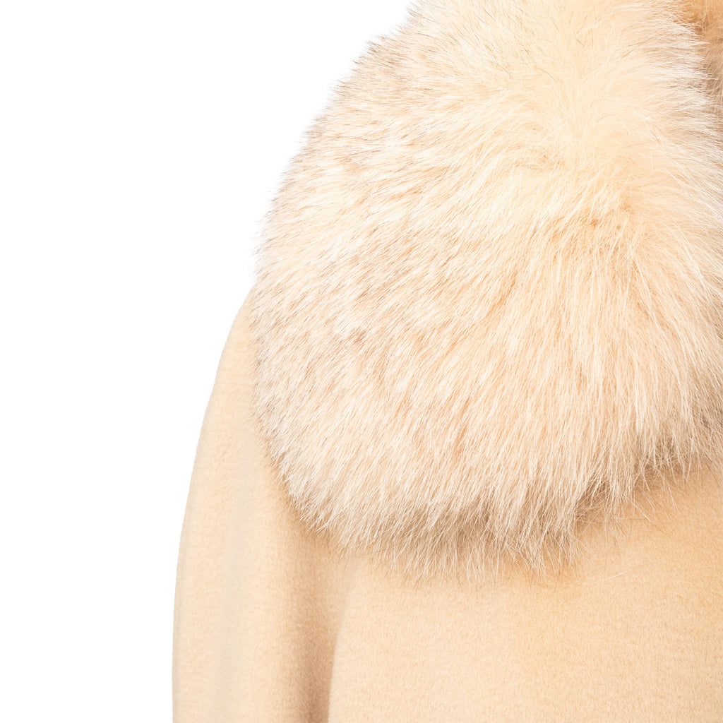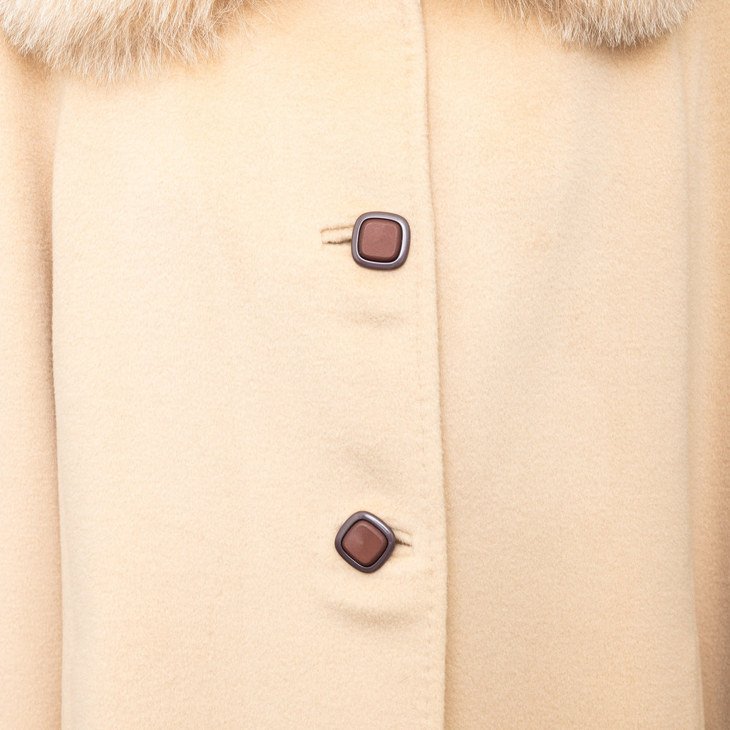 The Delia Ferrari Wool and Fur Coat in soft cream boasts a removable fox fur collar, long silhouette, and 3-button closure with wooden accents for a chic finish.