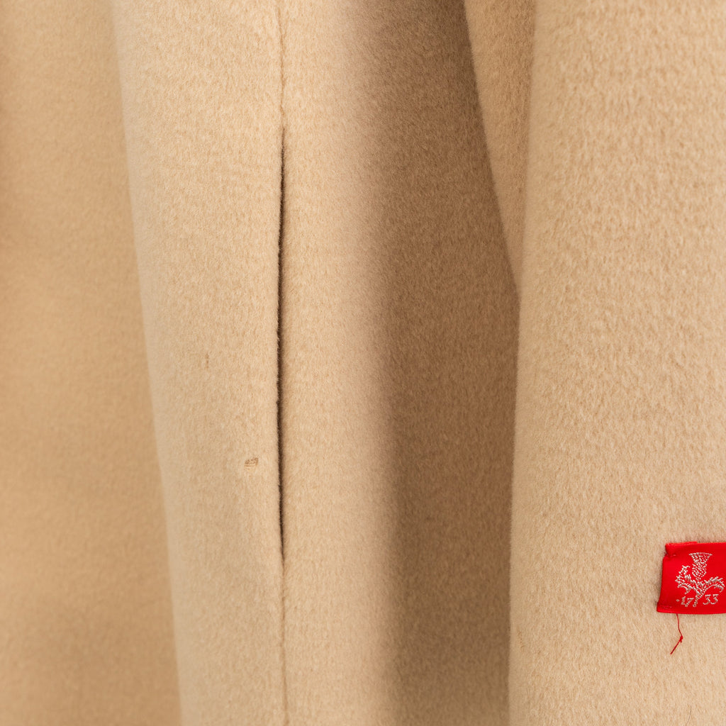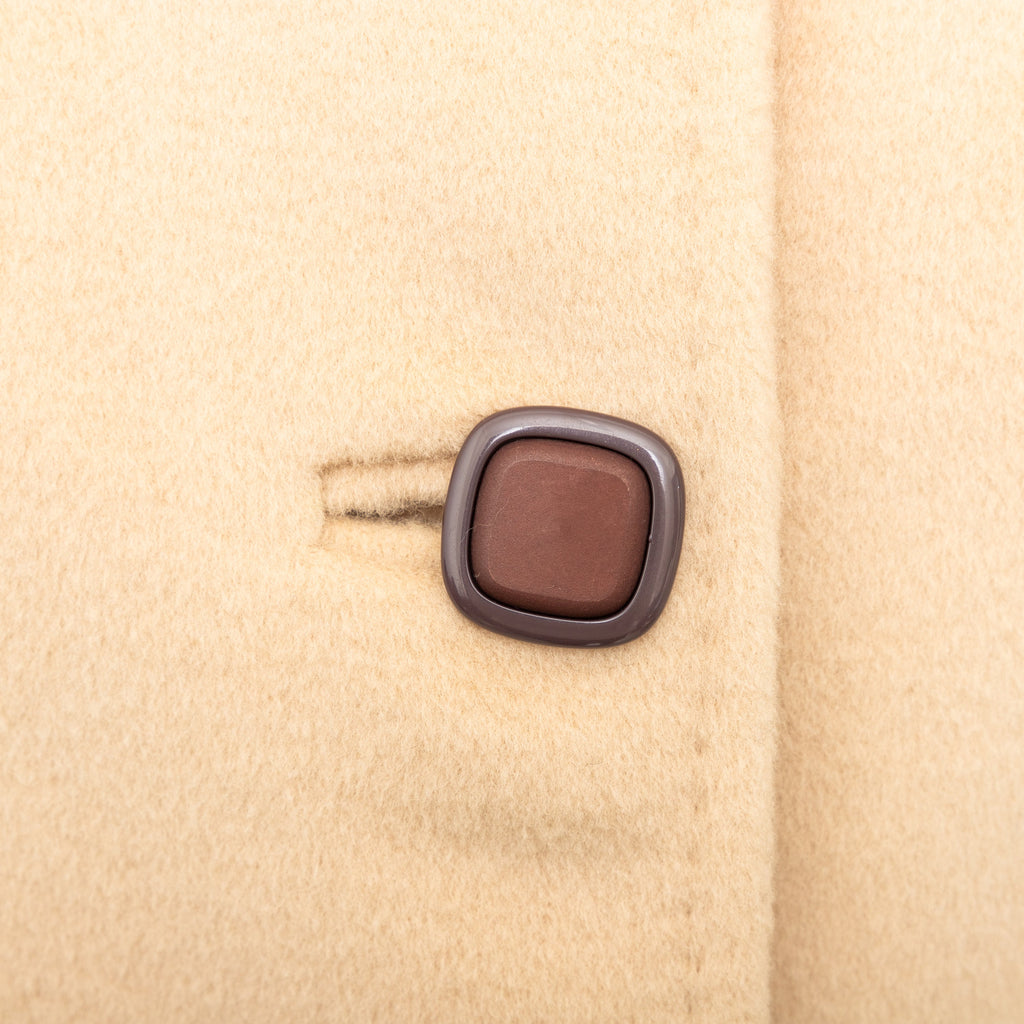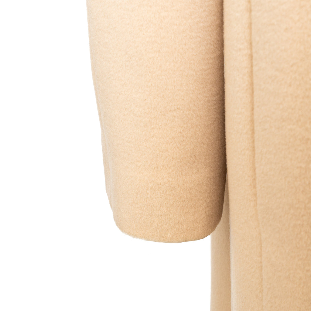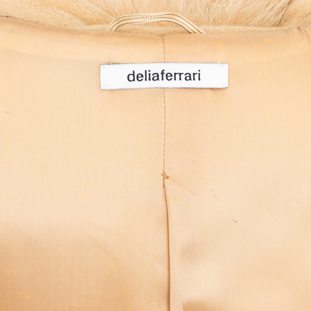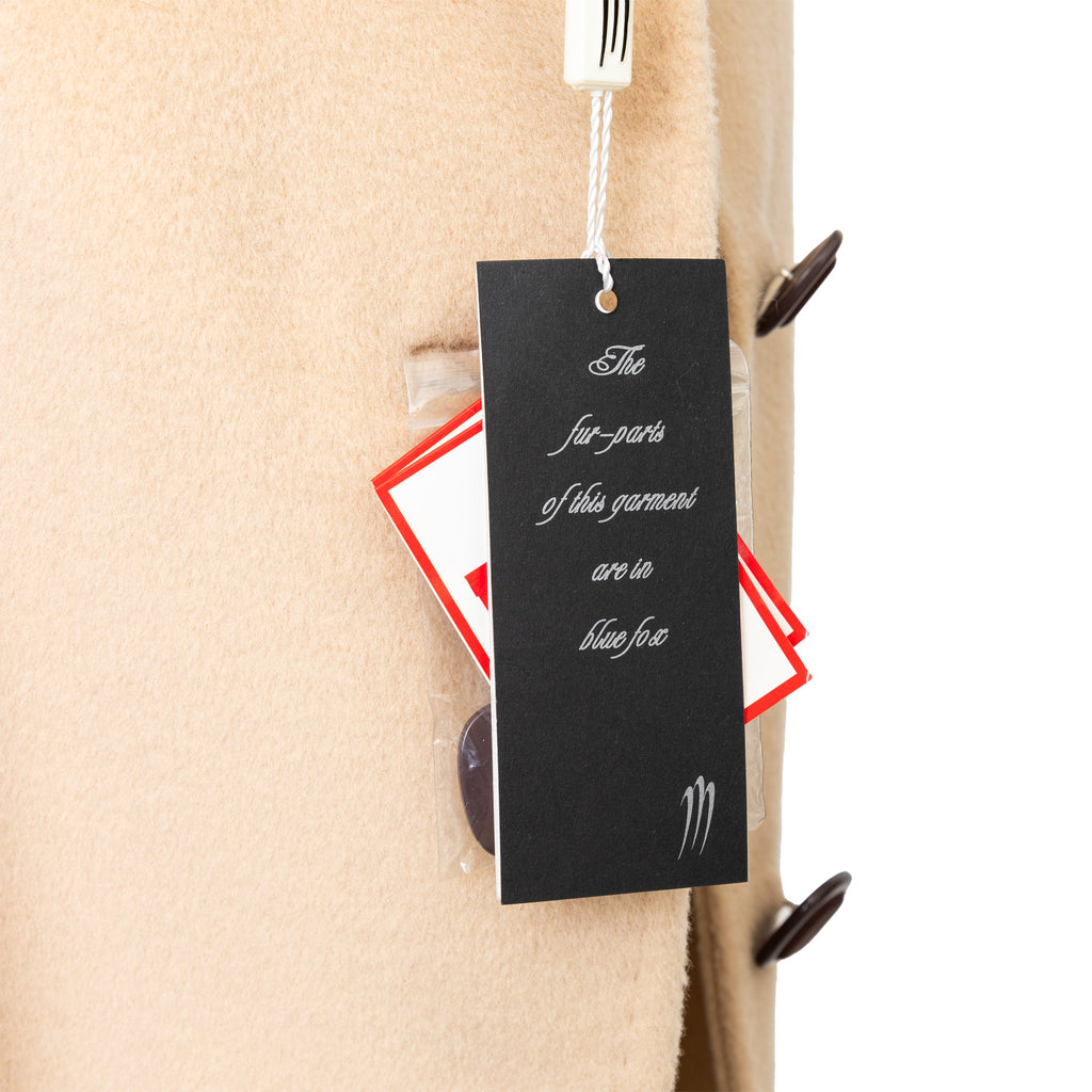 The Delia Ferrari Wool and Fur Coat in soft cream boasts a removable fox fur collar, long silhouette, and 3-button closure with wooden accents for a chic finish.