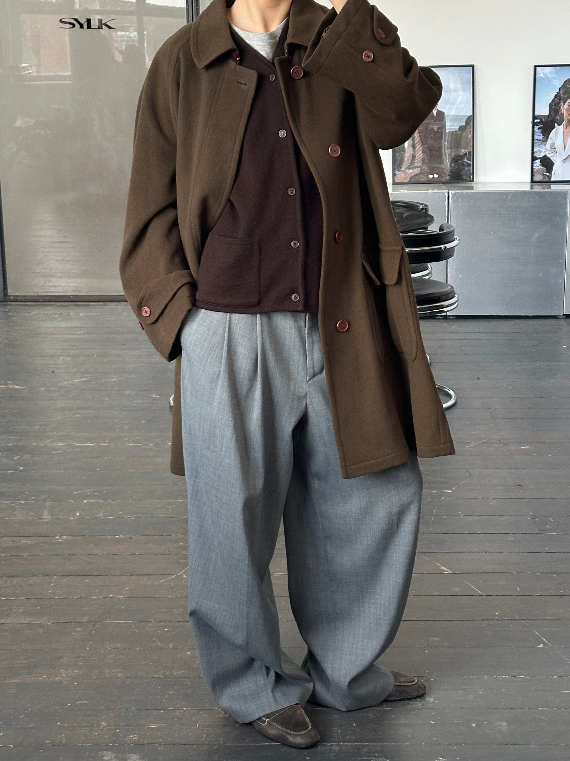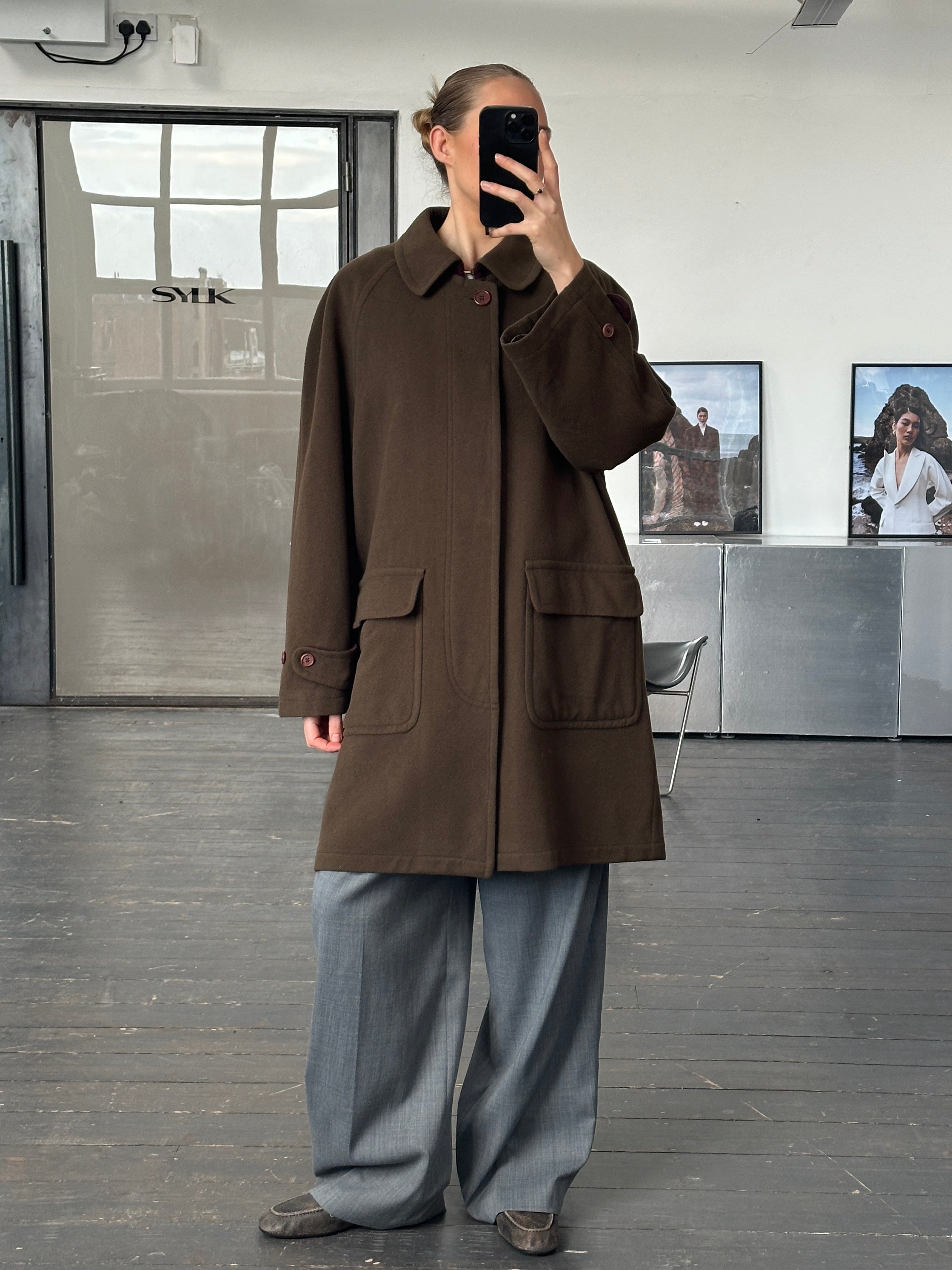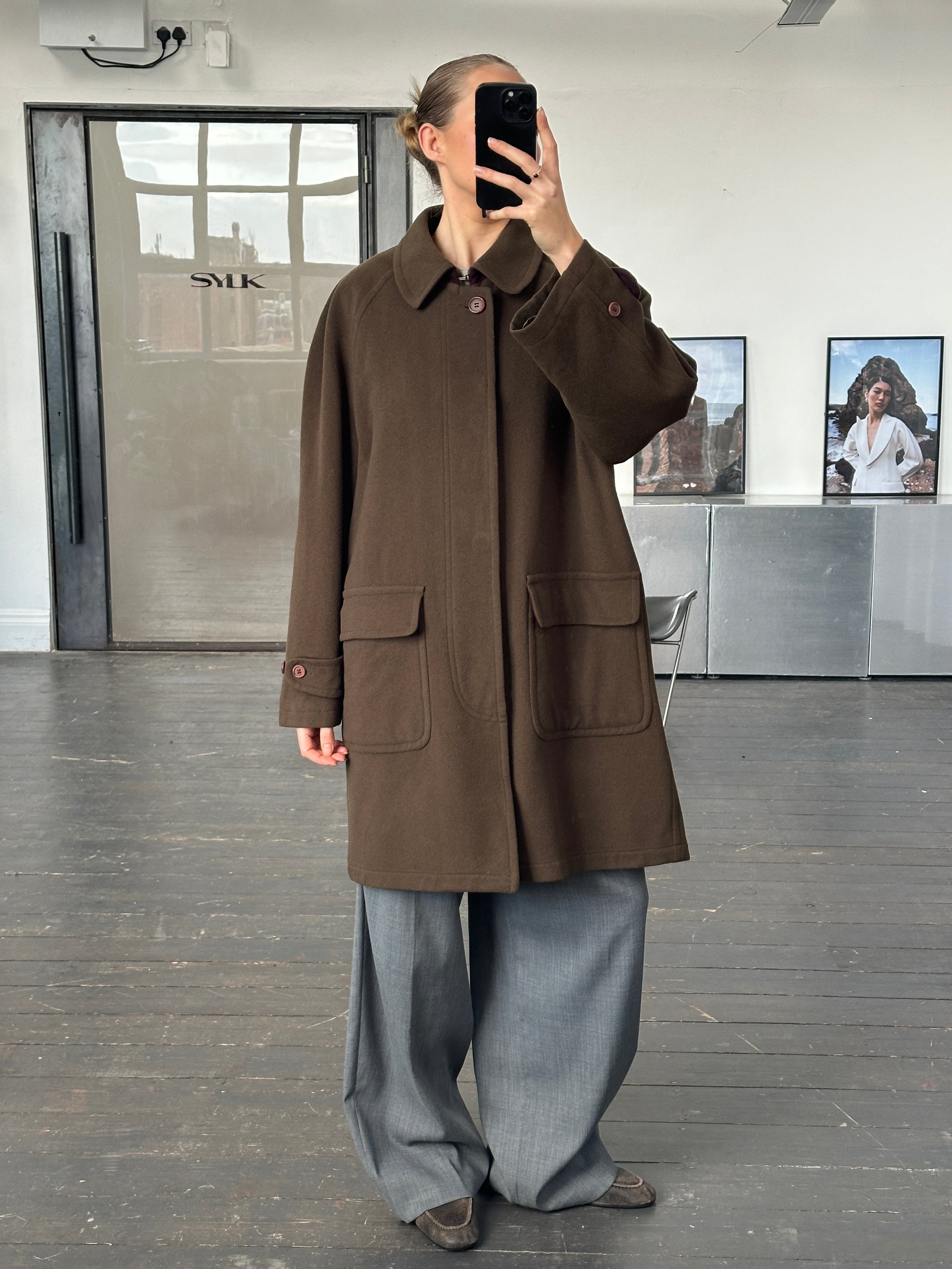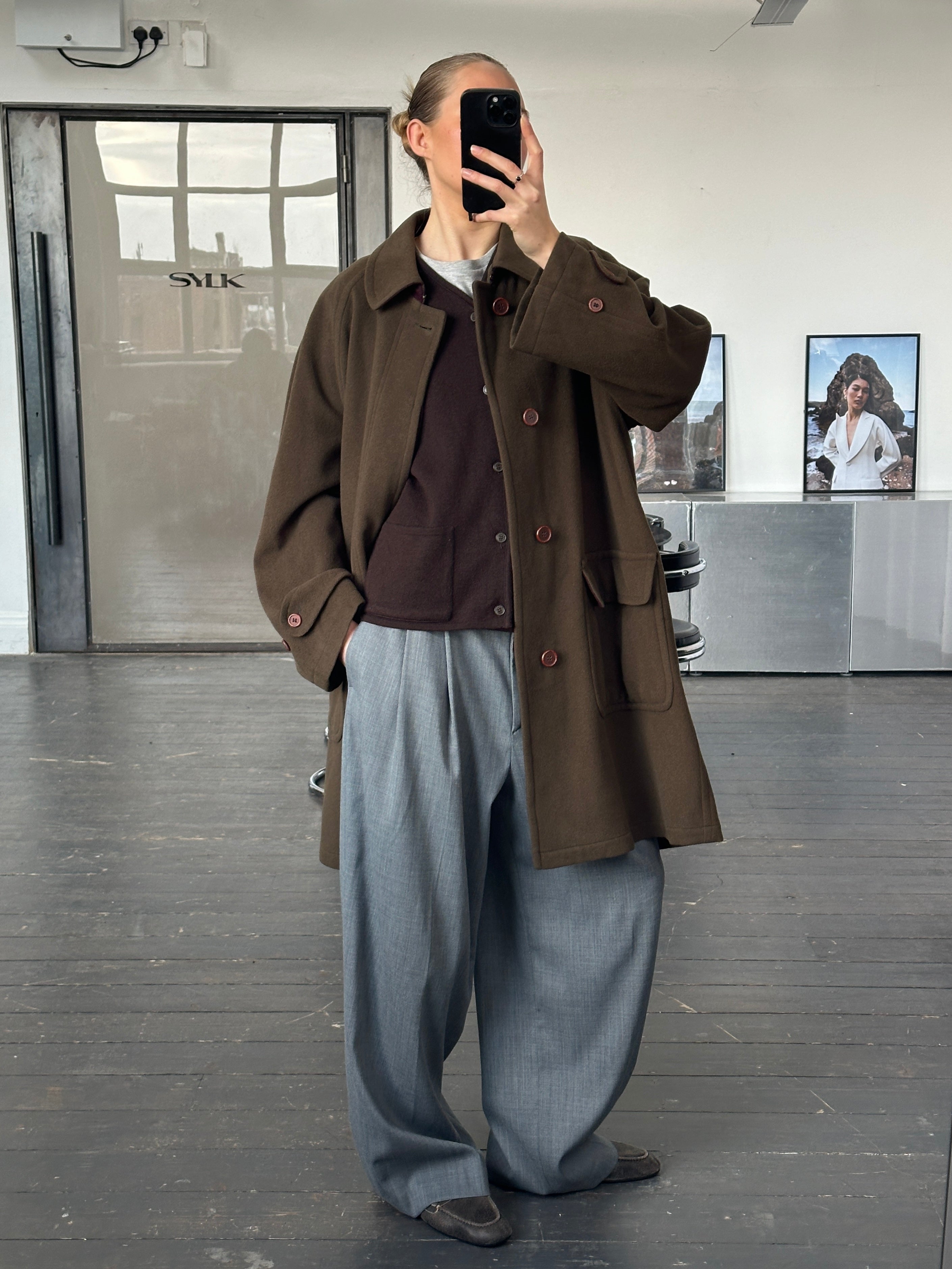 A minimalist Missoni Uomo 1990s coat in a muted khaki green tone, designed with a clean concealed placket and relaxed tailored shape. A refined everyday outerwear piece that balances Italian craftsmanship with understated structure.