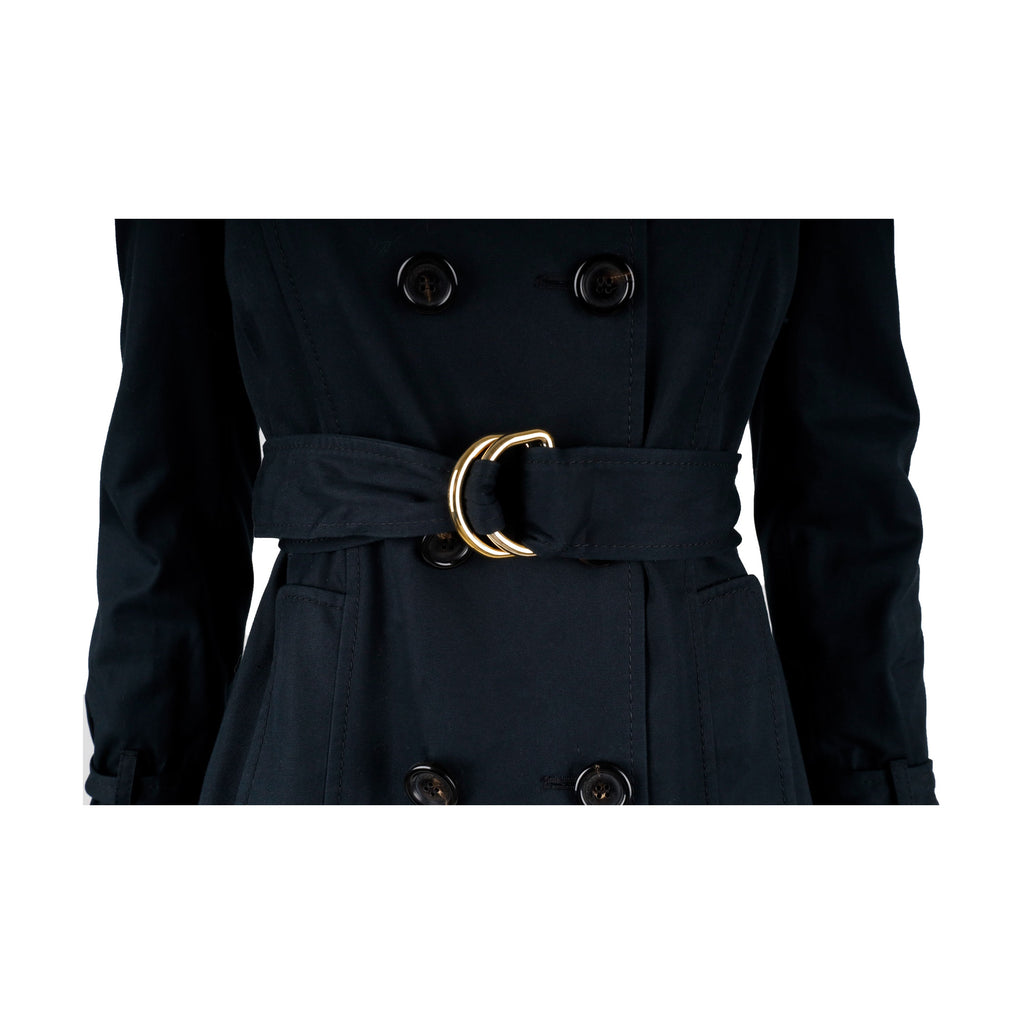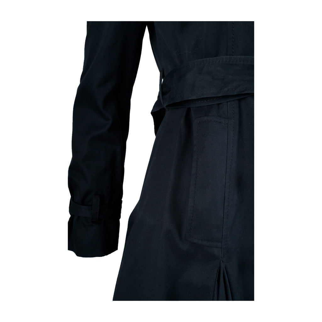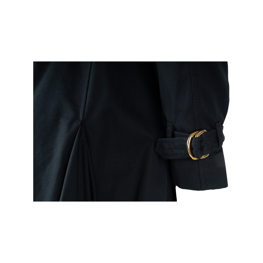 Expertly crafted with a fitted structure, this navy blue trench coat from Moschino's Resort 2012 collection is a twist on the classic design. Made of high-quality cotton, it features unique pleats at the hem and a adjustable belt for added style. Perfect for any fashionista.