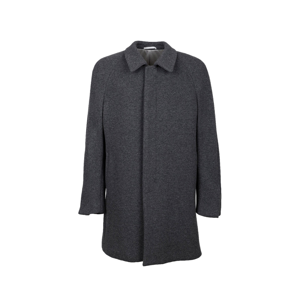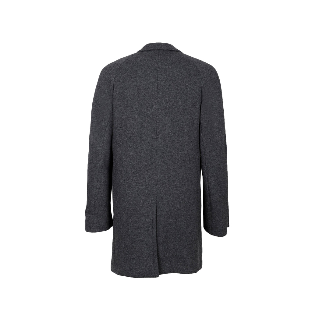This overcoat has an overall loose fit while being fitted in the shoulders. It can be worn over a blazer or directly on top of a sweater.