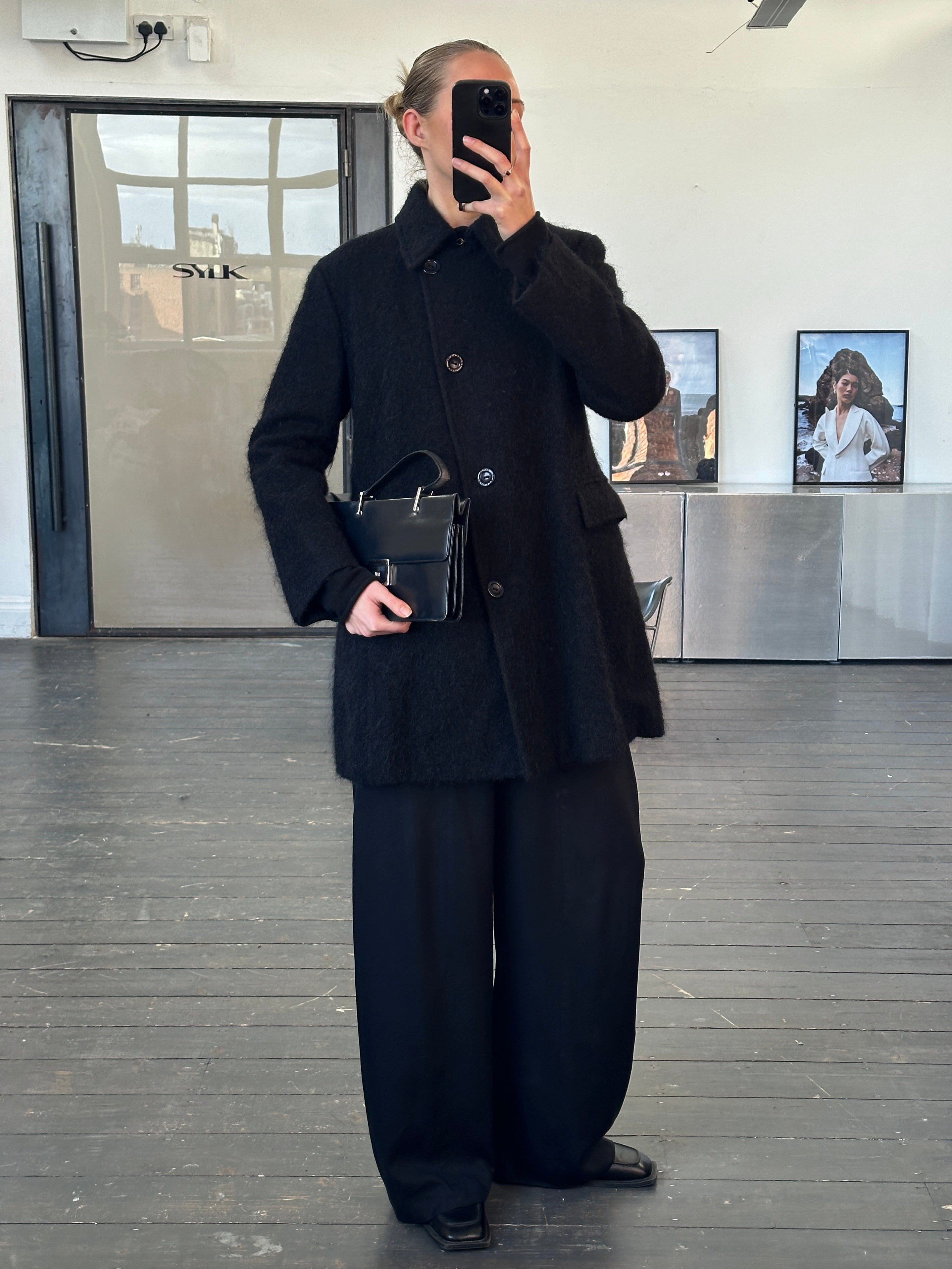 A softly structured 2000s Trussardi Jeans black coat with a fuzzy brushed finish, crafted in a rich virgin wool blend with mohair and alpaca. Clean single breasted styling and a straight silhouette give this piece a timeless, understated feel.