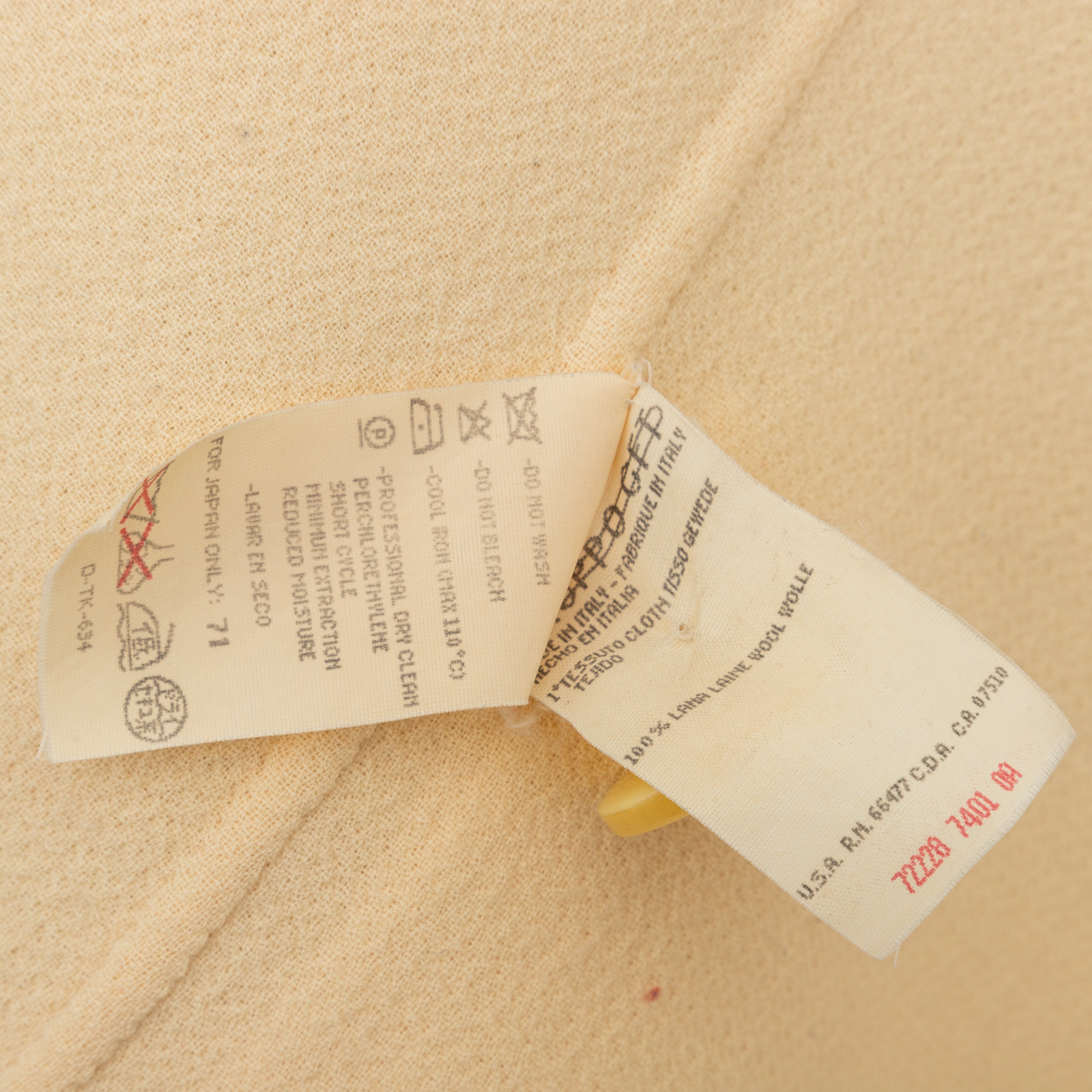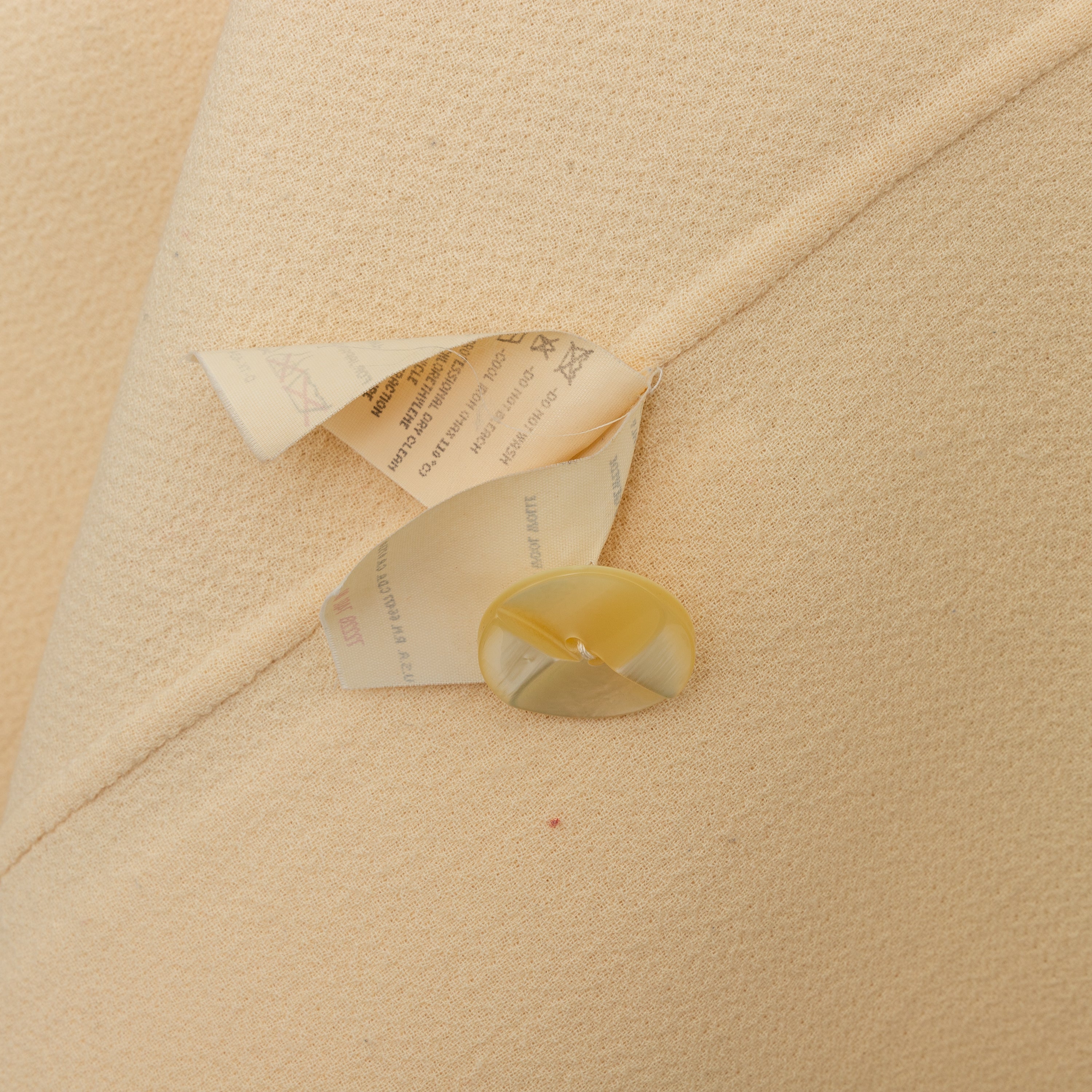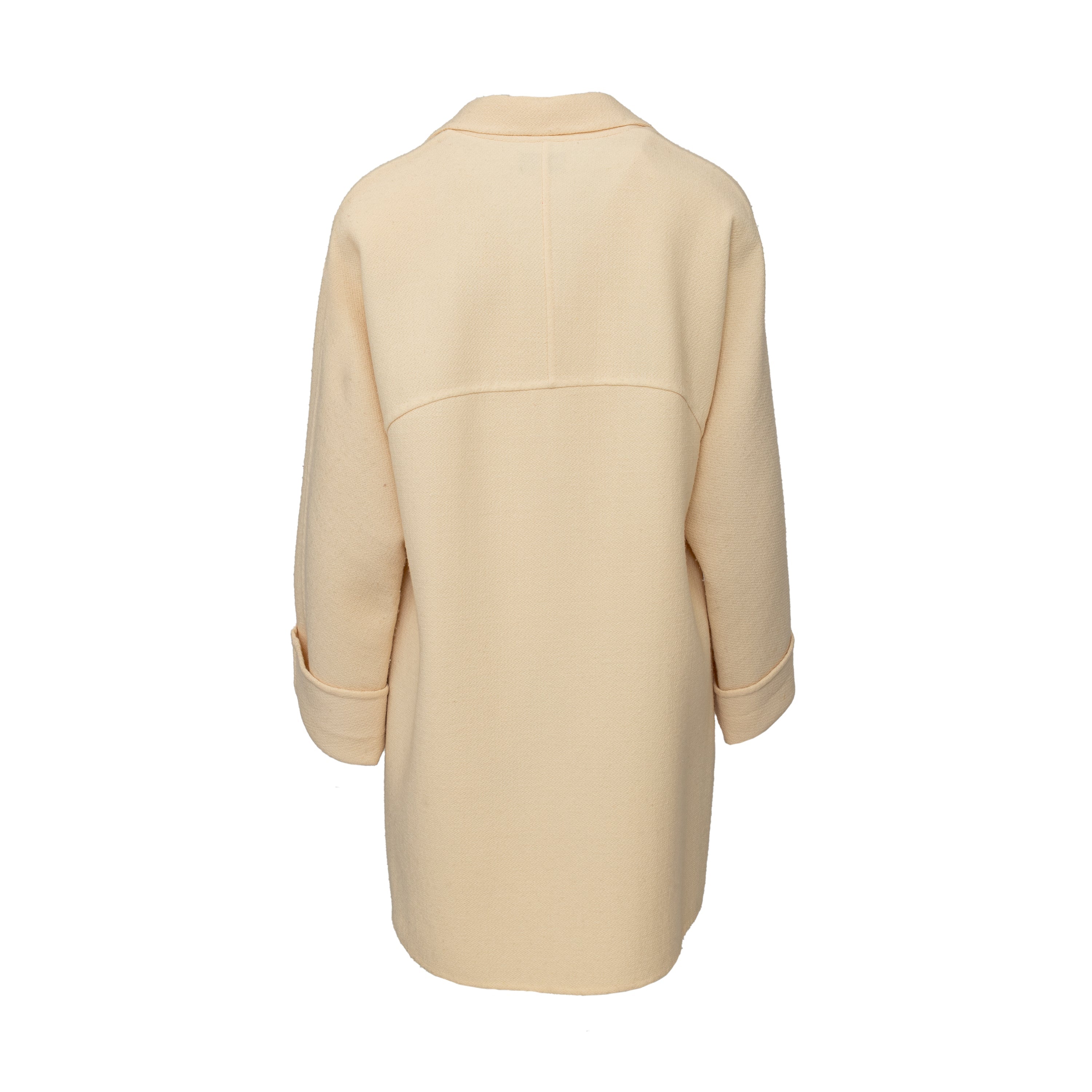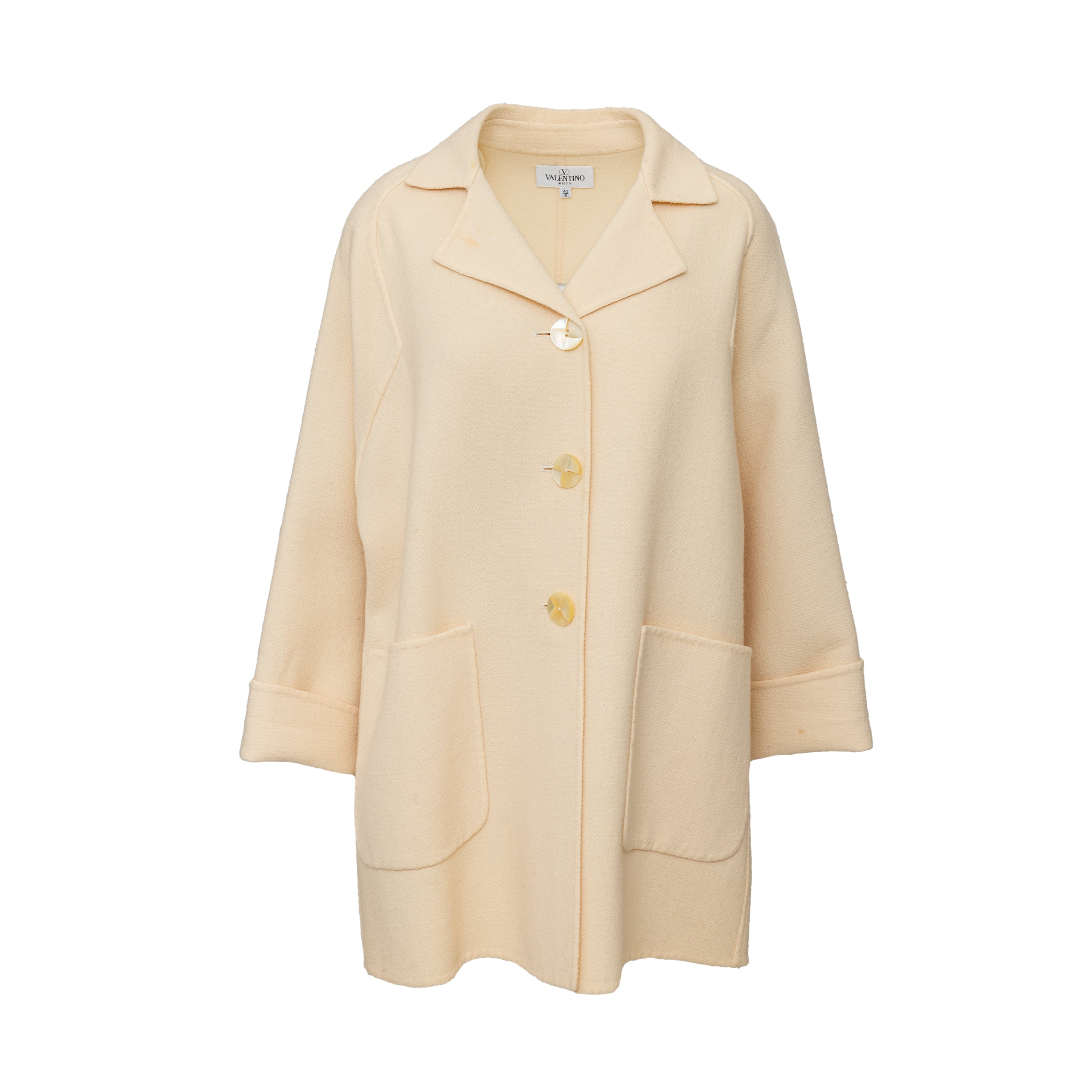 This vintage Valentino wool coat from the 90s Miss V label features a long fit. With a front button closure and two front patch pockets, it's both fashionable and functional. The sleeve hem can also be folded to add personal style. In a classic off white color, this coat is a must-have for any wardrobe.