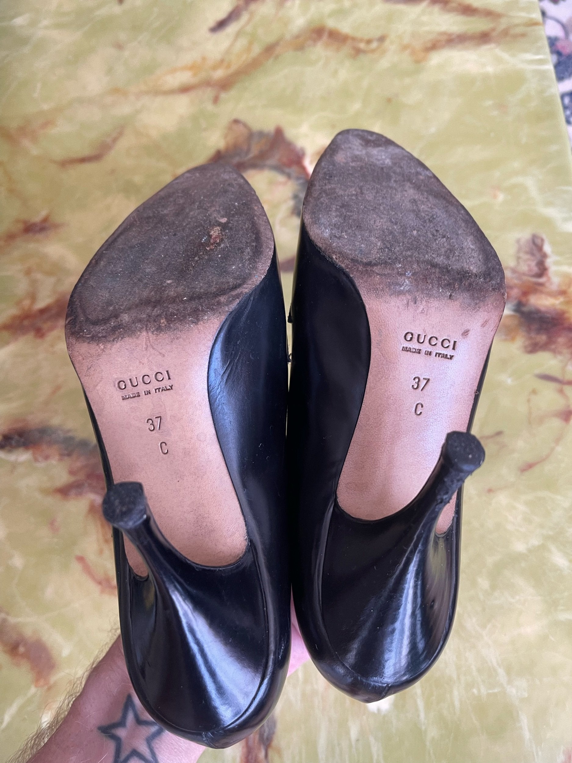 A true collector’s piece, these iconic Gucci Pointed Court Shoes from the 1996 collection are crafted in glossy black leather with signature gold snaffle detailing. Designed under Tom Ford’s legendary creative direction, this style was prominently featured in Gucci’s original advertising campaign, making it both a fashion statement and a piece of history.