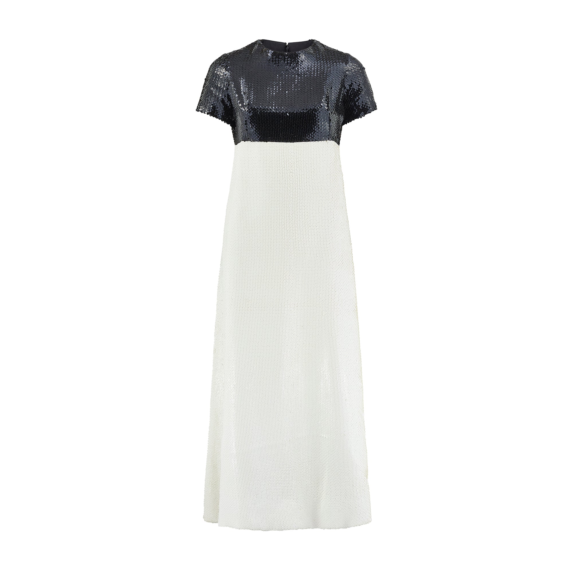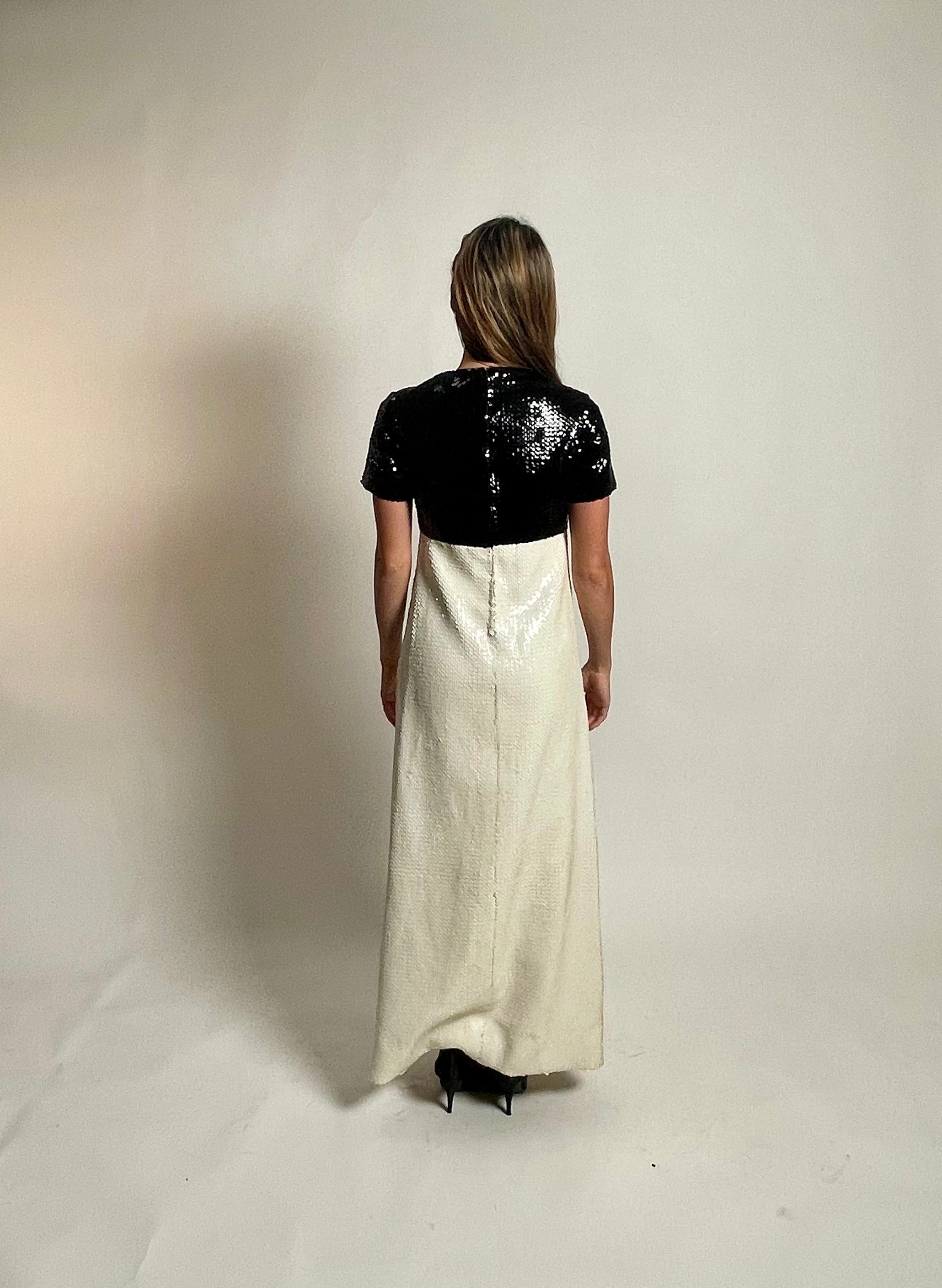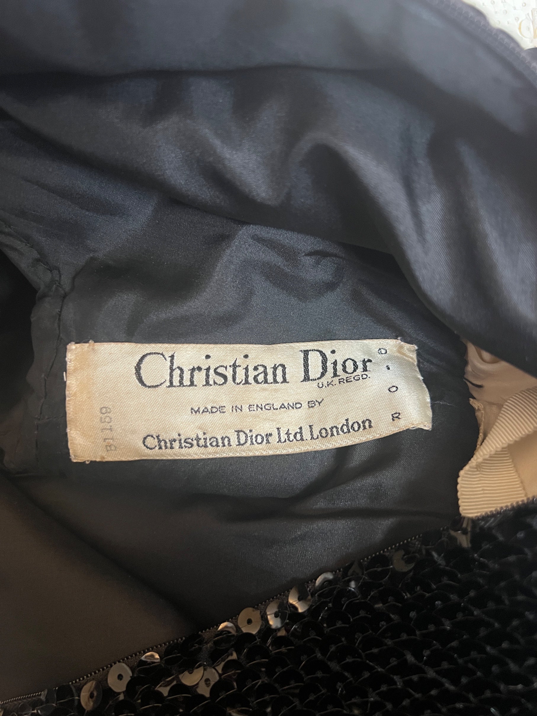 This elegant Christian Dior evening dress was retailed in their London branch during the late 1960s and may have been a special order from Paris. Designed when Marc Bohan was creative director, he is remembered for his clean, A-line silhouettes and remarkable 30 year tenure at the House. The dress is short-sleeved and cut from matte silk crepe de chine fabric with monochrome sequin embellishment across the entire gown. From the empire line of the bust, the dress is tailored from black matte silk which is topped with black mesh smothered in uniform rows of high-shine black sequins. From below the bust, the dress is adorned with slightly off-white sequins, sewn into white mesh atop white silk. The sweeping ankle length design fastens at the rear of the neck with a central, tonal hidden zip. There is a modesty strap inside which secures the bust. The original label reads “Made in England by Christian Dior Ltd London” and is numbered “B1159”.