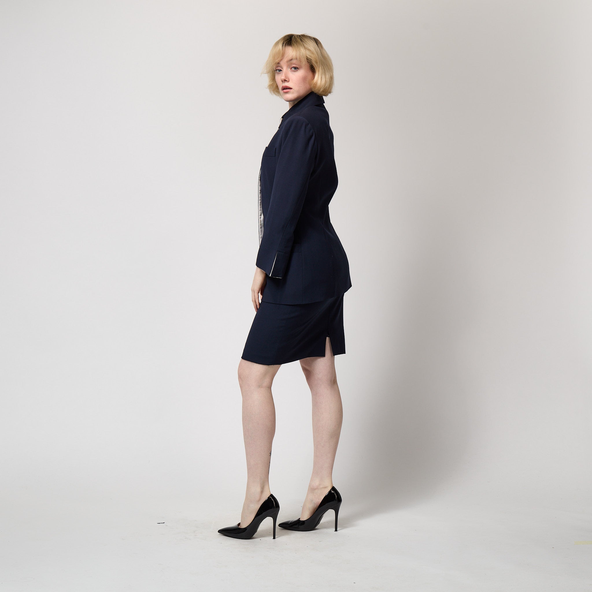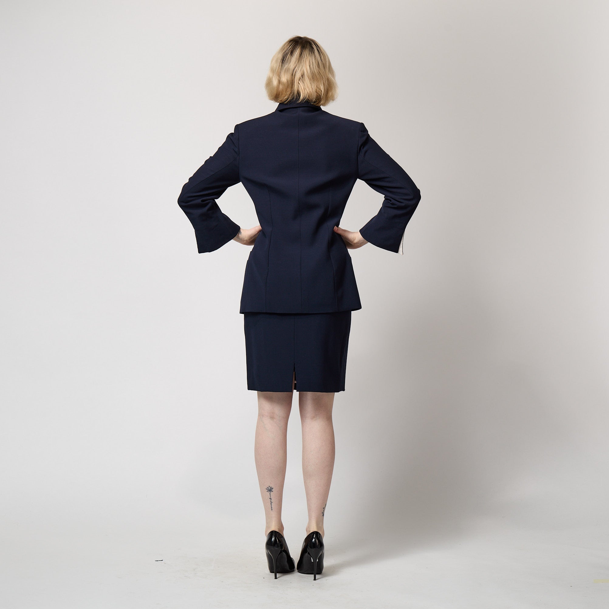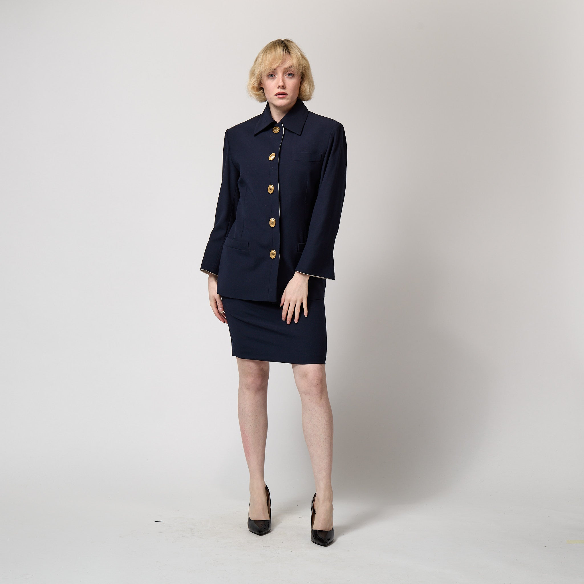 1990s Christian Dior Three Piece Navy Skirt Suit with Polka-Dot Blouse