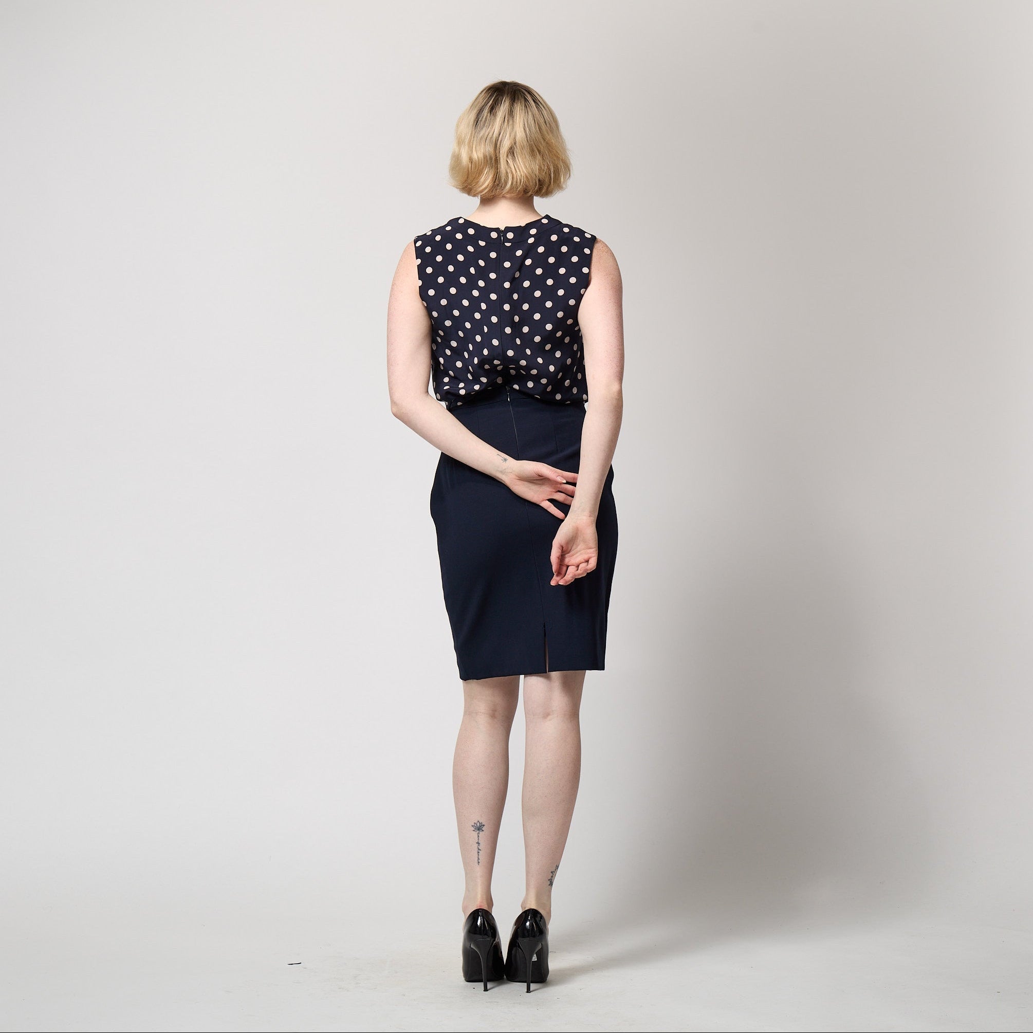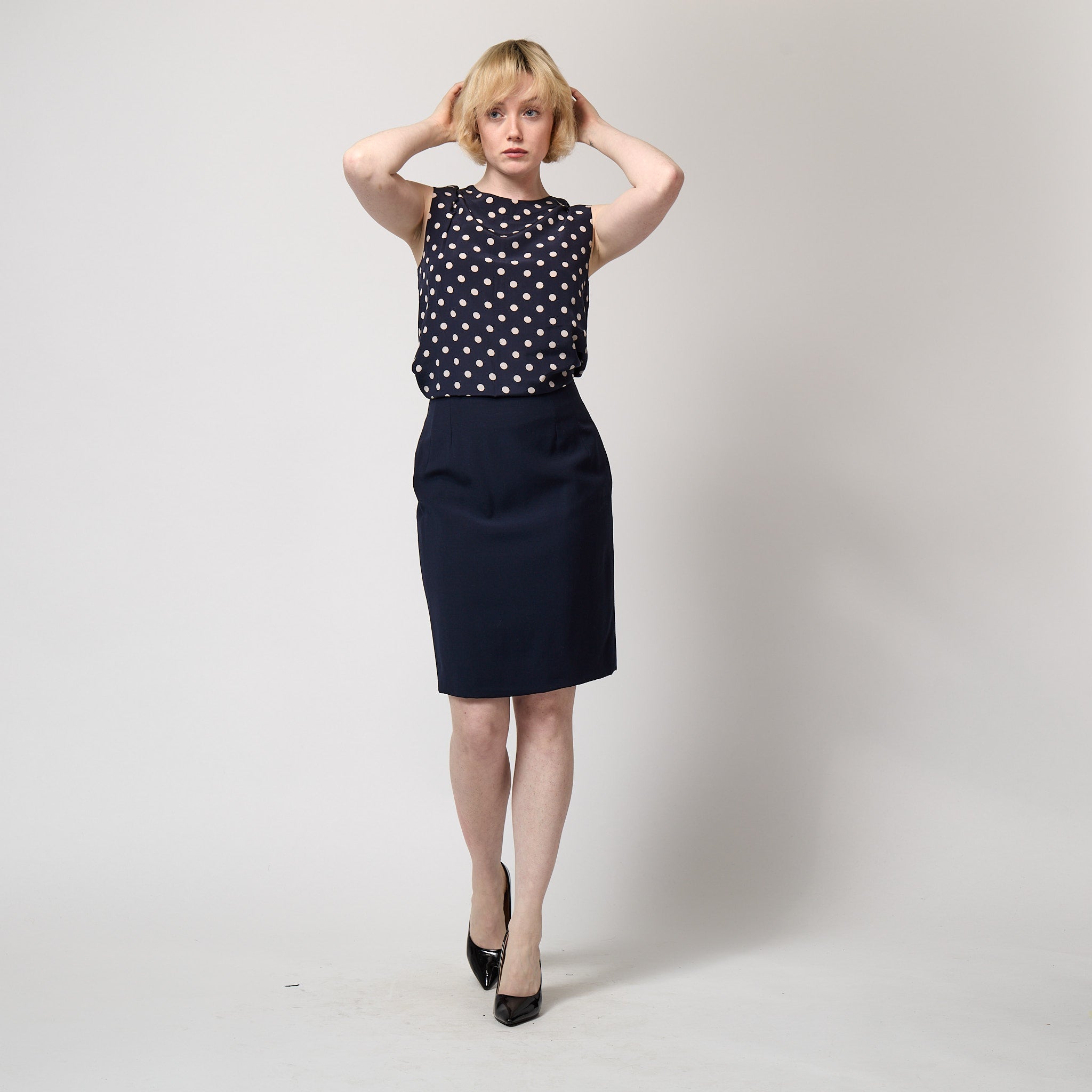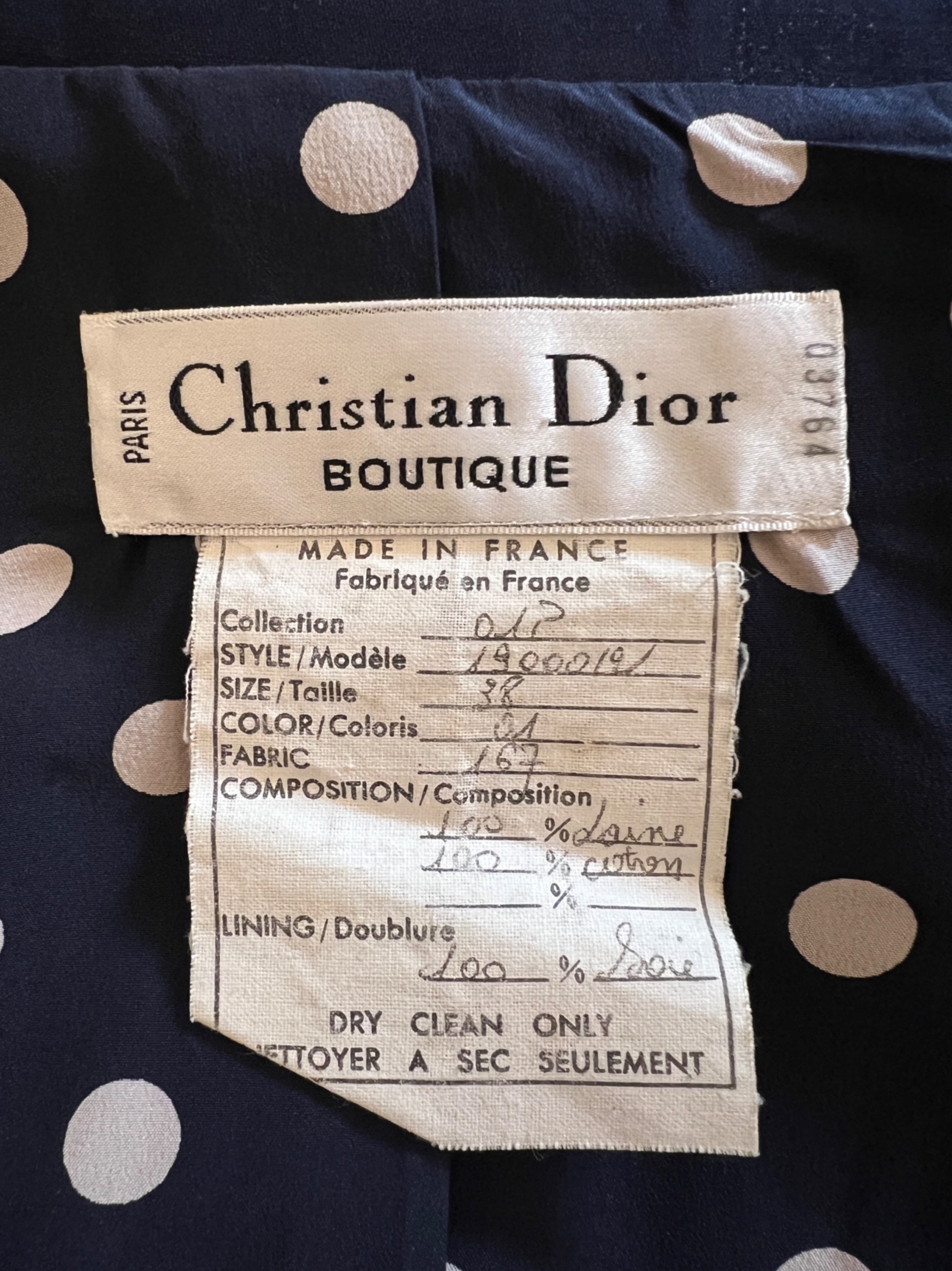 This early 1990s Christian Dior navy and white polka-dot three piece suit is comprised of a skirt, jacket and sleeveless top. The ensemble would have been designed by Gianfranco Ferre during his eight year tenure as Creative Director of the House. The jacket is pristinely tailored from a smooth navy wool and lined with a playful white-on-navy polka-dot silk. It has a single-breasted cut which fastens with five oval gold-tone buttons engraved with the “CD” logo. The silhouette is elegant, showcasing a slight nipped-in waist and elongated length with three flap pockets to the front. The sleeves are split and trimmed internally with ribbed white ribbed cotton, as are the inside of the lapels. The skirt is cut to a knee-length pencil silhouette. It is lined in coordinating polka-dot silk and fastens at the back with a hook-and-eye clasp and hidden tonal zip. The inside of the waistband is lined in ribbed white cotton. The final piece in this ensemble is a sleeveless blouse in navy and white polka-dot silk - to match the lining of the jacket and skirt. The top has a relaxed, straight shape and fastens at the back of the neck with a hidden tonal zip and hook-and-eye clasp. The label reads “Christian Dior Boutique Paris” and is numbered. We have attached an advertising campaign for Christian Dior makeup from Autumn-Winter 1994, featuring the exact same design as an earring.