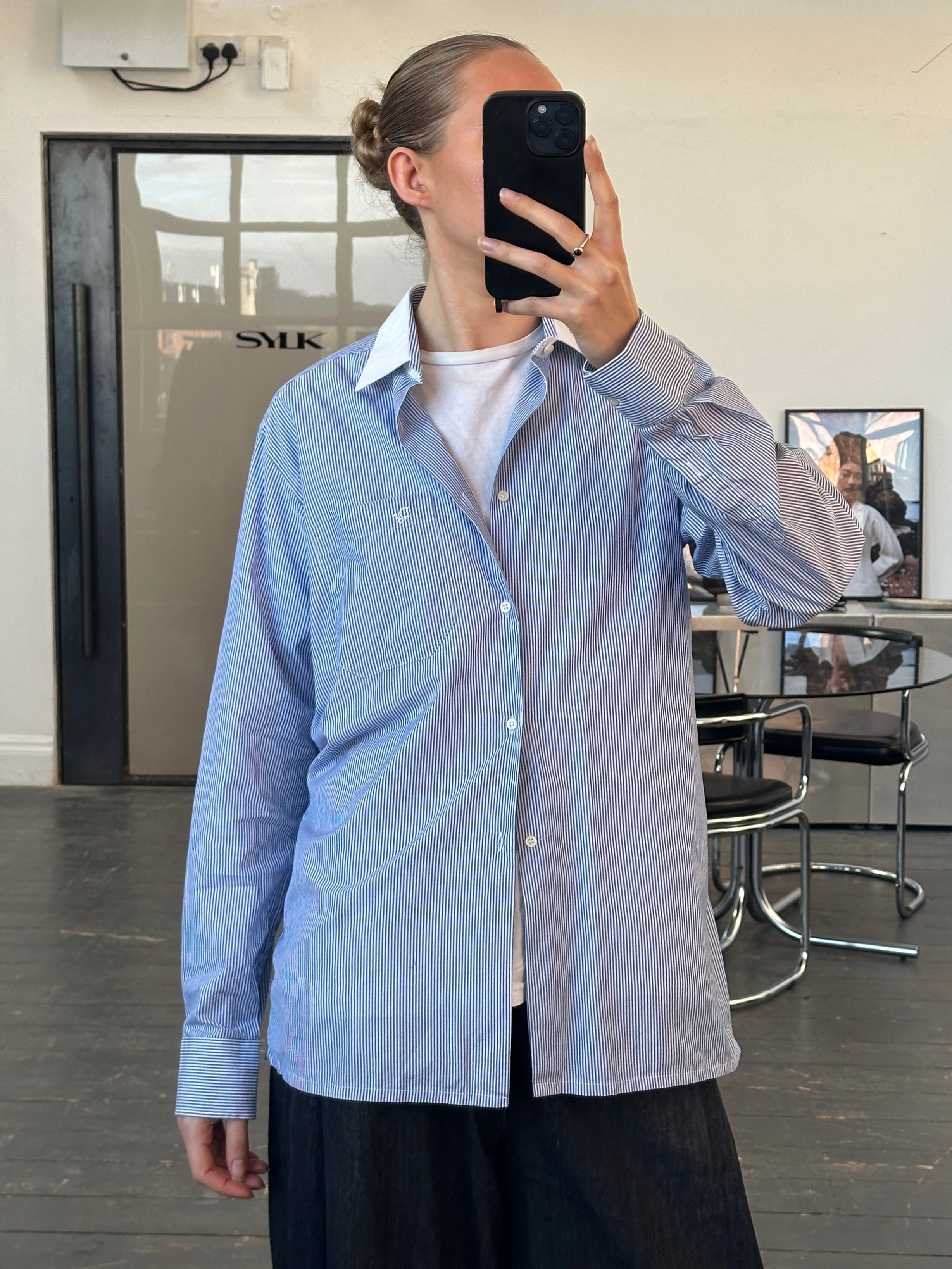 Vintage 1980s Christian Dior Monsieur shirt in a blue stripe pattern with a crisp white contrast collar. Crafted in France from 100% cotton, offering a lightweight clean drape ideal for everyday wear.