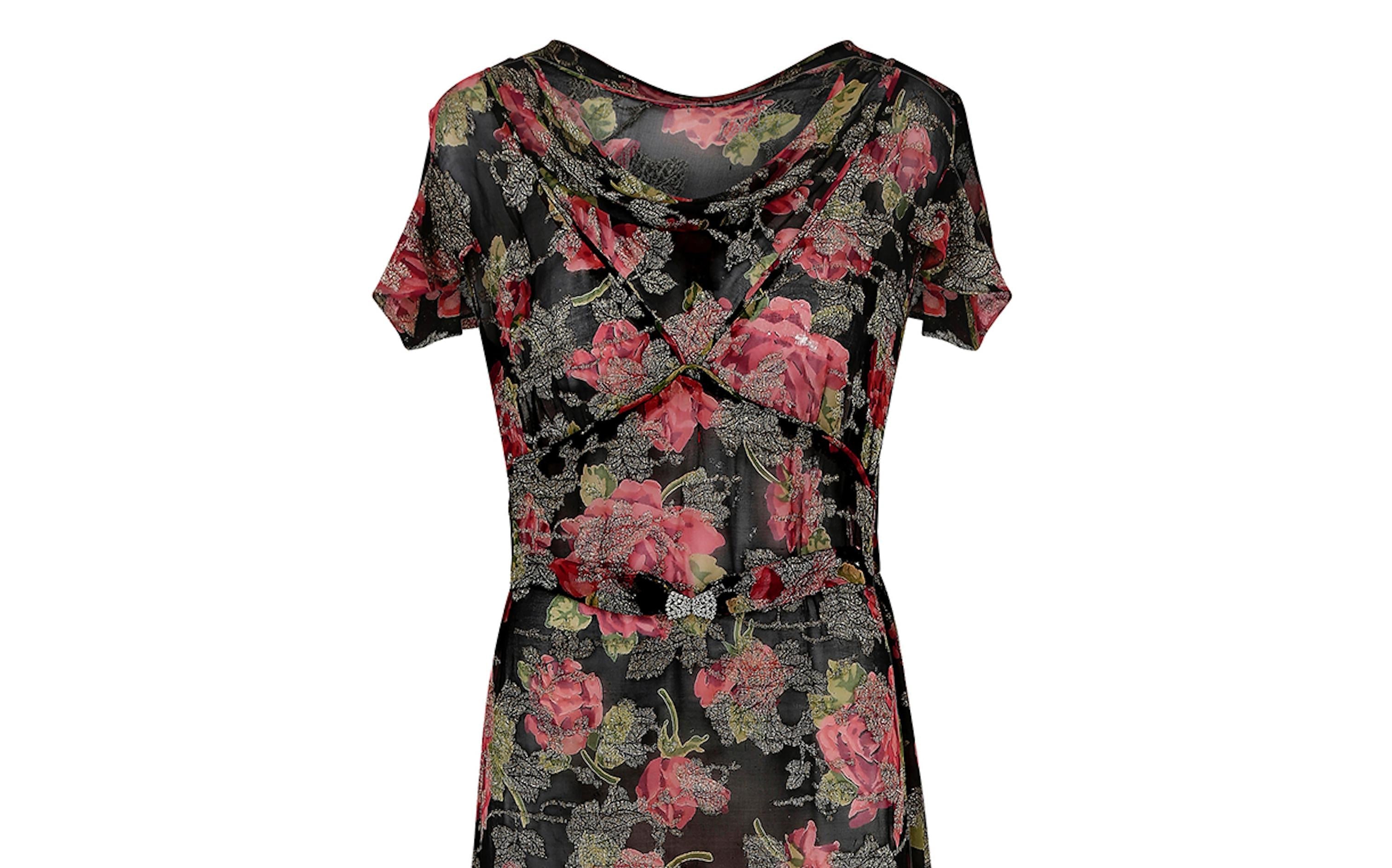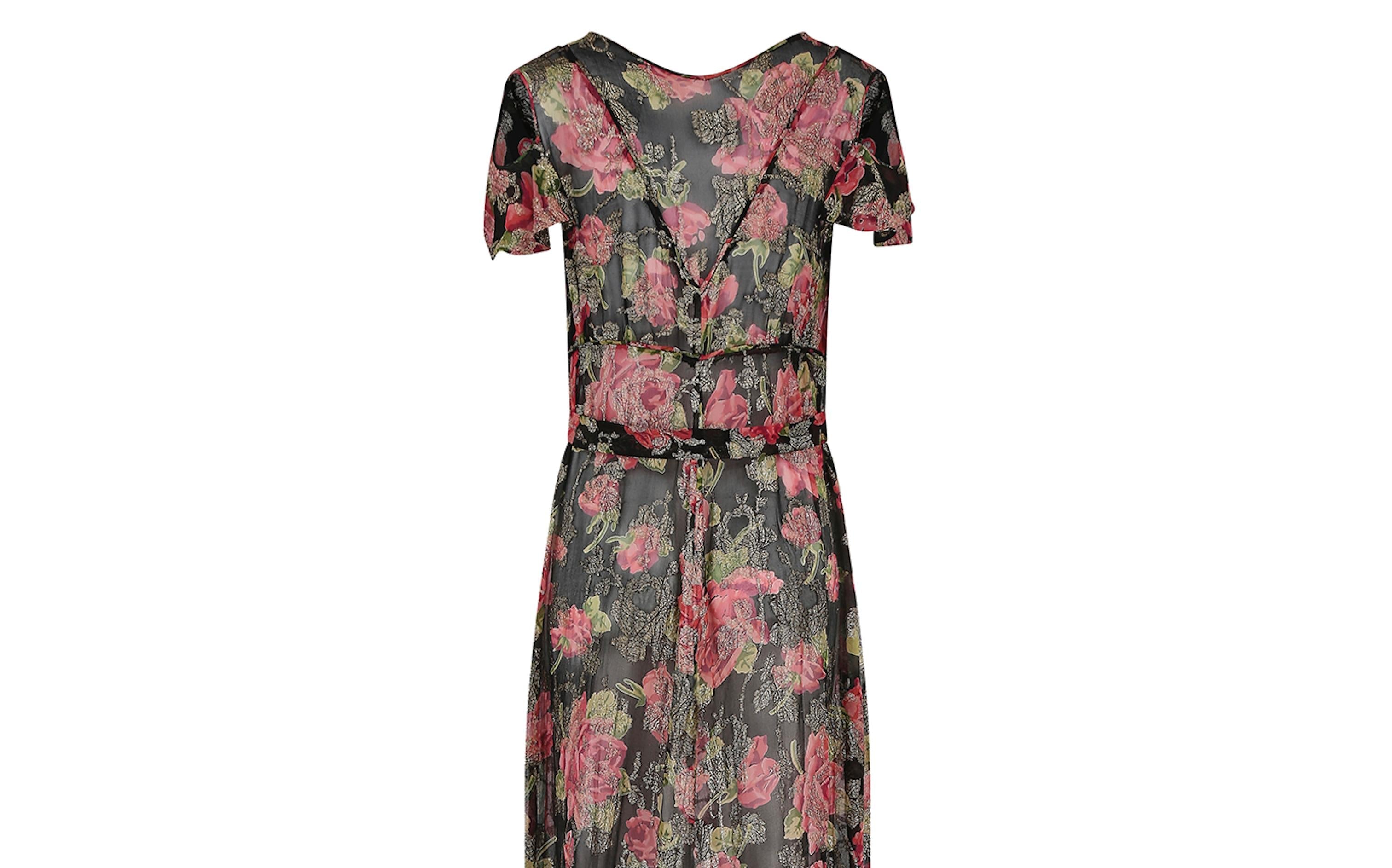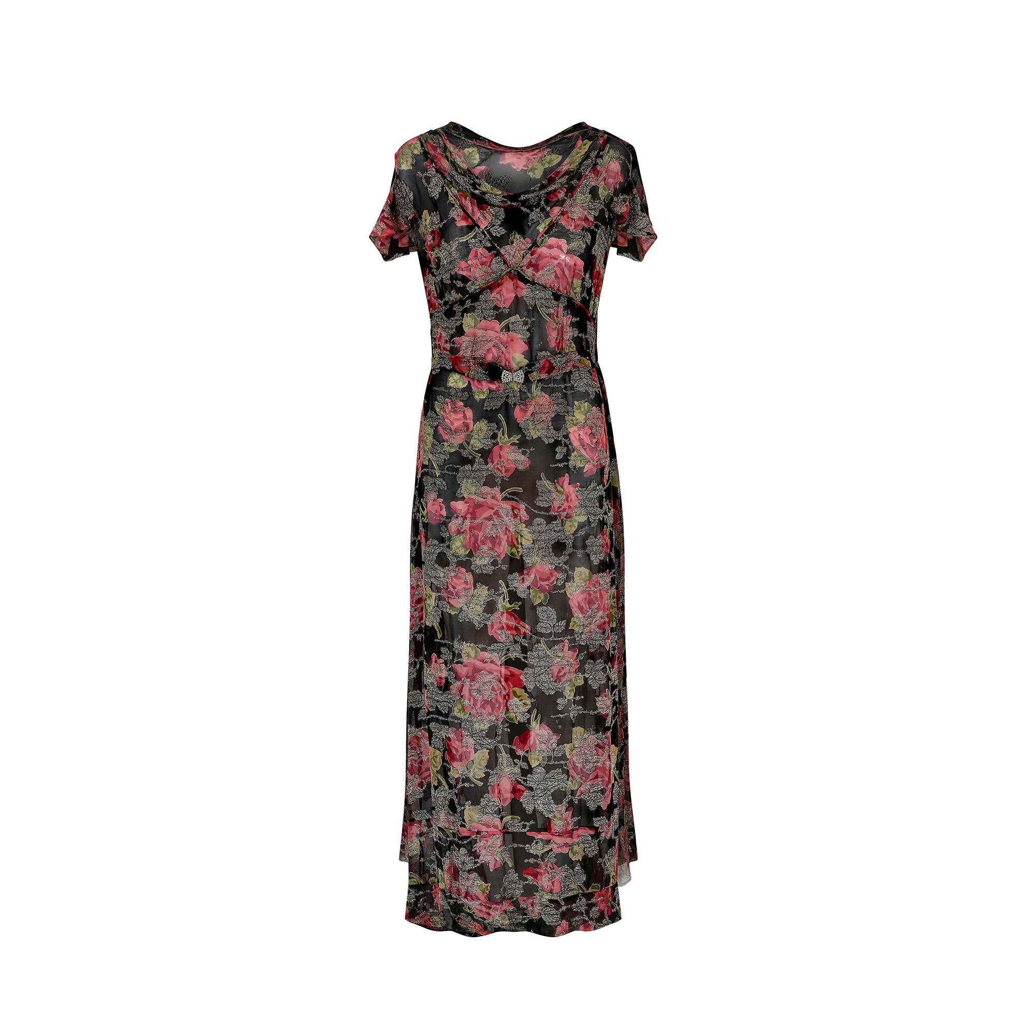 This 1930s chiffon dress has a beautiful rose pattern print and features delicate champagne coloured lame detail. It is cut in a classic bias cut shape, with a lightly weighted cowl neck finish. The fabric is an ever so slightly sheer chiffon in a deep black colour, with a pink rose lame design that repeats with several different sizes of the same rose. It has a beautiful V shaped seam detail to the front and under the bust, with delicate cap sleeves and a narrow waistbelt with a small, bow shaped diamante clasp. The dress is cut longer at the back than at the front, which creates a beautiful, train like effect to the rear hem. For a dress of this age, it is an exceptional example; in wonderful vintage condition without fault. There are no issues with the fabric and it appears unaltered. Unlabelled but a well-made couture piece from the period.