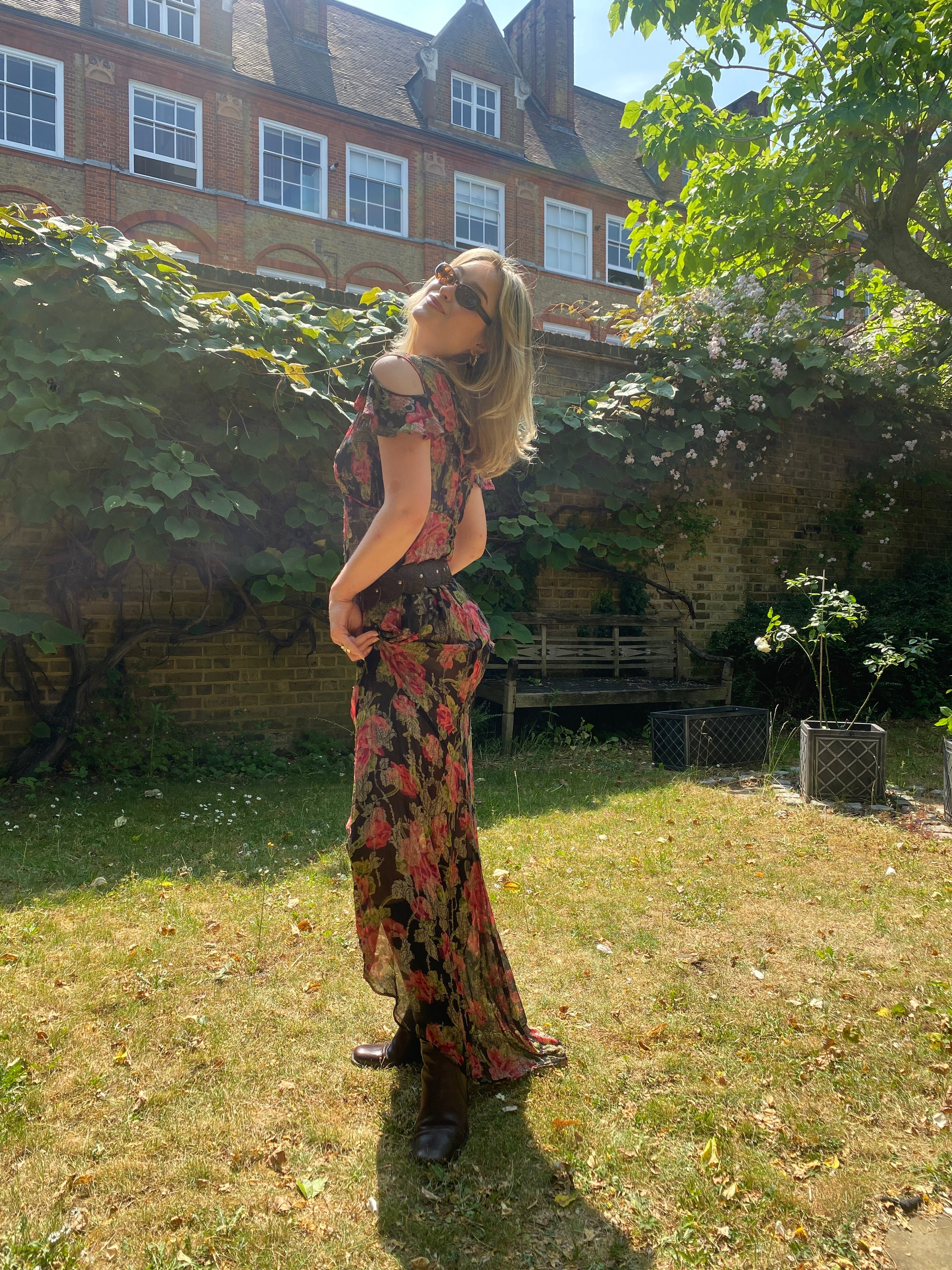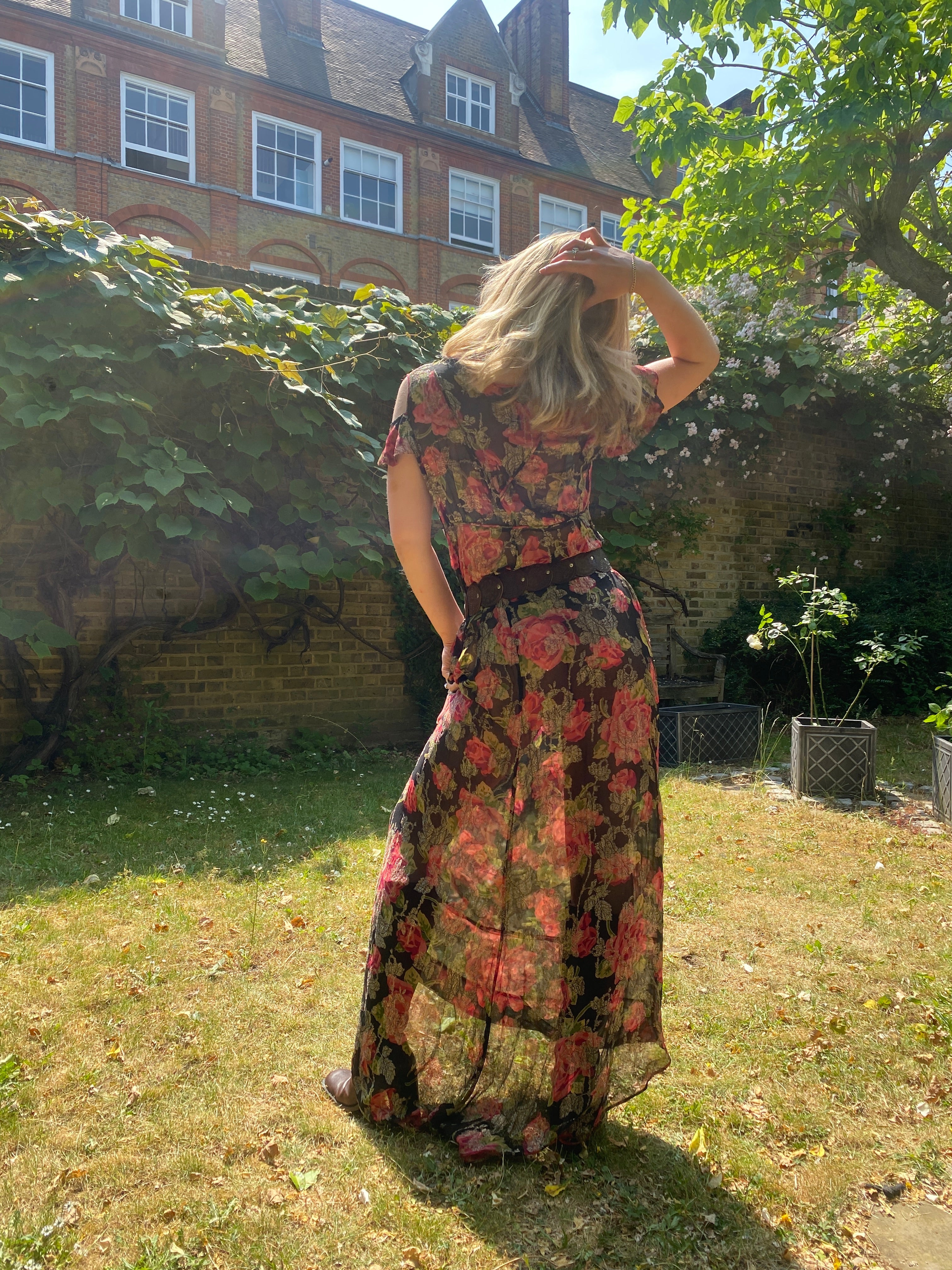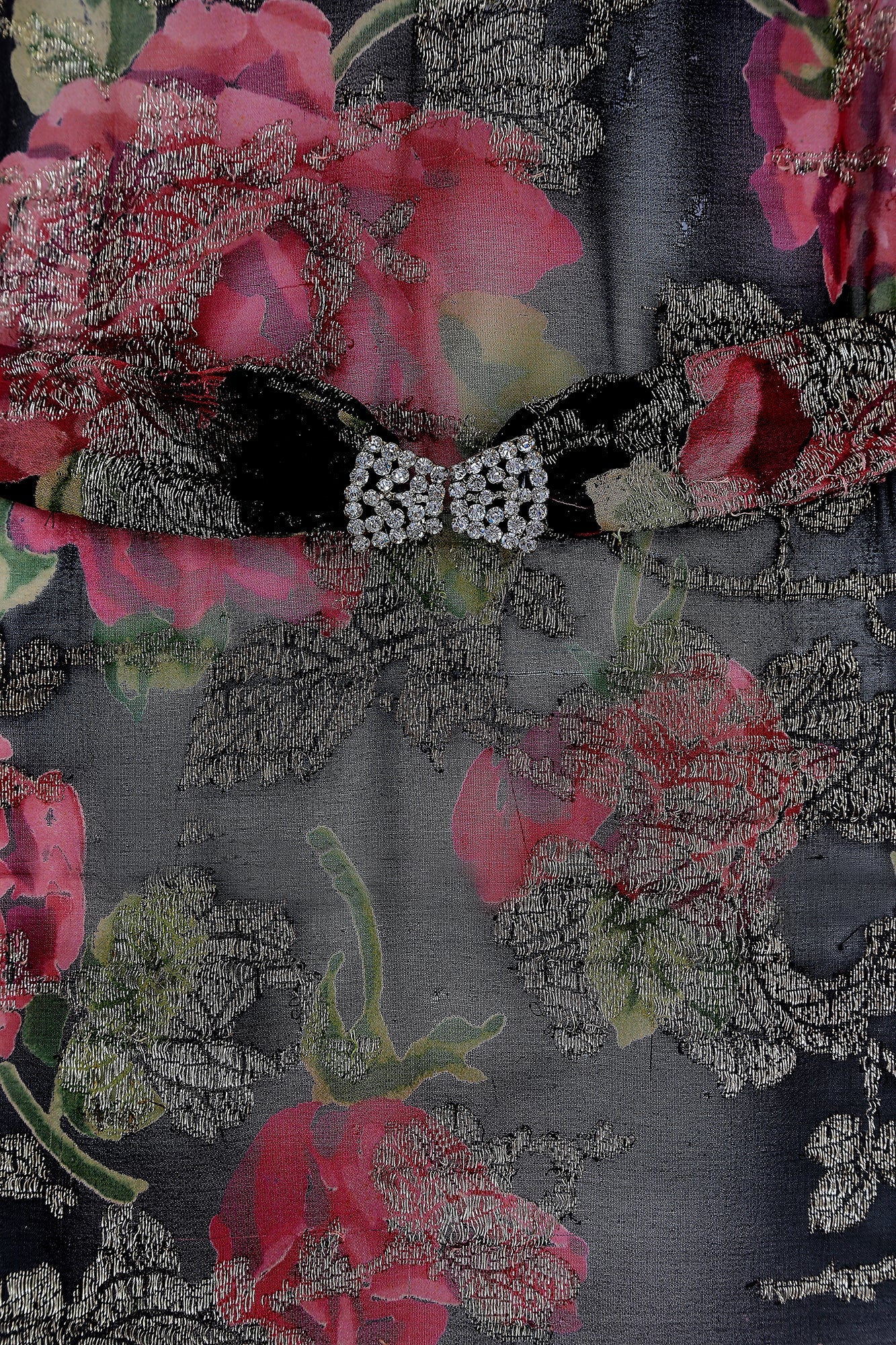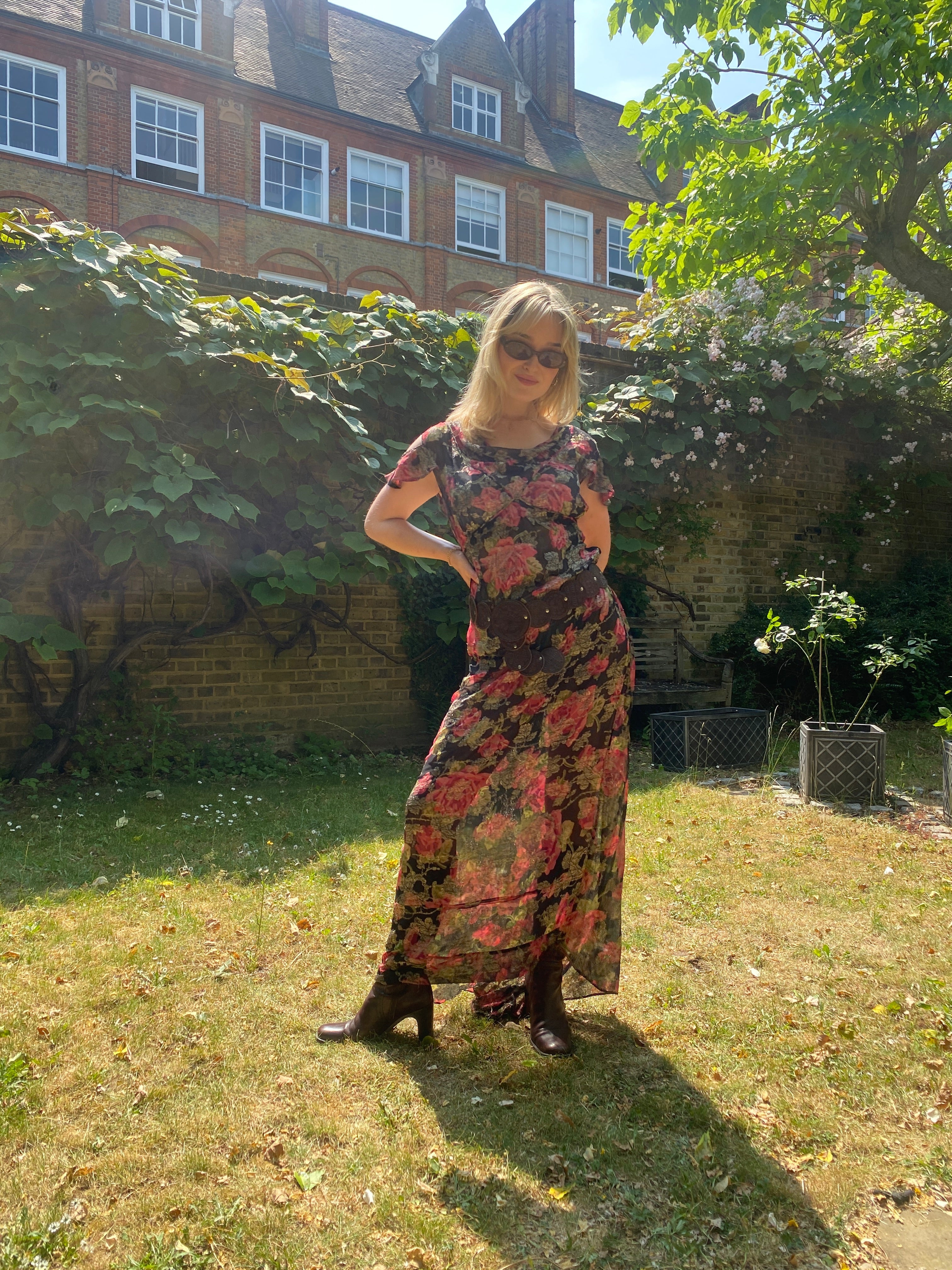 This 1930s chiffon dress has a beautiful rose pattern print and features delicate champagne coloured lame detail. It is cut in a classic bias cut shape, with a lightly weighted cowl neck finish. The fabric is an ever so slightly sheer chiffon in a deep black colour, with a pink rose lame design that repeats with several different sizes of the same rose. It has a beautiful V shaped seam detail to the front and under the bust, with delicate cap sleeves and a narrow waistbelt with a small, bow shaped diamante clasp. The dress is cut longer at the back than at the front, which creates a beautiful, train like effect to the rear hem. For a dress of this age, it is an exceptional example; in wonderful vintage condition without fault. There are no issues with the fabric and it appears unaltered. Unlabelled but a well-made couture piece from the period.