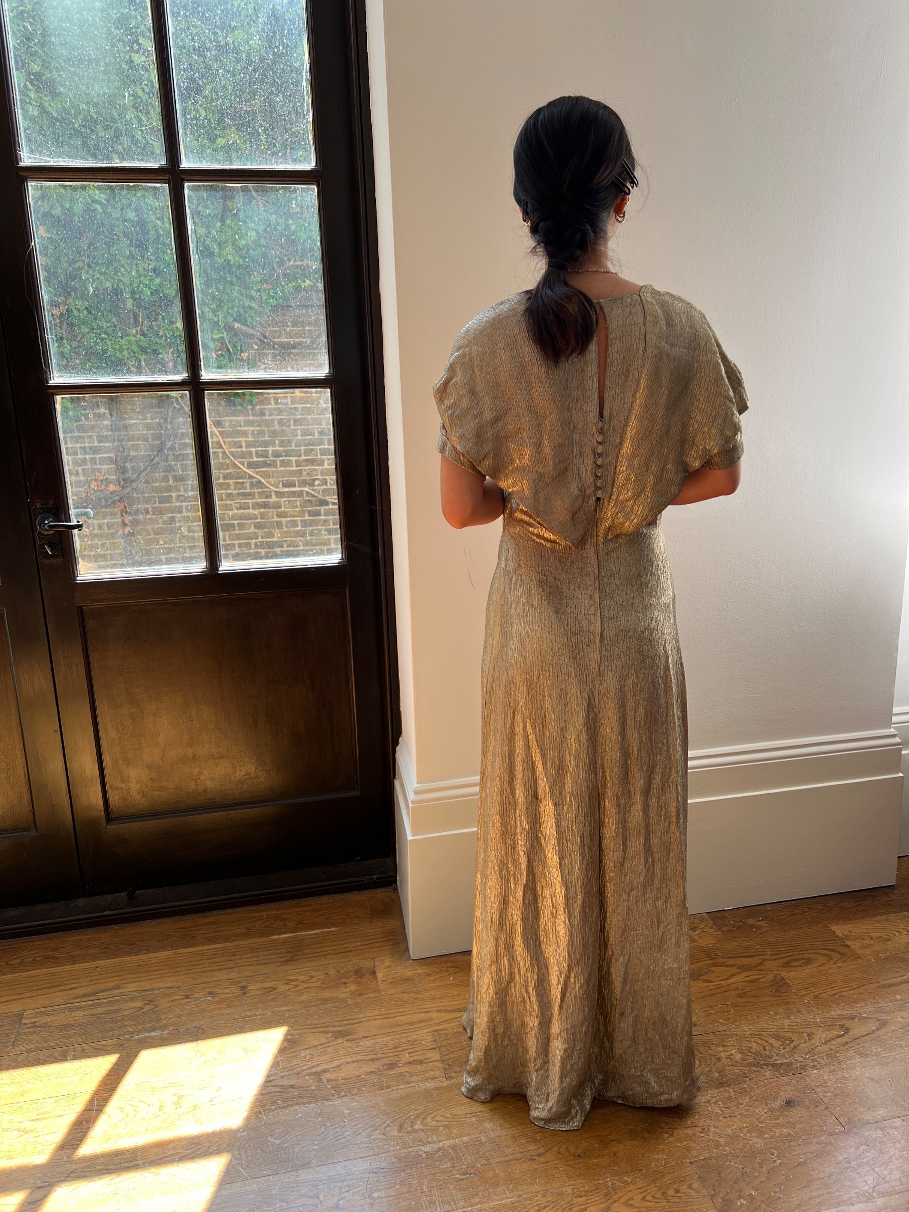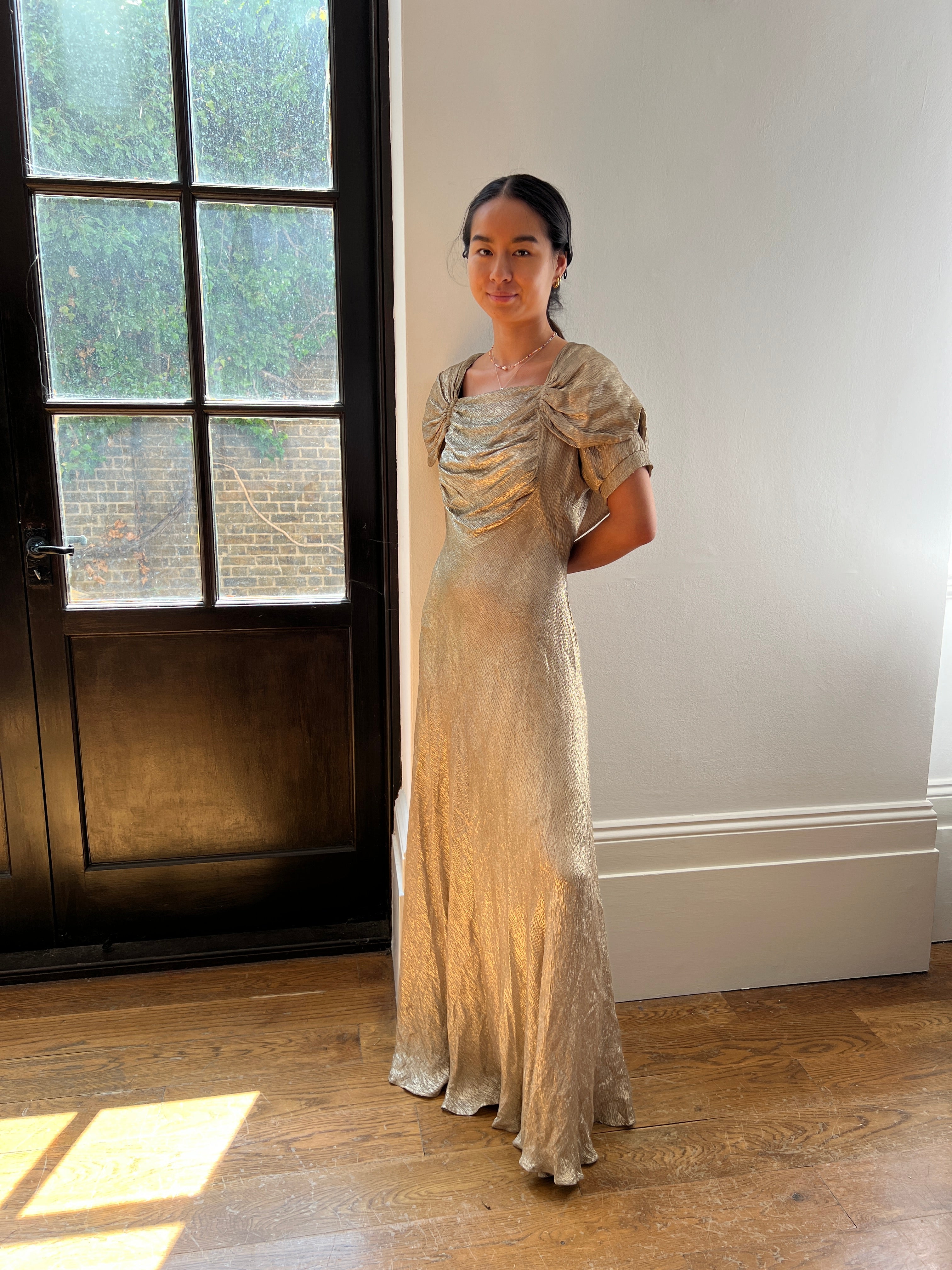 This 1930s gold lame maxi dress would be the crowning glory for any fans of 1930s clothing, or the perfect choice for an eye-catching and wearable gown for an upcoming event. It is crafted from shimmering pale gold lamé with a beautiful organic pleated texture. Almost sweeping the floor, it has a real stand-out silhouette; ruched cloth sweeps across the neckline and bust, gathering at the collarbones and creating a shawl-like effect over the shoulders. Short puff-sleeves peep out from underneath this gathered cloth. The romantic back is detailed with a keyhole cut-out and a row of seven fabric-covered buttons with fabric loops. A hidden tonal zip fastens the dress at the bottom of the back and a hook-and-eye clasp secures the back of the neck. The bias-cut creates a timeless, body-skimming ’30s silhouette that is supremely flattering. This dress is unlined, but the reverse of the lamé cloth is smooth and comfortable against the skin.