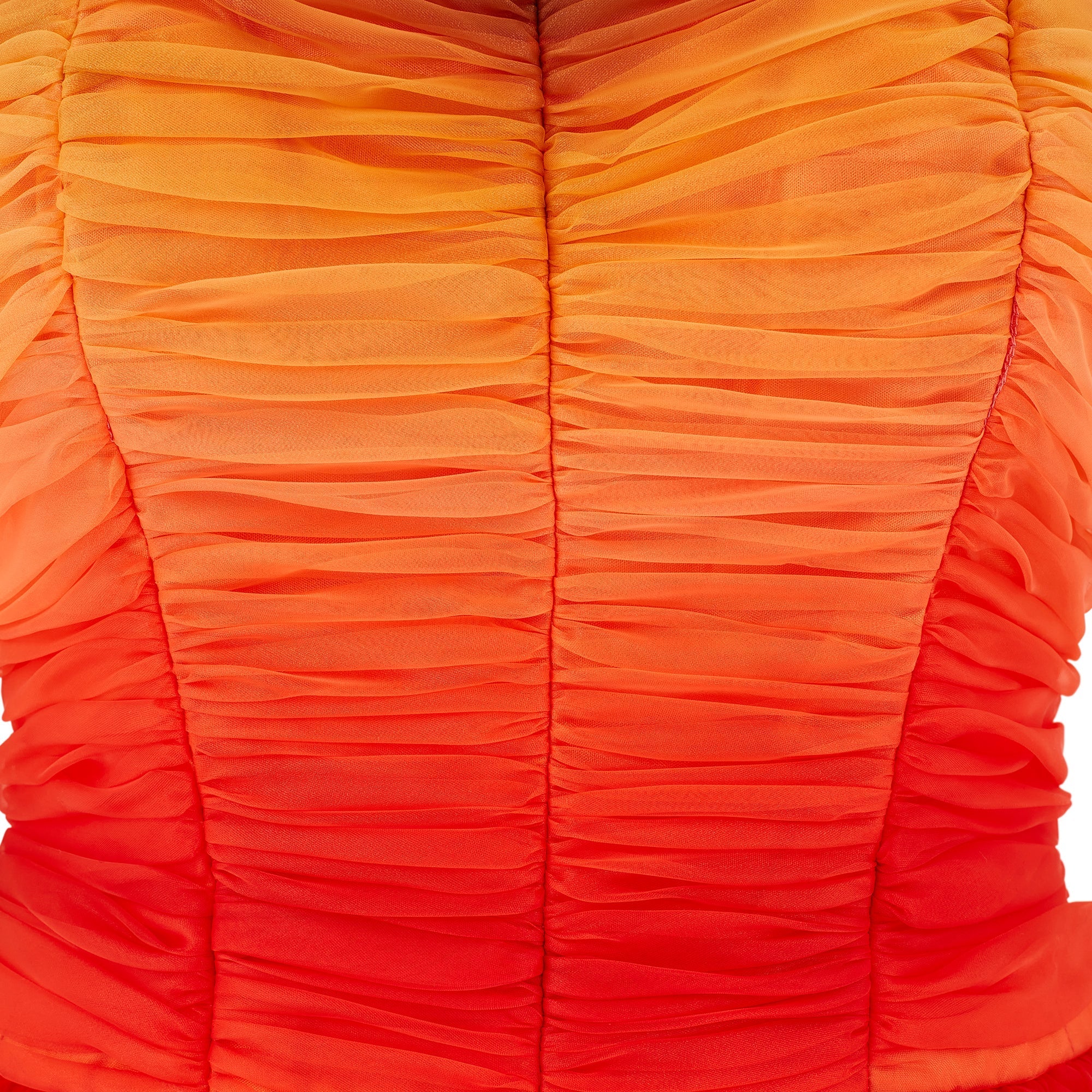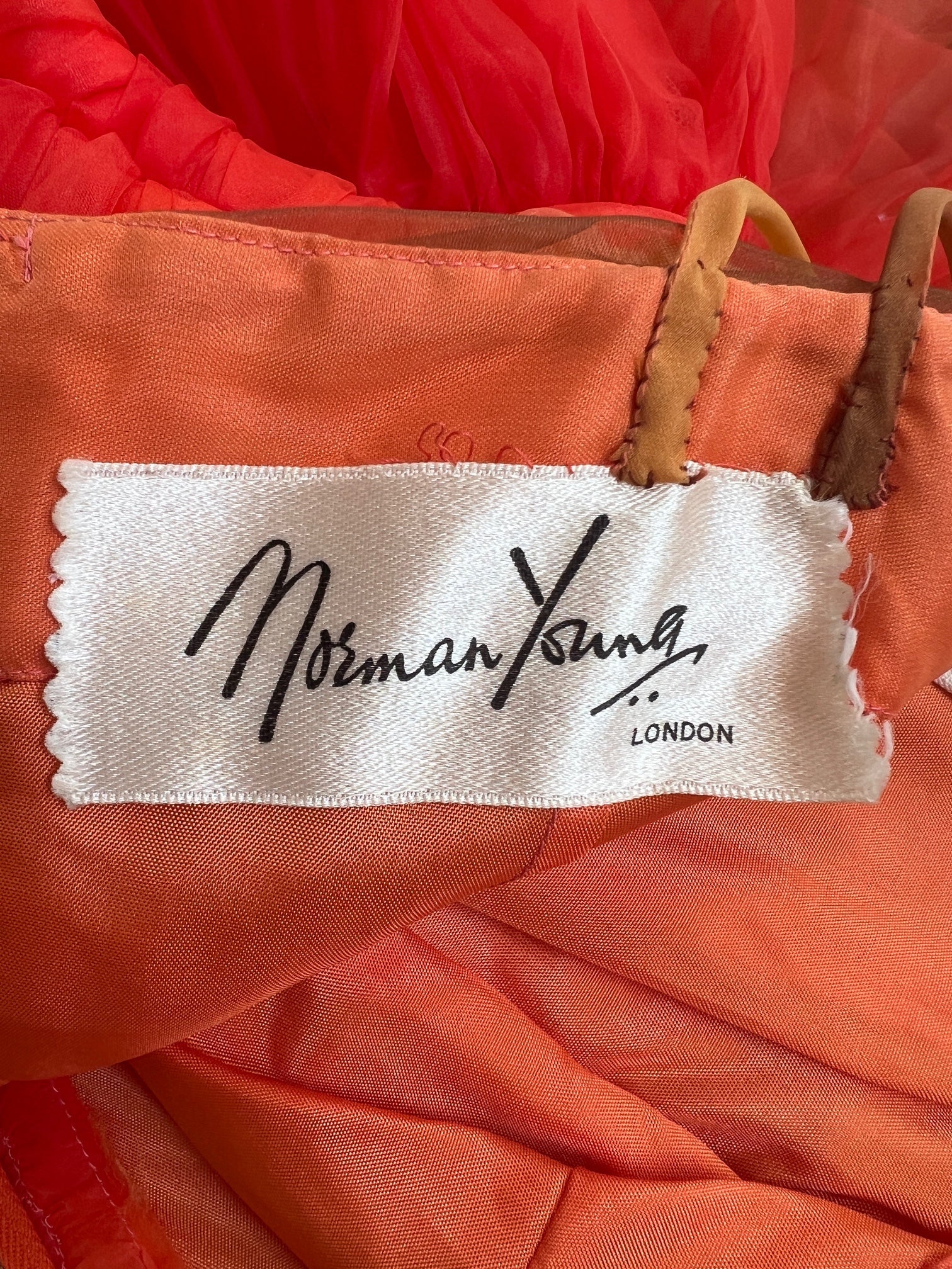 This is a very fine example of late 1950s ready to wear evening wear by British designer Norman Young who made high end occasion wear for department stores and specialist boutiques during the 1940s - 1960s. Made from a man-made chiffon, it is dyed to an ombré finish which travels from hues of amber, through marigold, to tangerine. It is a high volume affair, with a boned, bustier top adorned with ruched layers of chiffon and tiny spaghetti straps. The bust is lined with orange satin. The skirt is voluminous and full, lined with a layer of orange tulle and a bottom layer of orange satin. The dress fastens at the rear with a hidden orange zip and hook-and-eye clasp.