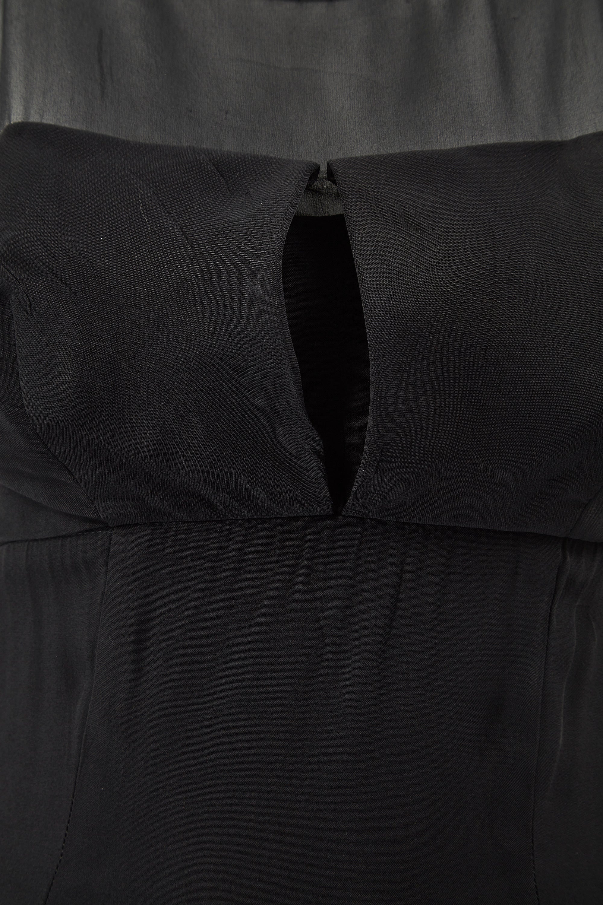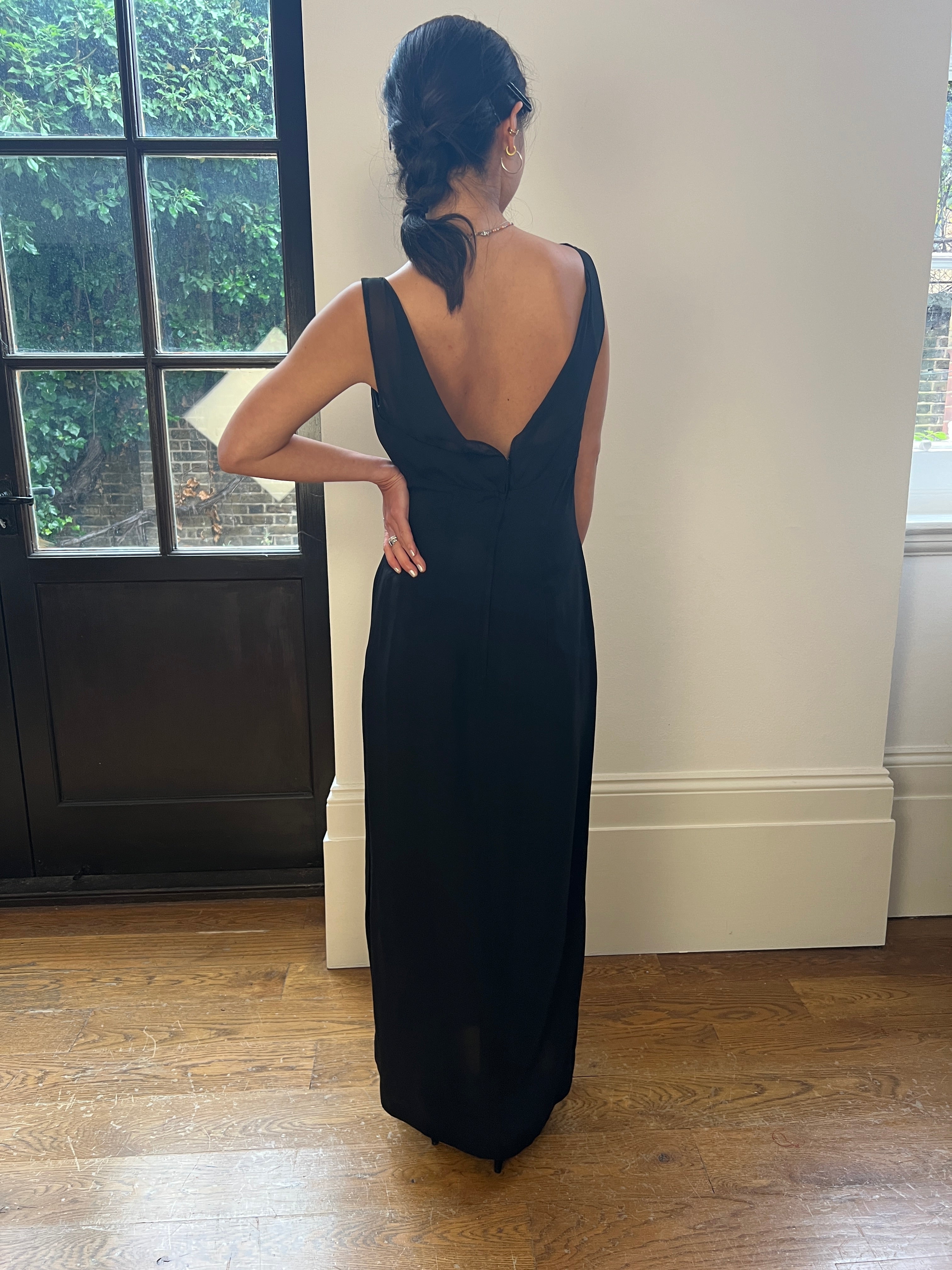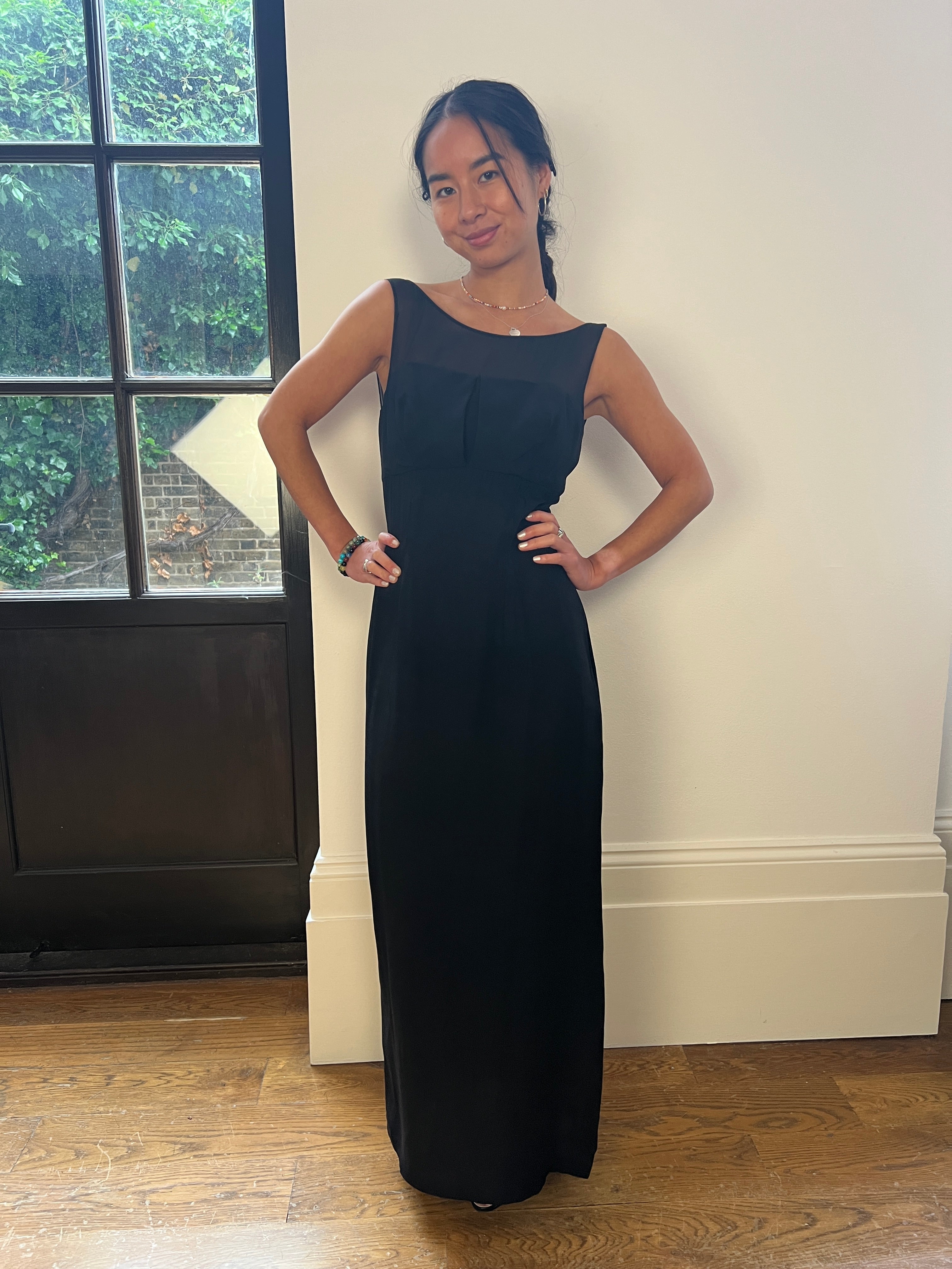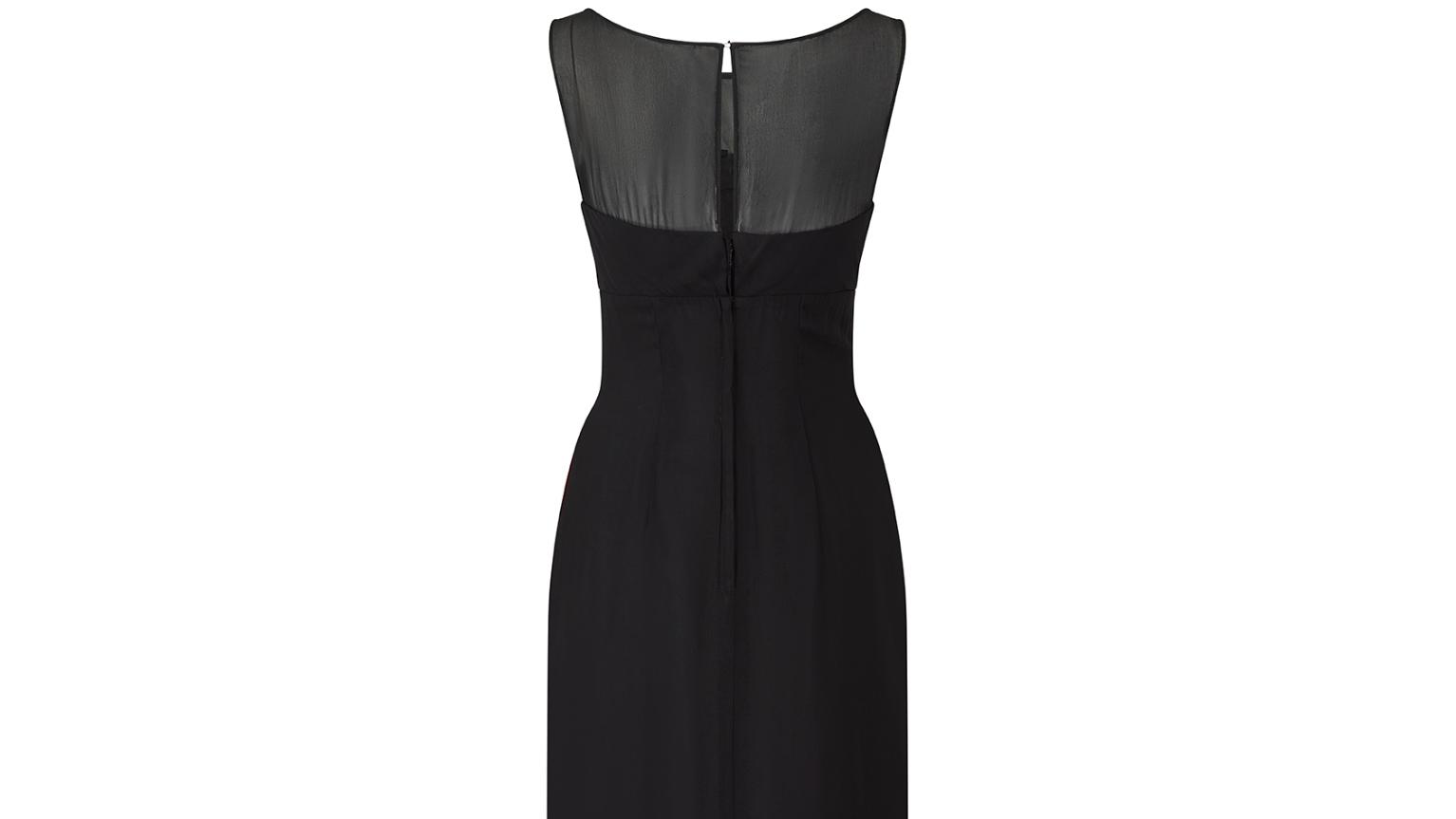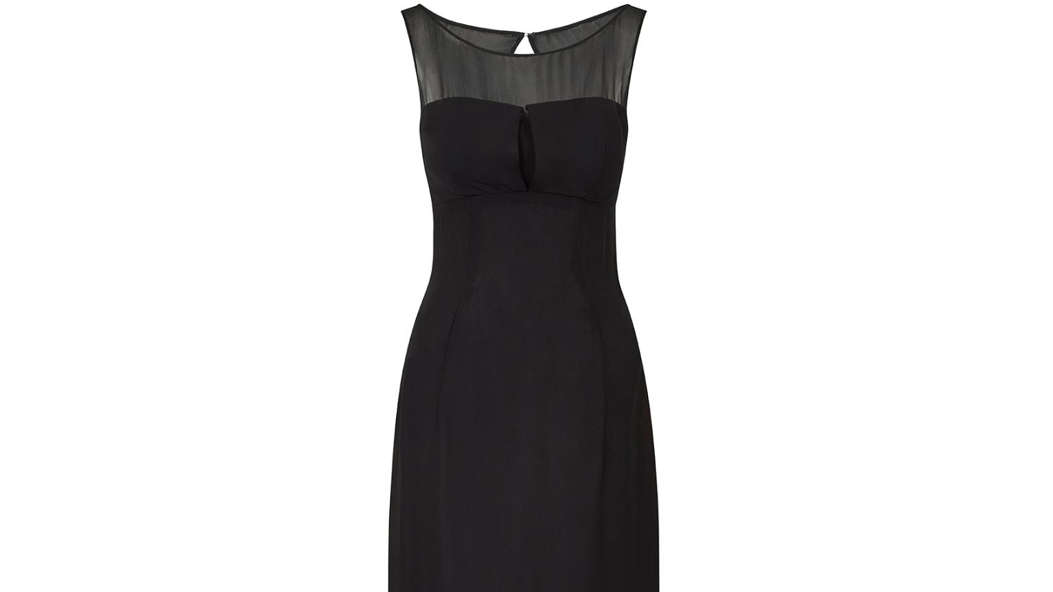 This mid 1960s black column dress is chic, sophisticated and perfect for any formal occasion. It has a georgette fabric neckline which is slightly transparent, rounded to both the front and back. The bodice is made from a soft black crepe and is gathered round the bust for a flattering fit, with vertical keyhole detail to the centre. The dress fastens down the back with the original zip and hook and eye closure. The crepe skirt flows down from the high point of the waist in a classic empire cut - a very typical silhouette for the era. It has two neat front pleats and has a small slit up the left hand side seam, reaching to around knee height. This piece would look fabulous for a black tie cocktail event, accessorised with vintage jewellery and an elegant pair of heels.