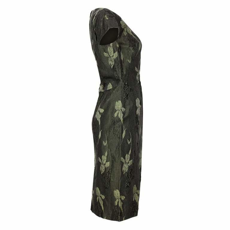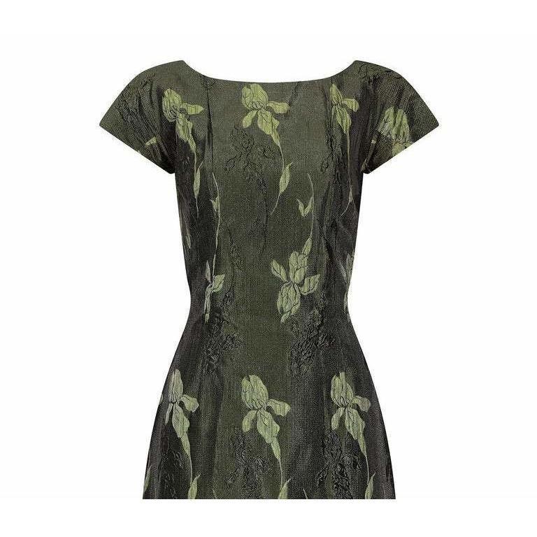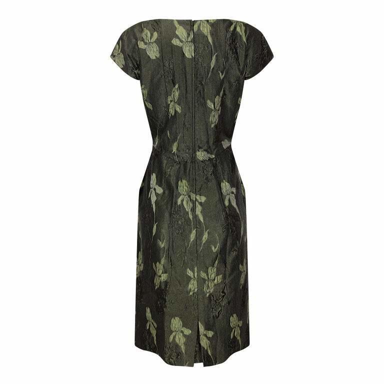 This elegant vintage 1960s metallic evening dress is of high-end, British manufactured quality although unlabelled. The opulent and textured brocade fabric has an iris design in alternating two-tone forest green which shimmers in the light with understated glamour. The dress has neat cap sleeves and is superbly tailored to create a classic hourglass silhouette. The bodice is drawn in at the waist and the straight skirt falls snugly over the hip, finishing below the knee, with a short back slit to ease movement. The dress is lined throughout in coordinating green sateen fabric with a concealed zip fastening at the centre reverse. This beautiful cocktail attire is in excellent, barely worn condition. On very close inspection, there are a few, small, copper coloured marks. They blend in so well that they will not detract and I have priced accordingly. Would fit up to a US size 6, UK size 10.
