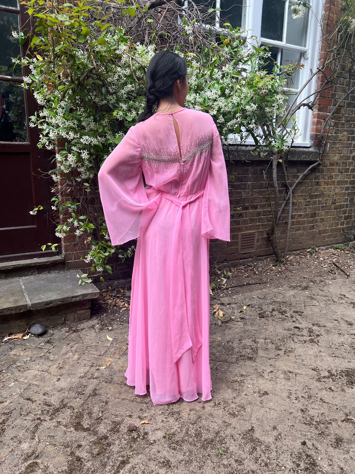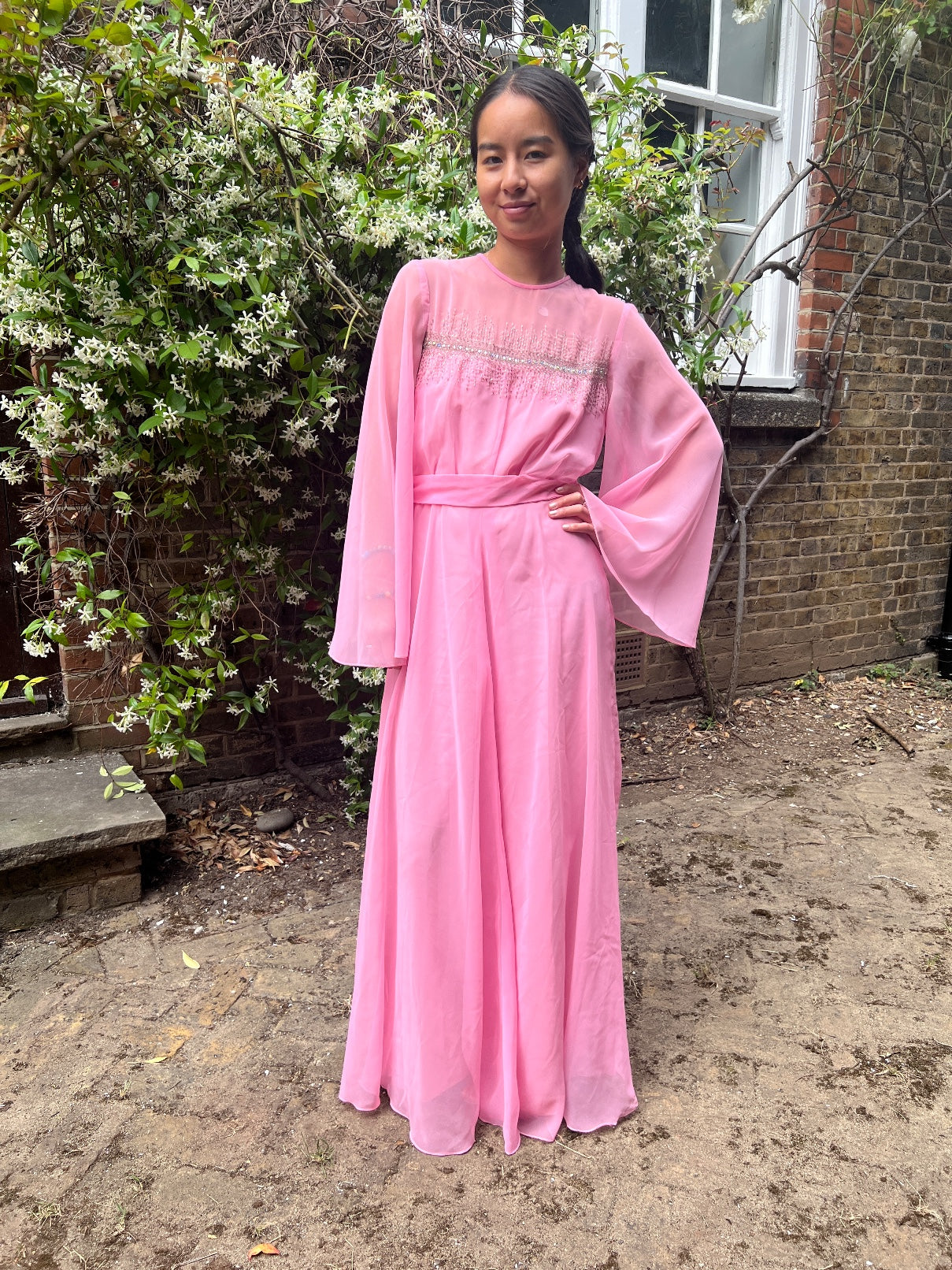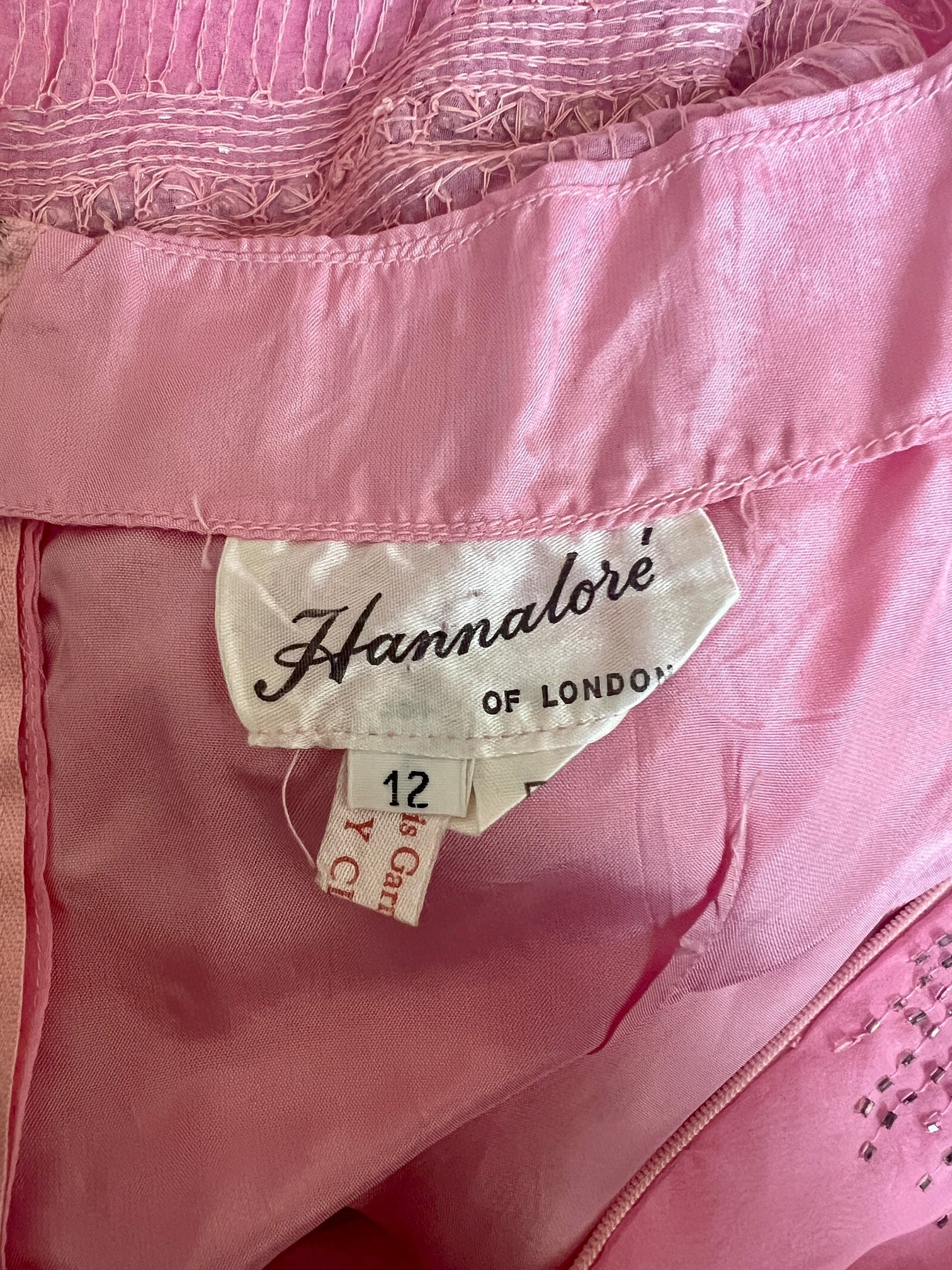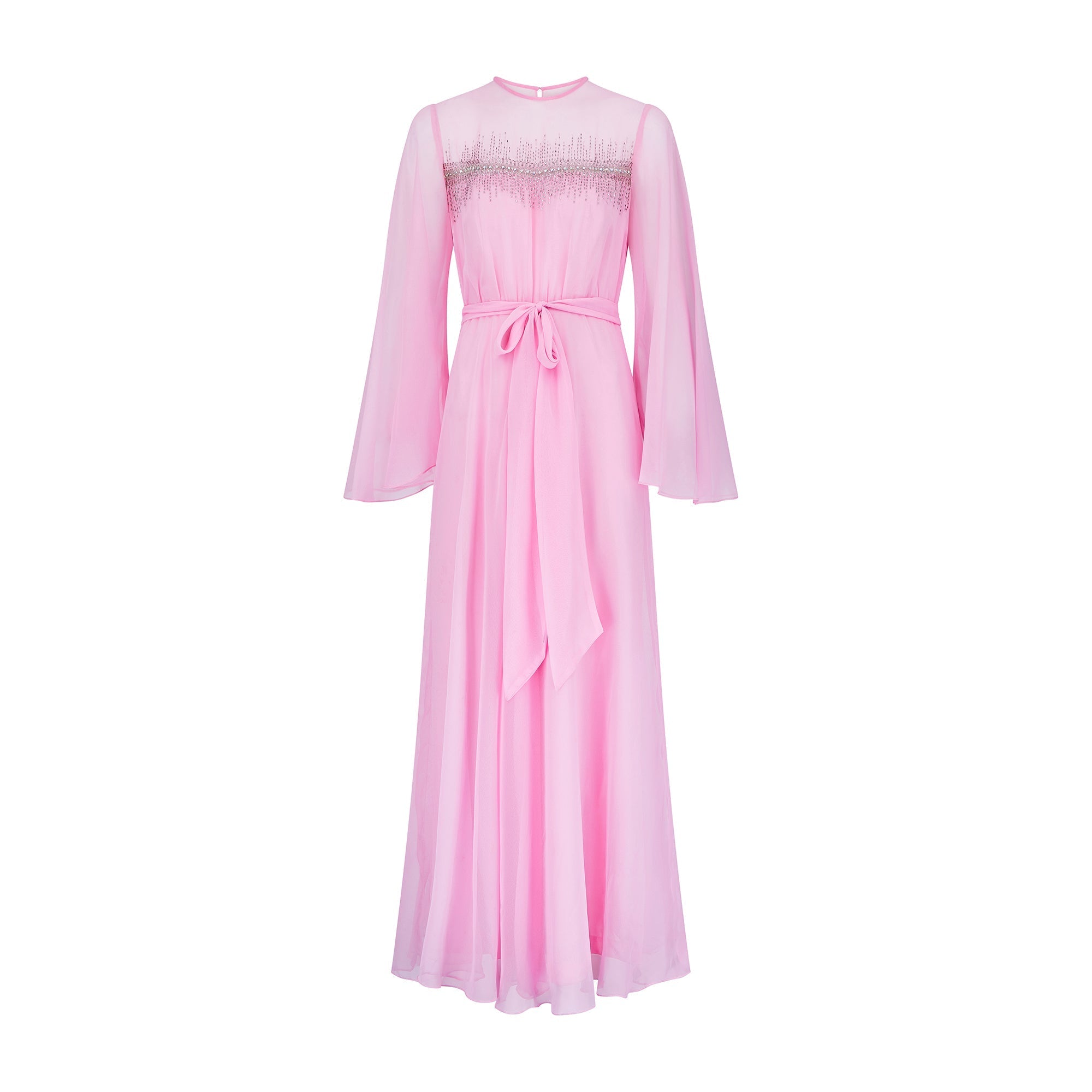 This striking evening dress by Hannalore of London combines fairy tale glamour with a late 1960s to early 1970s silhouette. Tailored from bubble-gum pink chiffon, it has a full, swirling skirt and theatrical angel-sleeves that create wonderful wing-like shapes around the body as the wearer walks. The bodice is adorned with a line of circular rhinestones and hundreds of iridescent beads, creating a cascading waterfall effect down the front of the dress which circles around the back. There is a coordinating pink chiffon belt to elevate the bust and draw in the waist at the mid back which allows the wearer to cinch in the free-flowing shape. The sleeves and décolletage are sheer and the dress is lined in coordinating bubble-gum satin from the bust down the length of the dress throughout the floor-sweeping skirt. The dress fastens at the back with a hidden tonal pink zip and has a keyhole cut-out at the top which closes with a hook-and-eye closure.