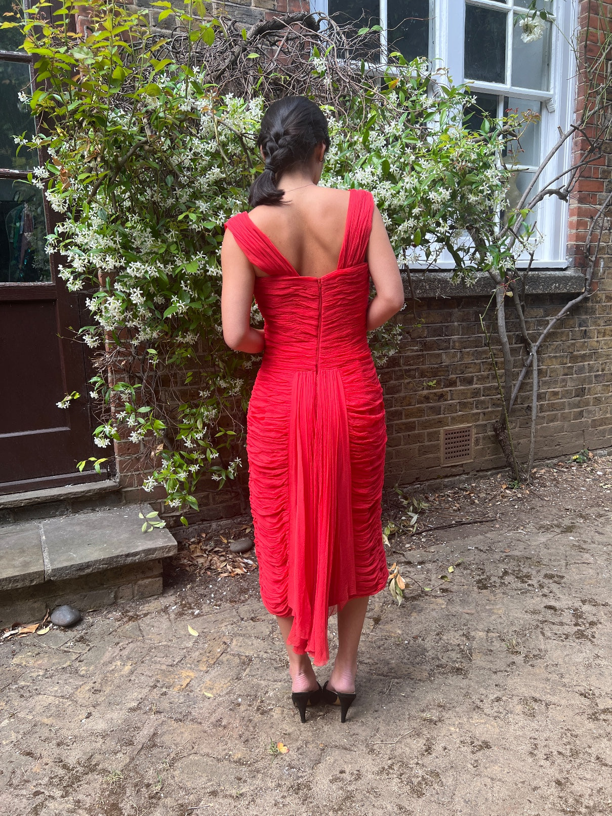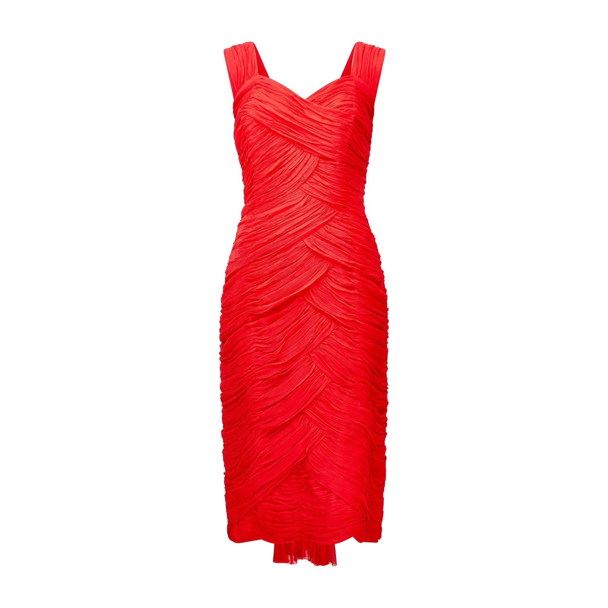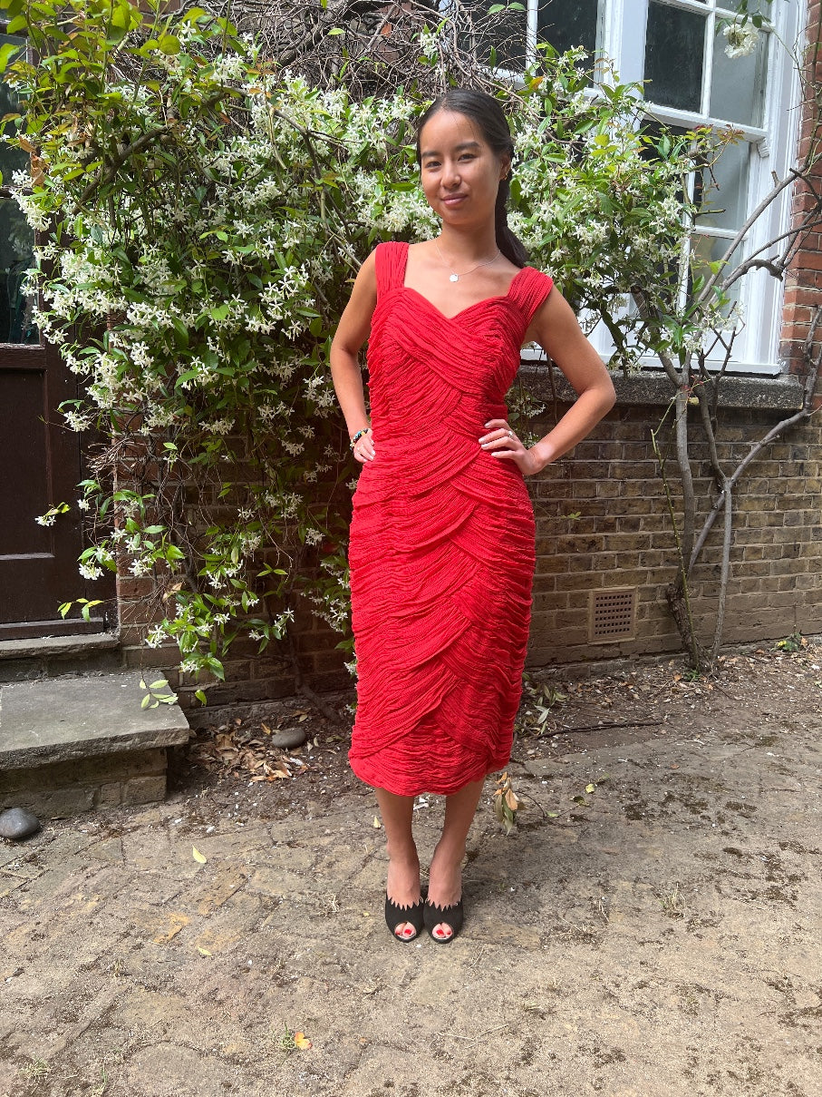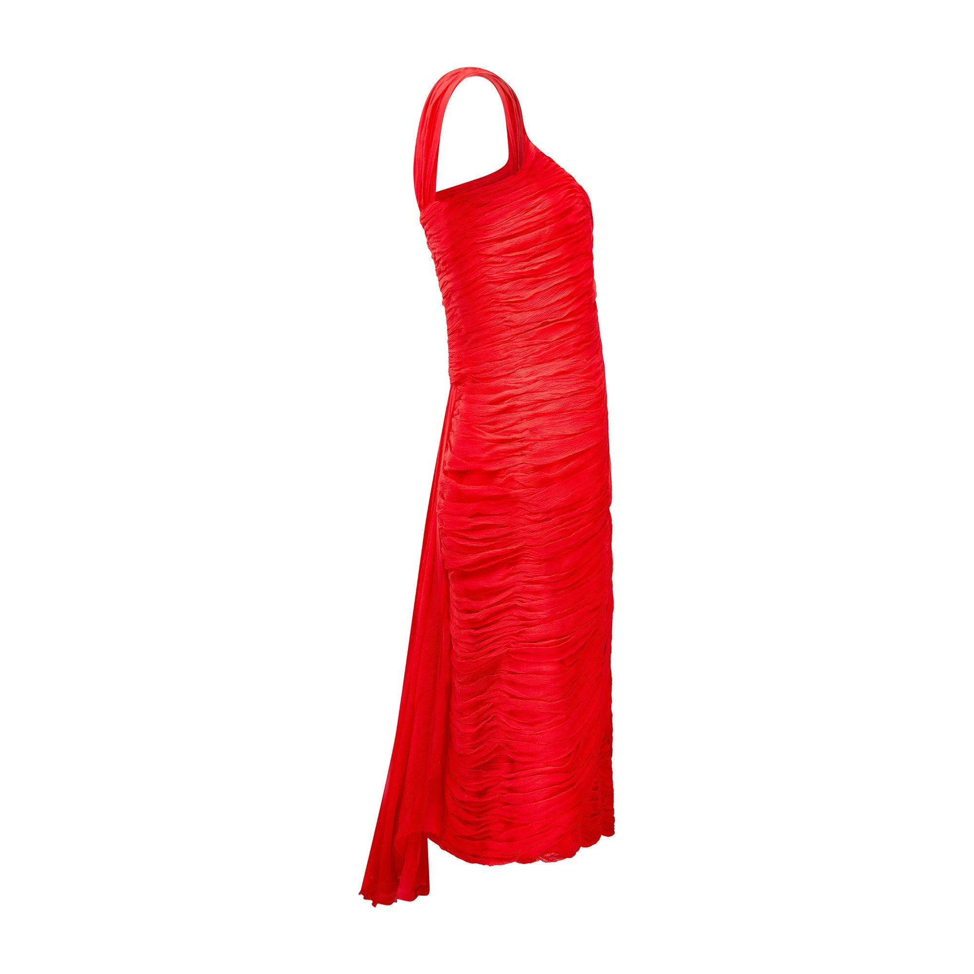 This lively, crimson party dress was designed in the early 1960s or possibly even late 1950s and echoes the famous draping of the French couturier, Jean Desses. It has been delicately crafted from swathes of pleated, pillar-box red silk chiffon which fall across the front in petal shapes that encircle the body, flatteringly echoing the wearer’s curves. This gown has a romantic sweetheart neckline with wide chiffon straps. The bust is boned the whole way around. At the back, the chiffon is tailored in horizontal pleats, broken up by a pretty, sweeping train that falls from the base of the back to just below the bottom hem. The back is fastened by a tonal red zip and two hook-and-eye clasps on a tab of grosgrain ribbon.