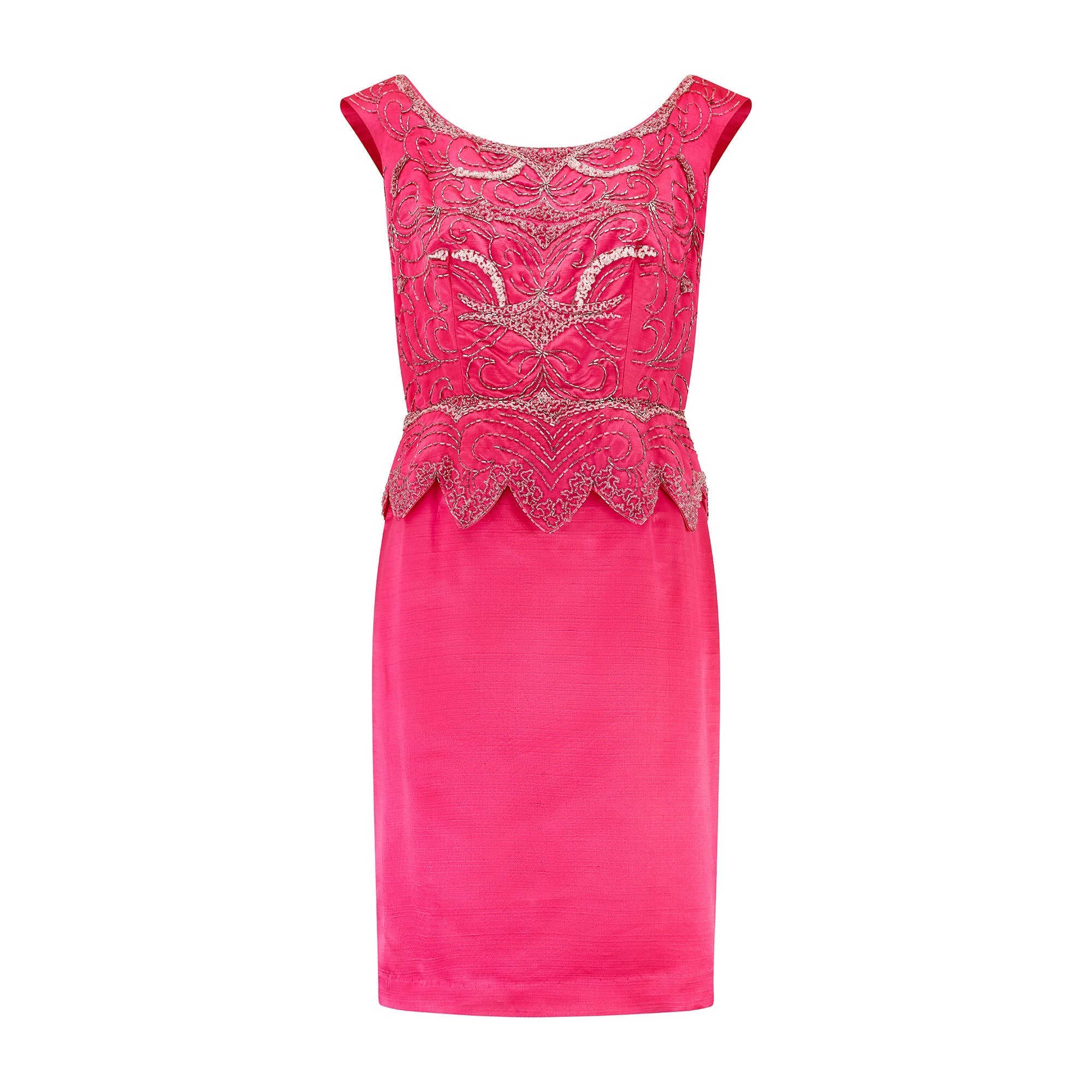Likely a British made bespoke or couture piece from the mid 1960s, this hot pink satin-silk cocktail dress has retained all of the vibrancy of when it was first designed. The high quality fabric and beadwork really makes the dress stand-out among other evening dresses of this era, as does the playful short length. It is cut to a sleeveless shift shape with a rounded neckline and lowered V-back. It has a peplum waist cut with a pretty scalloped hem. The fabric is embroidered across the bodice and peplum with heavy intricate beading; lines of transparent and silver-lined beads form glittering shapes that echo the curves of the tailoring. This dress is lined at the bust with nude mesh. It fastens at the rear with a hidden pink tonal zip and hook-and-eye clasp.