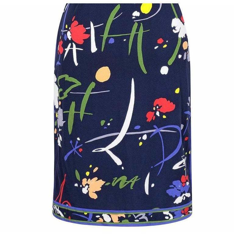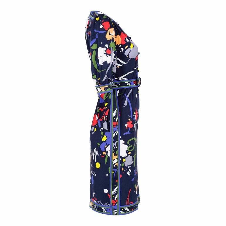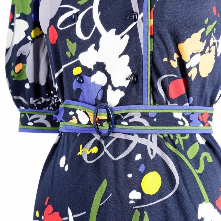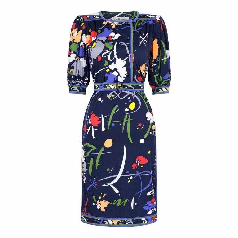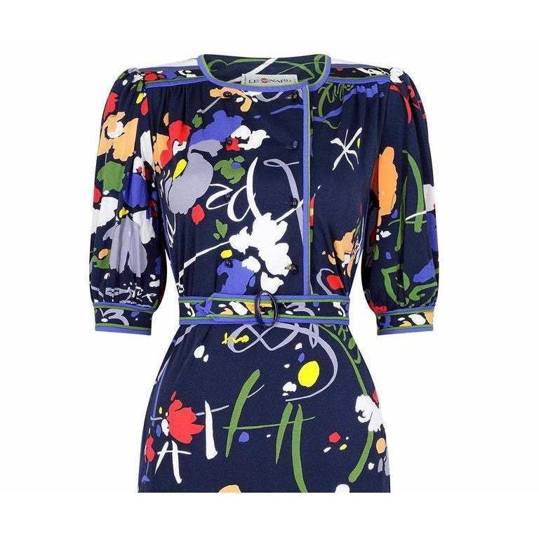 This striking 1970s dress in navy, orange, red, green and white boasts a classic Leonard style abstract floral print in poly jersey fabric. The dress is knee length with elbow length sleeves and has a double row of navy oval buttons down the front. The dress comes with its original belt - a simple tie design which echoes the bottom trim of the dress and the cuffs. The designer Daniel Tribouillard defined his aesthetic using printed jersey fabrics, much akin to Pucci with whom his designs are often associated. Like Pucci, the Leonard signature is often incorporated into the surface design, in this instance it can be found in blue/grey and orange colours of the dress.