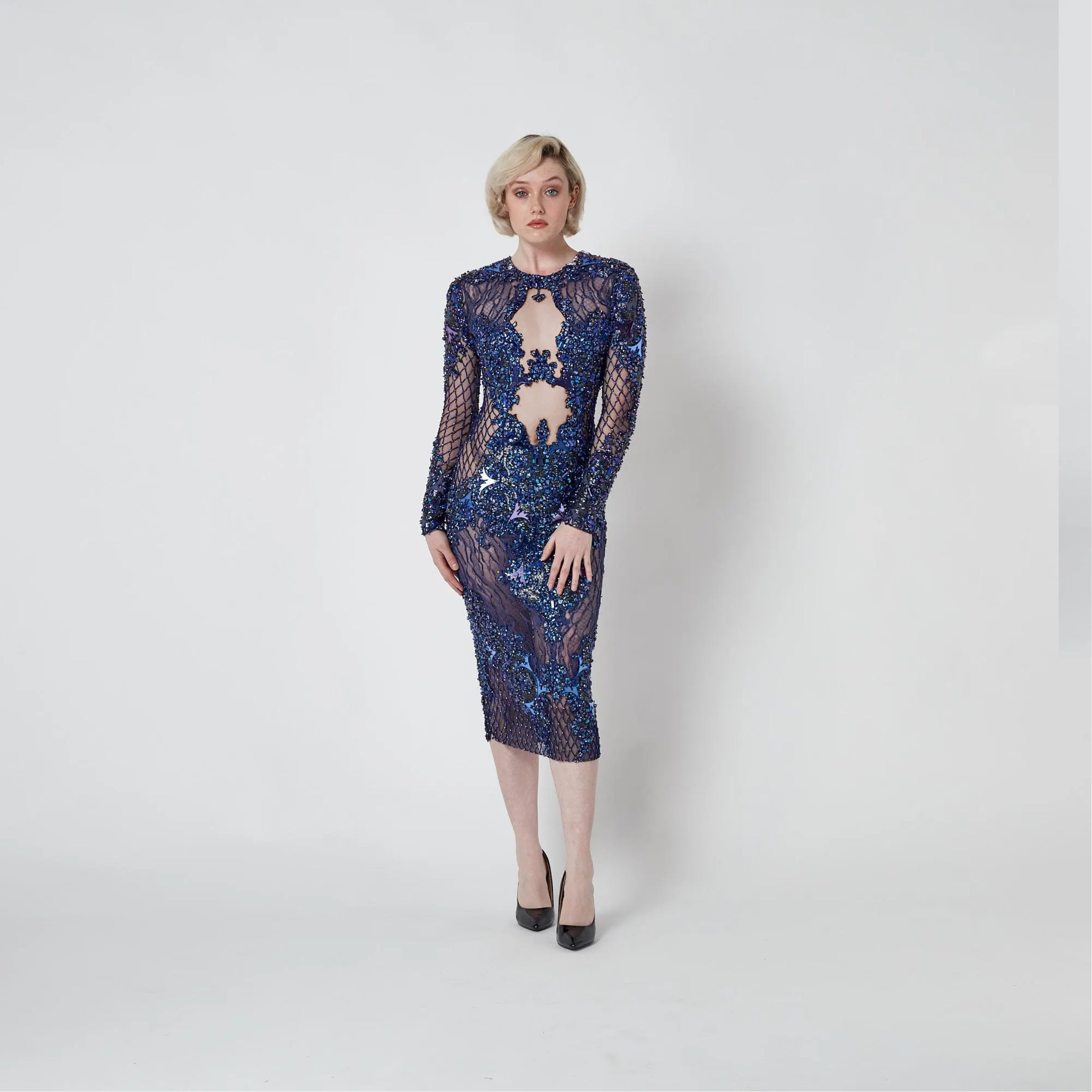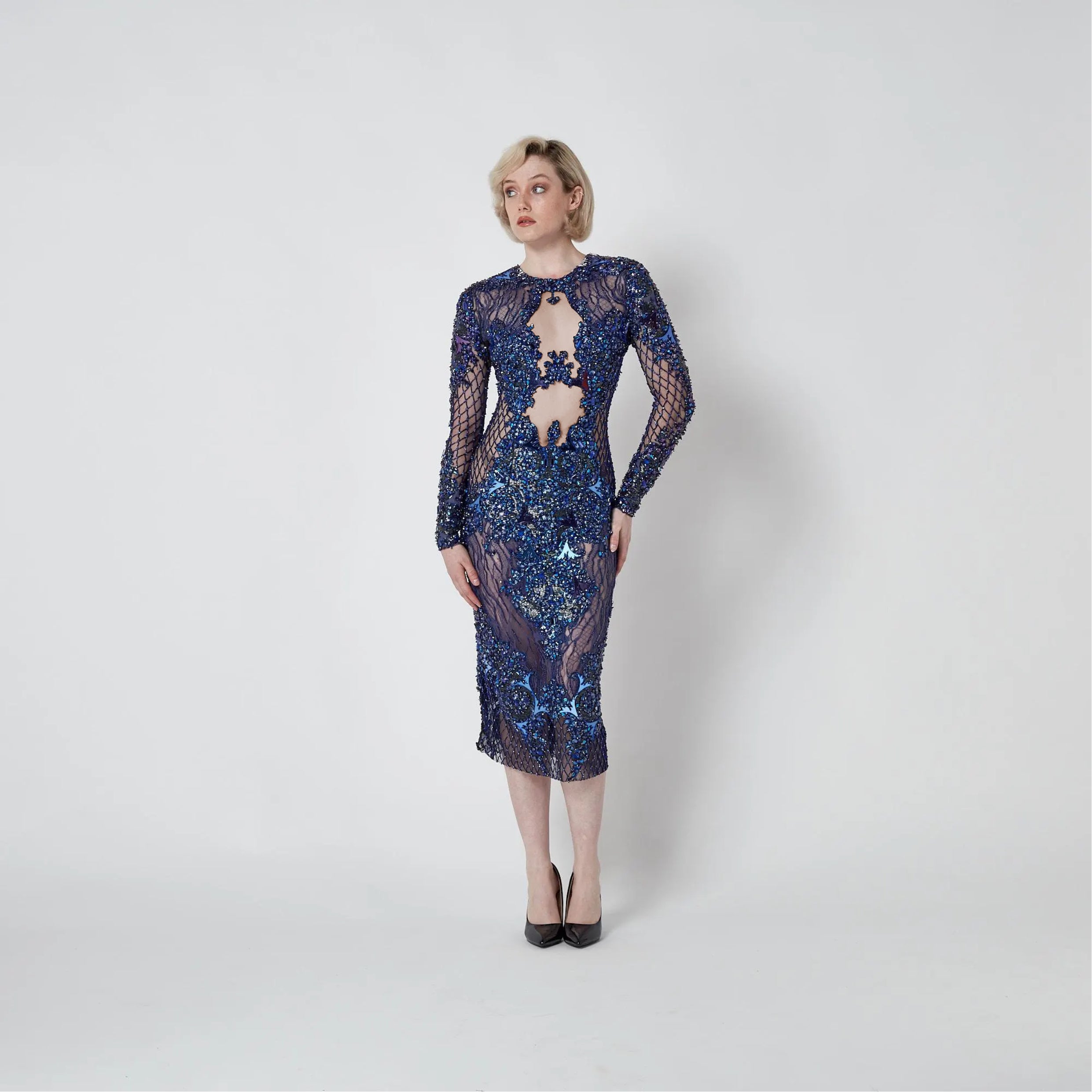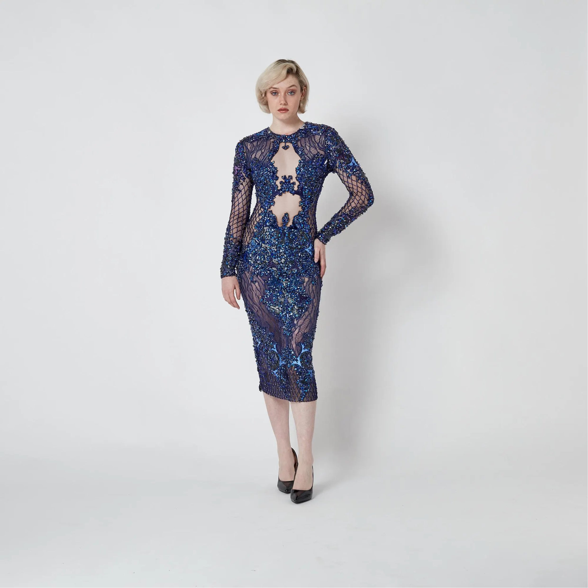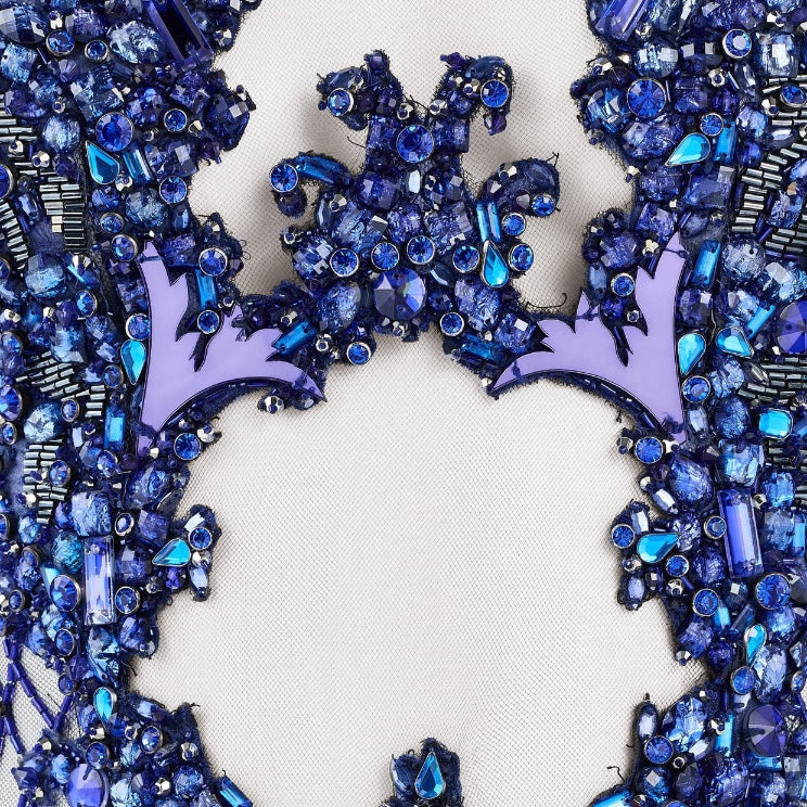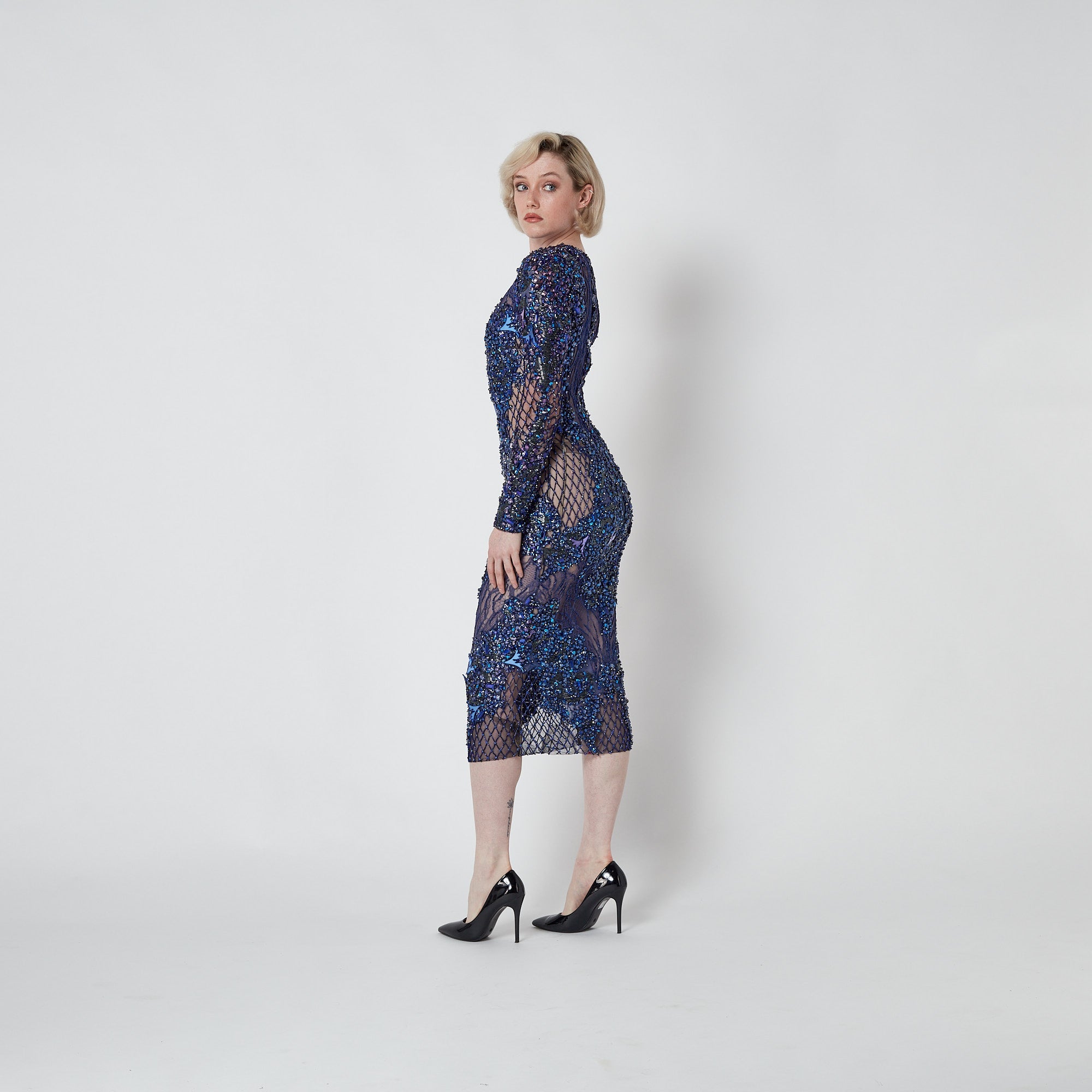 We believe this dress was one of the stand-out pieces from a show full of heavy-hitters, walking the runway as look 29/32. Tailored from a fine blue mesh with a tonal mesh insert on the front, it has a long-sleeved, body-con silhouette and falls to below the knee. The two cut-out details at the chest are surrounded by exquisite embellishment which forms bra-like shapes across the bust. The elaborate, vibrant blue beadwork is cleverly placed across the body; revealing, but only so much. The detail it contains is mesmerising up-close: flamboyant forms cut from iridescent blue perspex; large rhinestones and beads in cobalt, sapphire and purple; moody, glistening dark-grey bugle beads. In the sheerest places, panels are crafted from blue lace or mesh that has been beaded with rows of diamonds formed from glittering blue bugle beads and rhinestones. The dress is unlined. It fastens at the back with an exposed zip. There are also zips in the slim cuffs.