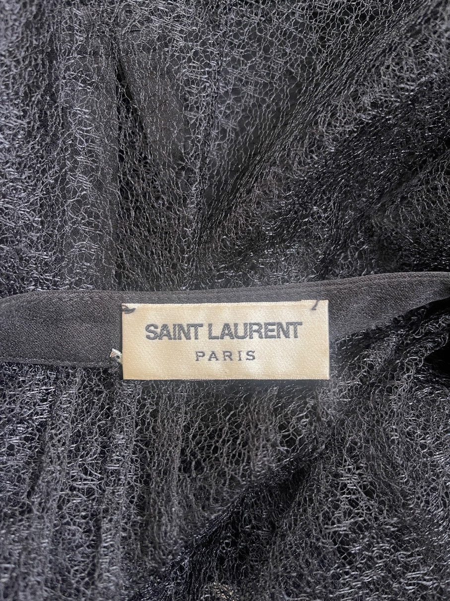 This romantic black lace dress was designed by Saint Laurent in 2017. During this era, Saint Laurent - under the creative direction of Anthony Vaccarello - cemented its bold aesthetic with sharply tailored silhouettes, glimmering partywear and a rock-chic edge that paid homage to the house’s Parisian roots. This mini-dress is tailored from a modern inky black lace which, up-close, has a swirling abstract pattern. It has a slinky black slip-dress underneath. The dress has extra-long sleeves which are unlined and therefore sheer. They are generously cut and wide, each cinched with an elasticated band of black satin at the elbow at the wrist. Ruffled lace cuffs fall over the hands. The dress has a bibbed front crafted from black crepe and it is adorned with elaborate beadwork, pearls, metallic thread and rhinestones. This dress fastens at the front with two hidden hook-and-eye clasps.