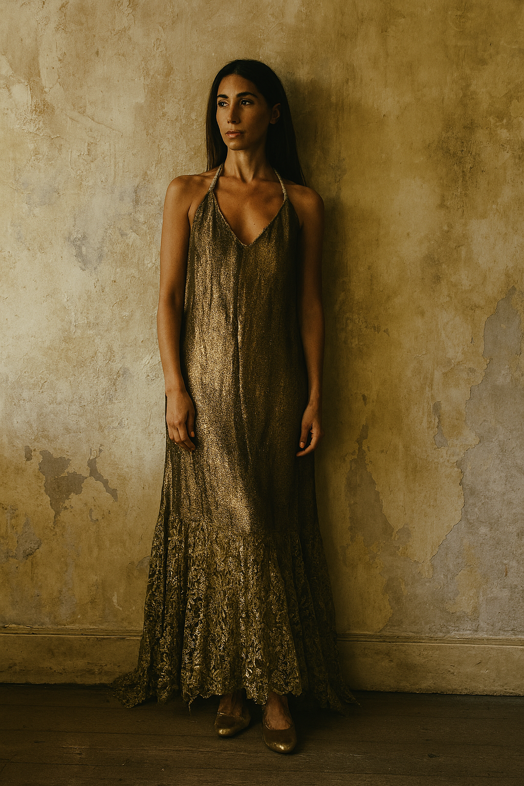 Indulge in luxury with our Amen 20s gold lamé and lace dress. This one-of-a-kind reworked dress features a V-neckline and cross back straps, showcasing the rare and timeless beauty of original 1920s silk lamé and lace. Elevate your style with this unique and elegant piece.