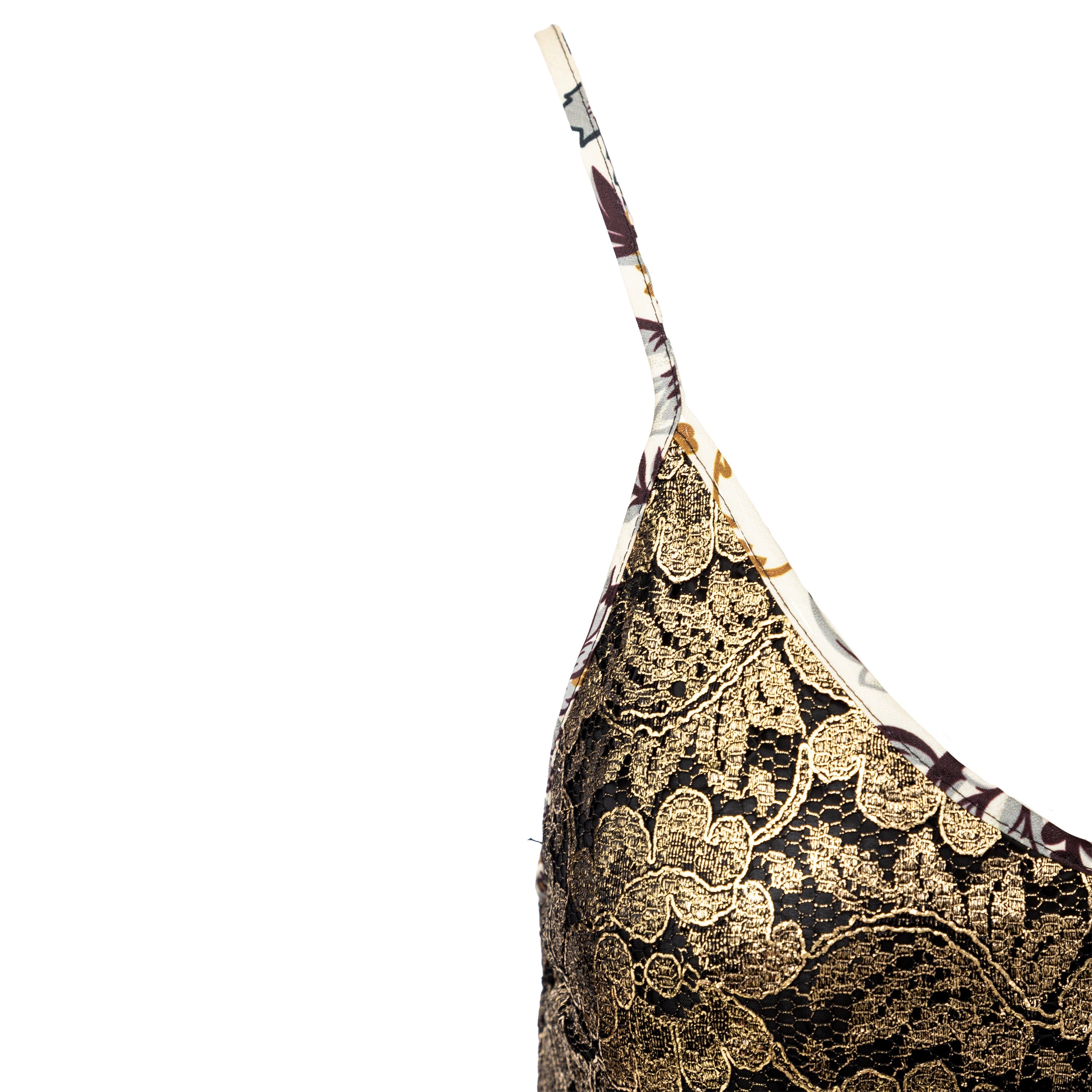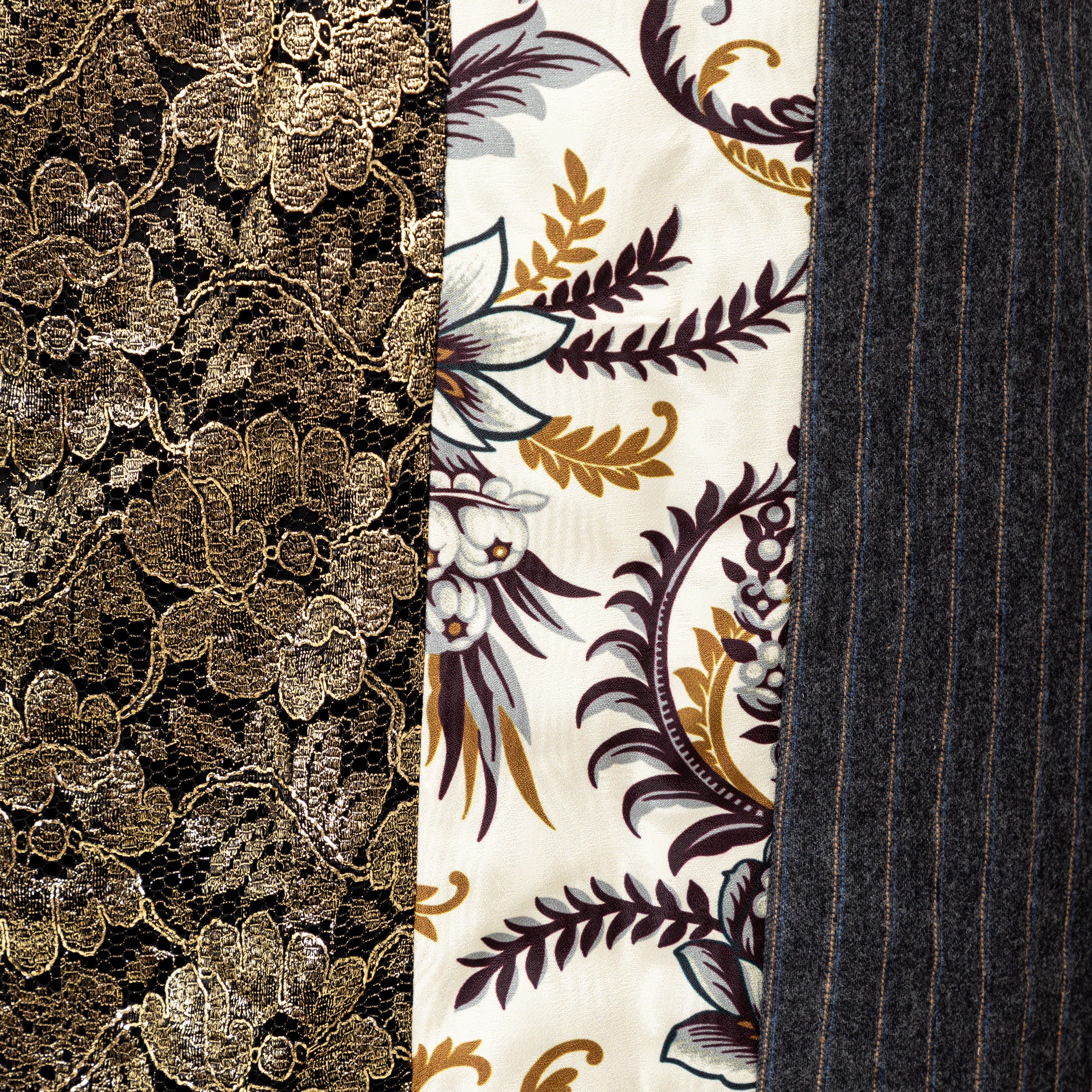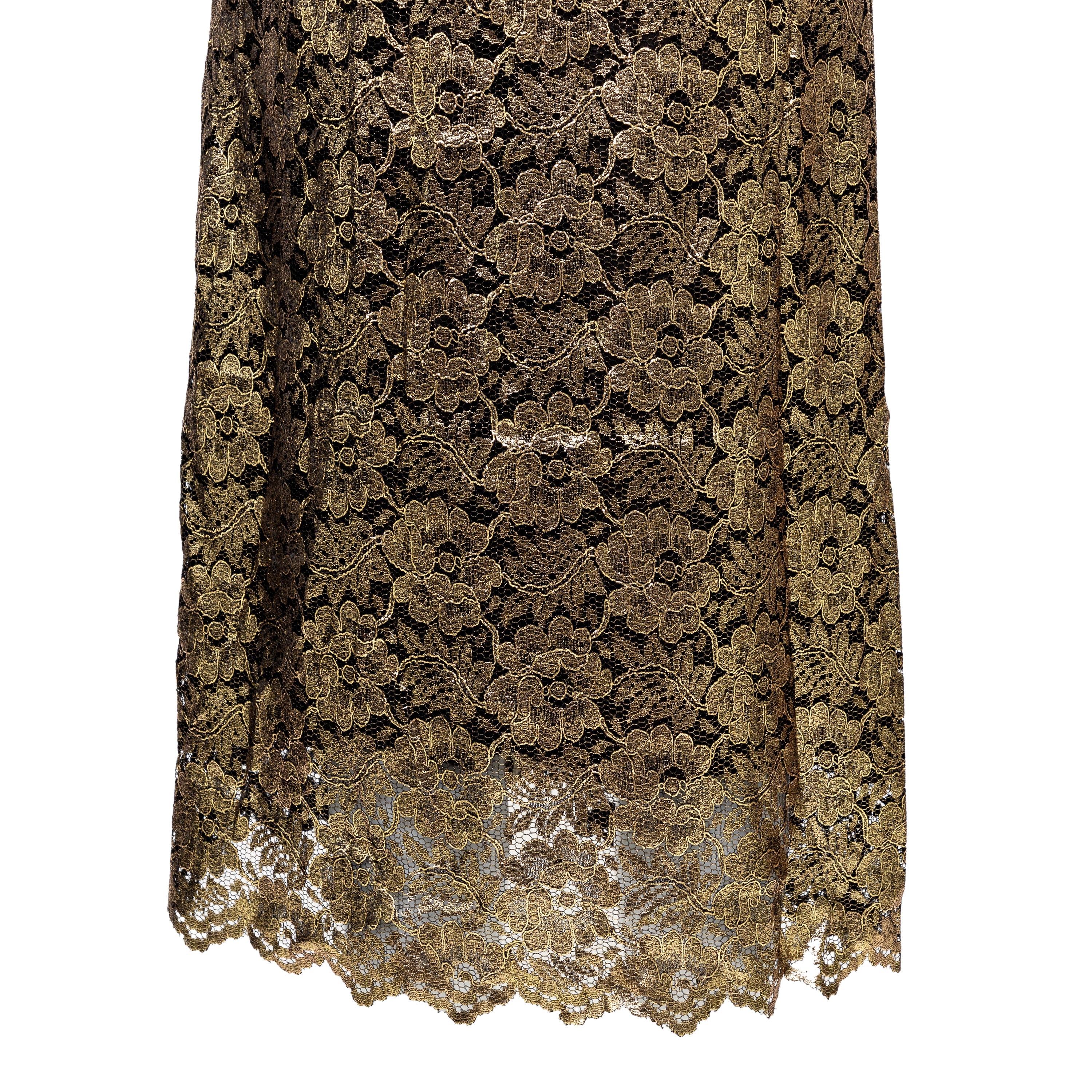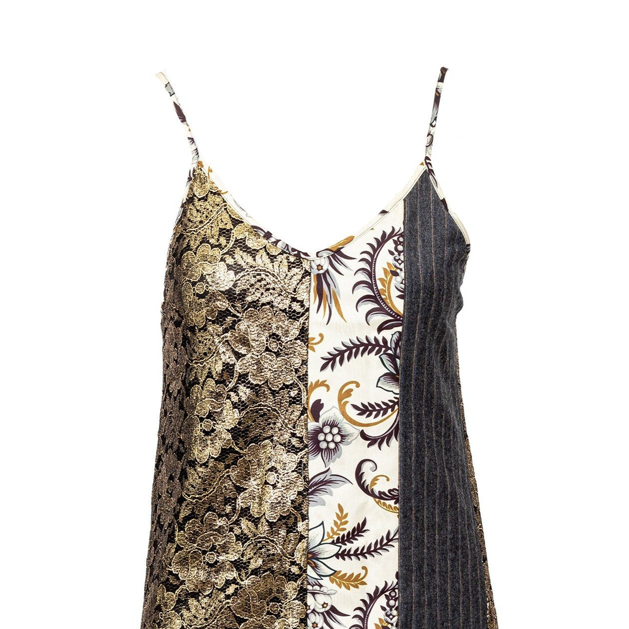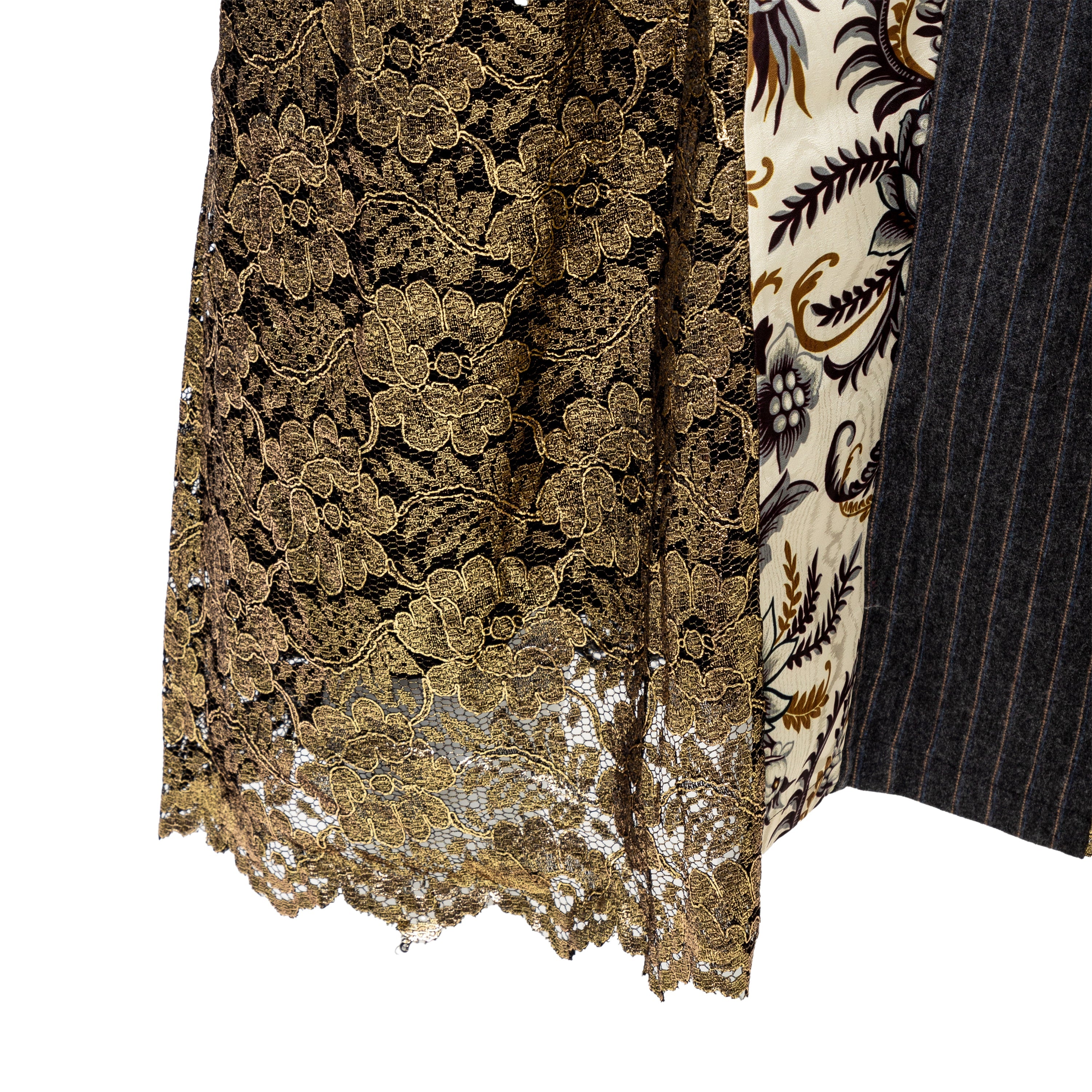 This lace dress by Antonio Marras is crafted from a luxurious blend, featuring bronze tone lace with panels of silk and pinstripe wool fabric. With a flattering scoop neck and scallop hem, this dress is perfect for a polished yet feminine look