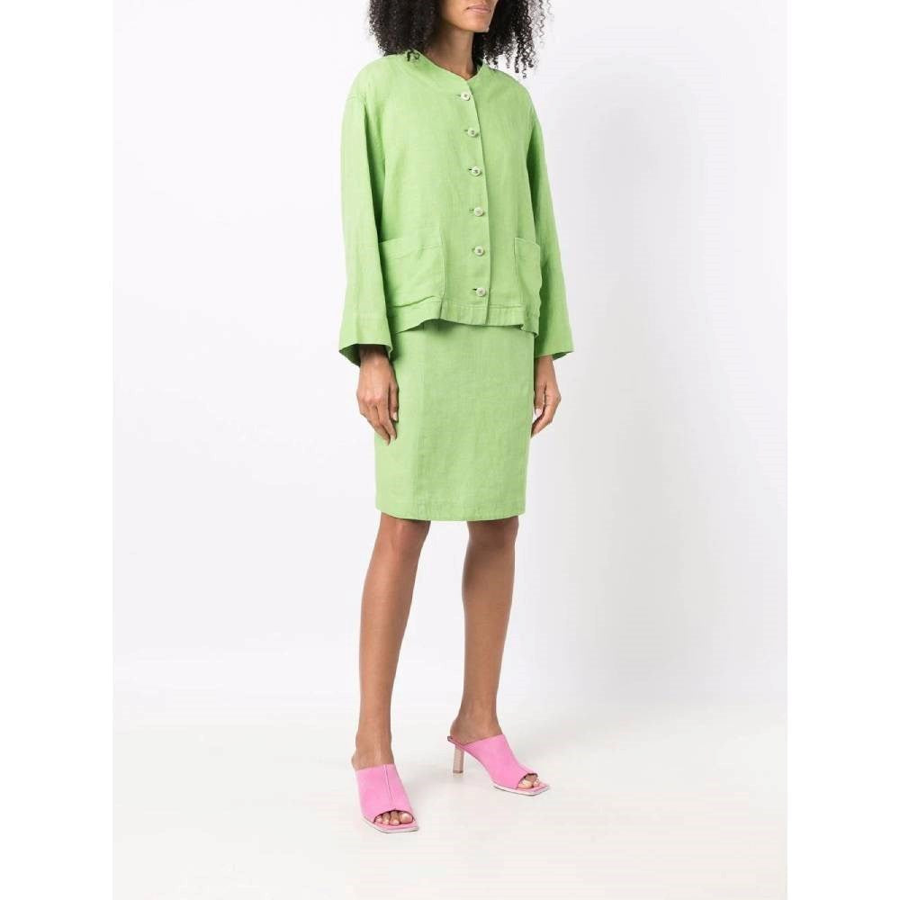 Chanel 90s apple green linen jacket and dress suit. Crewneck jacket, long sleeves, lightly padded shoulders, front buttons fastening and two patch pockets. Knee-length sleeveless dress, straight-cut, slighlty V-neck, rear zip fastening and two buttoned patch pockets on the chest.